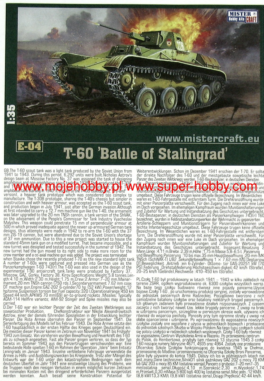 Первые опытные образцы легкого разведывательного танка Т-60 были изготовлены в 1941 году. В этом же году стартовало серийное производство, завершившееся в 1943 году выпуском свыше 6000 экземпляров этого автомобиля. Танк Т-60 оснащался двигателем ГАЗ-202 мощностью 70 л.с. или ГАЗ-203 мощностью 85 л.с. Его основным вооружением была 20-мм автоматическая пушка (размещенная во вращающейся башне), а вспомогательным вооружением одиночный 7,62-мм пулемет ДТ. Танк Т-60 разрабатывался как основной разведывательный танк Красной Армии. Достоинств у него было много: прежде всего высокая маневренность, достойная степень механической надежности и хорошая подвеска. Его главный недостаток очень слабое бронирование объясняется тем, что танк предназначался для разведки. На основе базовой версии было создано несколько производных версий, например: БМ-8-24 самоходная неуправляемая ракетная установка или А-40 КТ танк, приспособленный для полетов на планере! Танк Т-60 широко использовался Красной Армией с конца 1941 по 1945 год, например, в Сталинградской операции 1942-1943 годов или в операции Багратион 1944 года. Примечание: Mistercraft часто меняет наклейки, поставляемые с моделями, без предварительного уведомления, и они могут отличаться от фотографий и описаний на нашем веб-сайте. Если вам нужна конкретная версия, сообщите нам об этом, введя соответствующий комментарий в поле для комментариев при размещении заказа.