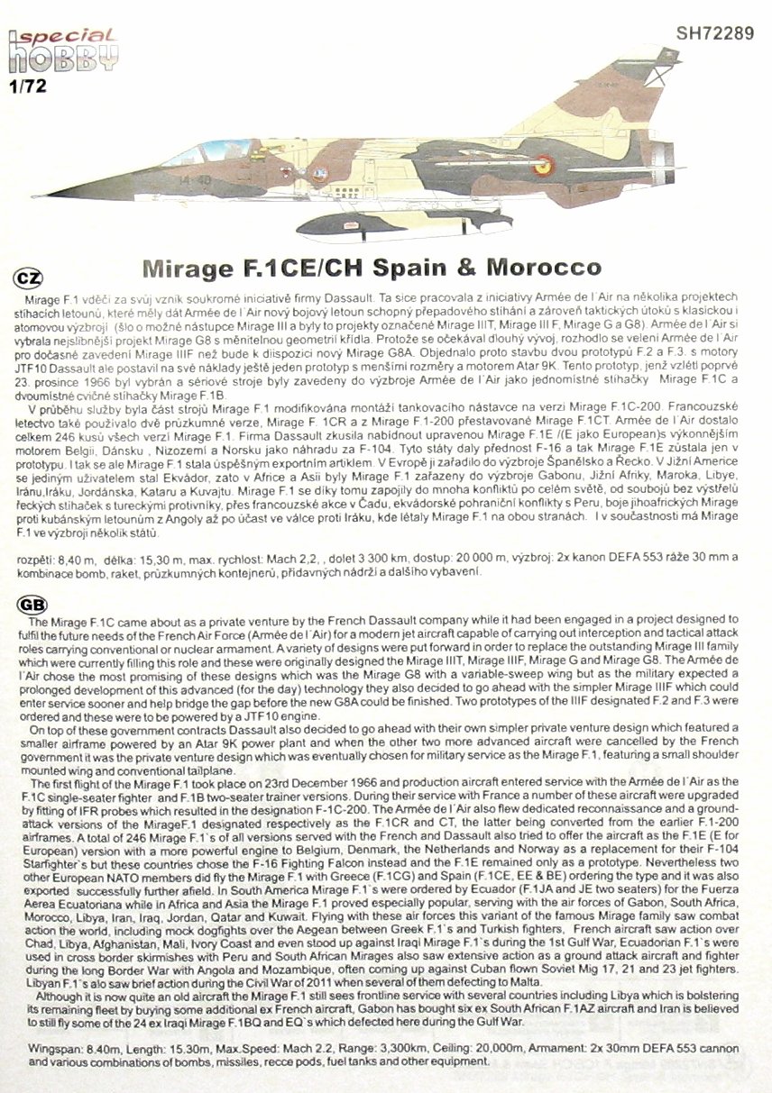 The Dassault Mirage F.1 is a French, single-engine, multi-purpose fighter with a half-shell high wing structure, with wings equipped with slots and lapel pins with a classic tail tip. Mirage F.1 became the heir to the successful Mirage III / V series. The first prototype flew on December 23, 1966. He recorded a number of records - 2.12Ma at an altitude of 11,000 meters and 1,300 km / h at low flight altitudes. The Mirage F.1 required strips of 500 to 800 meters in length for the operation. The new plane had a similar size and lift surface as the Mirage III, but thanks to the use of integral tanks it took up 40% more fuel. The F.1 airplane was characterized by the minimum time necessary for take-off. This was possible by simplifying the operation and allowing the air transport of all necessary ground equipment. The recovery time between operations was 15 minutes. Thanks to the on-board power supply and high-pressure refueling system, the refueling time was only 6 minutes. The Thomson-CSF Cyrano IV radar had 80% greater range than the Cyrano II with MirageIII. When the pilot selected the target manually, the radar automatically followed him. Several main versions of the Mirage F.1 were produced, including F.1C, a classic fighter version, adapted to attack on land targets, introduced into use in 1969. The next version is the F.1B, used as a two-seat school machine (delivered since 1980). Also interesting was the Mirage F.1CT model, i.e. an attack aircraft, the prototype of which appeared in 1991. In total, about 770 copies of all versions were made. It was exported to many countries, including Iraq, South Africa, Greece, Spain and Morocco. Technical data (version F.1C): length: 15.23m, wingspan: 8.4m, height: 4.5m, maximum speed: 2.2Ma, climb speed: 213m / s, maximum range (with overhead tanks): 3300 km, maximum ceiling 2000 m, armament: fixed - two 30 mm DEFA 553 cannons, suspended - up to 4000 kg of cargo.
