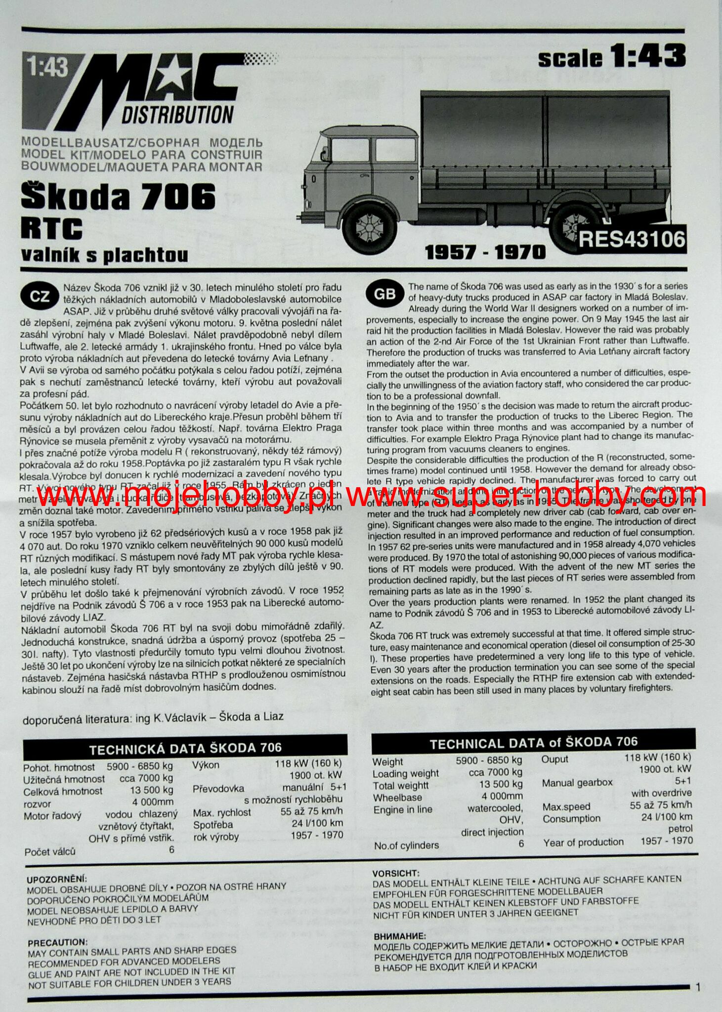 Skoda 706 is the common name of a series of trucks and buses produced by this Czechoslovak, and later Czech, company just before the outbreak of World War II during its course and after its end. The family consisted of several vehicles. Chronologically, the first of them was the Skoda 706 N / ND truck, presented in 1939 and produced - for the needs of the German army - until 1943. The vehicle was very solidly built, it was powered by a 110hp engine, but its performance was rather poor. In 1946 an improved version of the Skoda 706 R entered production, which had many of the features of the 706 N / ND model, but was powered by an engine with a power of 145 HP, which, however, only slightly improved the performance. The Skoda 706 RT and MT trucks were later developed on the basis of this model. On the basis of the Skoda 706 R car, the Skoda 706 RO city and tourist bus was also created, which was the first Czechoslovakian bus produced after 1945! Based on this version, the Skoda 706 RTO bus was created relatively quickly.