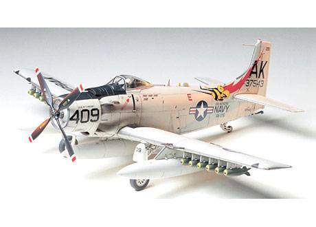 Douglas A-1 Skyraider американский штурмовик, разработанный фирмой Дуглас в 1940-х годах. Считавшийся морально устаревшим в эру реактивной авиации, поршневой Скайрейдер четверть века состоял на вооружении ВВС и ВМС США. С большим успехом применялся в Корейской и Вьетнамской войнах. Скайрейдер был более тяжёлым и менее скоростным, чем современные ему истребители-бомбардировщики P-51 и F4U, однако имел и ряд существенных преимуществ. За счет отказа от второго члена экипажа (стрелка) была существенно повышена боевая нагрузка. Число узлов подвески вооружения было необычно велико (14 подкрыльевых и 1 подфюзеляжный). Помимо этого, Скайрейдер отличался прекрасной манёвренностью, значительными дальностью полёта и временем нахождения в воздухе. Малая скорость позволяла наносить более точные удары. Самолёт имел бронезащиту, значительно повышавшую его боевую живучесть, чем выгодно отличался от более скоростных истребителей, приспособленных для несения бомб, таких как F4U Corsair или P-51 Mustang, выведенных из боевого состава ВВС задолго до 1960-х гг. Несмотря на свою архаичность, A-1 снискал любовь и уважение среди пилотов, о чём свидетельствует множество данных ему прозвищ: Спад (в честь самого массового французского самолёта периода Первой мировой войны SPAD SPAD S.XIII), Сэнди (Sandy, радиопозывной во время Вьетнамской войны), Умный пёс (Able Dog, неофициальная расшифровка аббревиатуры AD), Бешеный азиатский буйвол (Crazy Water Buffalo, прозвище в ВВС Южного Вьетнама), Бродяга (Hobo), Зорро, The Big Gun, старый светлячок, Fat Face (модификация AD-5), Гуппи (модификация AD-5W), Q-птица (модификации AD-1Q/AD-5Q) и летающий мусоровоз (модификация A-1E). Пилотами Королевских ВМС Великобритании была сочинена посвящённая A-1 песня Скайрейдер на взлёт!. Комиссионный товар