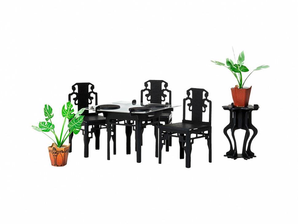 Особую привлекательность придает этому набору прозрачный верх чайного столика, который контрастирует с остальными деталями, выполненными из прочного черного картона. Присутствуют в наборе и несколько стульев. Дополнительно есть два цветочных горшка с зеленью. Яркие зеленые листья украсят и оживят вашу чайную комнату. Набор включает детали, выполненные из картонов различной толщины, а также из высококачественной дизайнерской бумаги. Набор можно рекомендовать взрослым коллекционерам и детям, которые имеют опыт сборки наших игрушек. Коллекционный набор предназначен в первую очередь любителям миниатюр, но его можно аккуратно использовать для игры. Для сборки модели не понадобятся режущие инструменты или клей. Количество деталей - 21 Сложность сборки - 2 Размер - Стул 3 шт - 8.5 х 5 х 4; Стол 1 шт - 8.5 х 6.5 х 8.5. Подставка под цветы 1 шт - 4.5 х 6.5 х 4.5; Цветок в горшке 2 шт-9.5 х 7.5 х 7; Тарелка 3 шт - 2.5 х 0.1 х 2.5 см