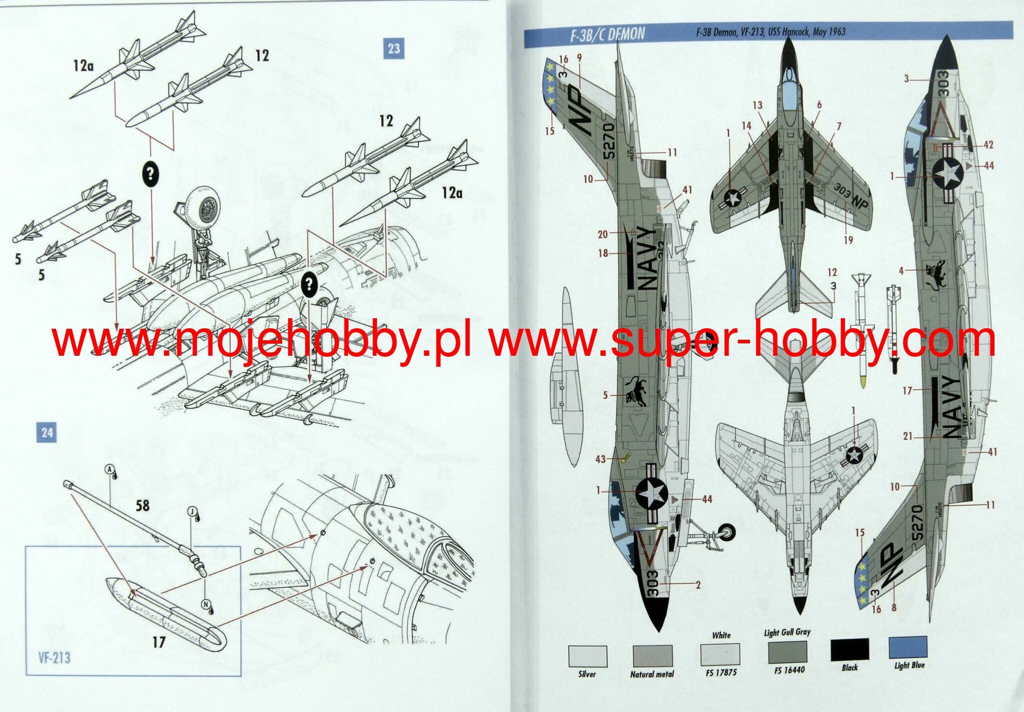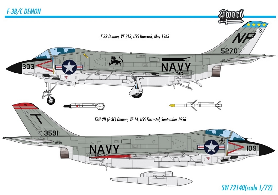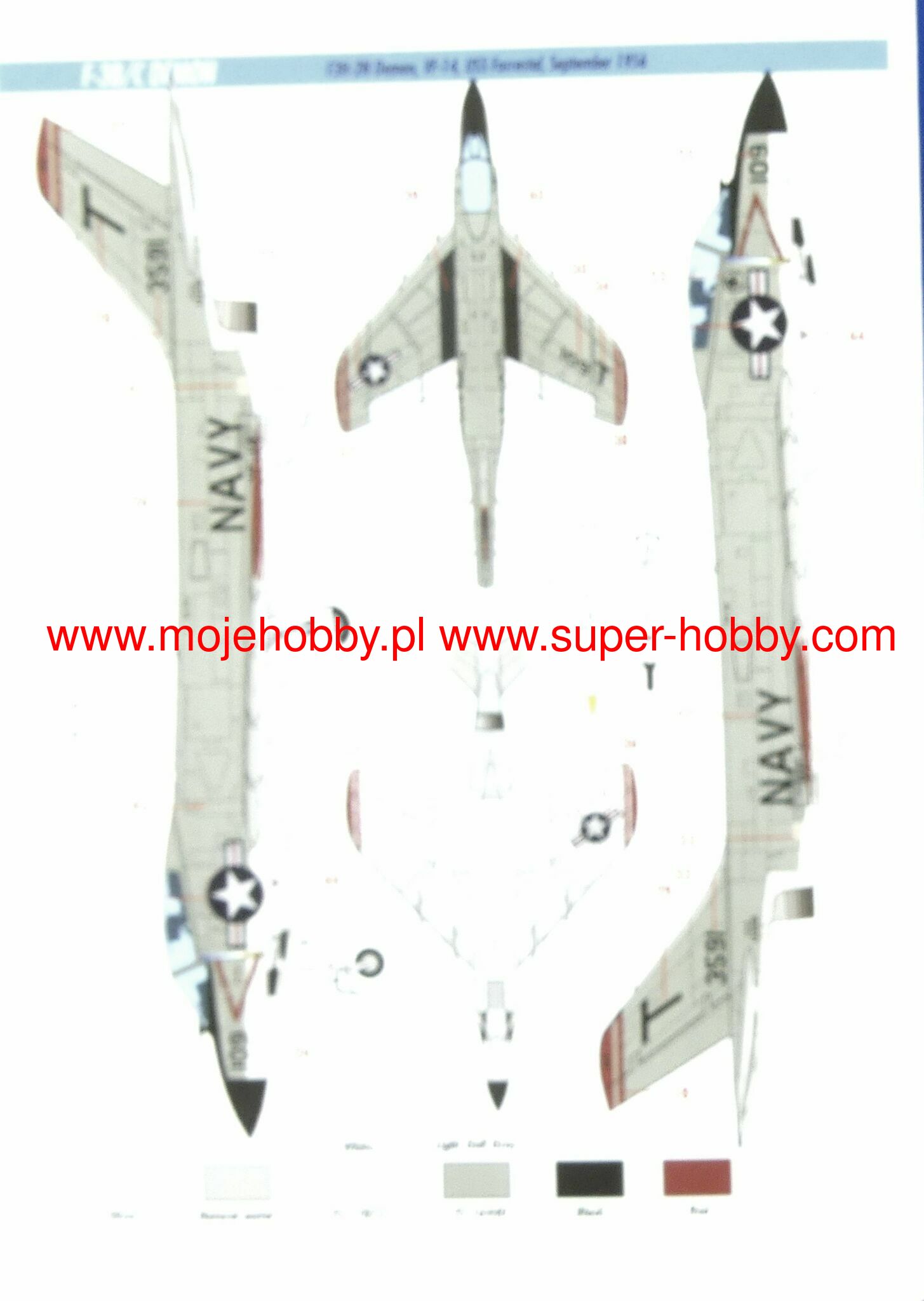 The McDonnell F3H Demon was an American made all-metal fighter plane in the dorsal wing configuration of the Cold War period. The drive was provided in the basic version by a single turbojet engine Westinghouse J-40-WE-22 . The flight of the prototype took place in 1951, and the machine served in the US Navy in 1956-1964. In total, around 520 aircraft of this type were built. The on-board armament consisted of four Colt Mk. 12 cal. 20 mm. The McDonnell F3H Demon was developed for the needs of the US Navy, which in the late 1940s reported a need for a new jet-powered fighter with performance analogous to that achieved by US Air Force machines. The first version of the new fighter was the F3H-1N, which was powered by an engine Westinghouse J-40 - This engine turned out to be completely unsuccessful for this machine, and itself was underdeveloped and unreliable. This led to the creation of the next version: The F3H-2N, which was already powered by the Allison J71 engine. The use of the new engine resulted in the enlargement of the airframe and minor changes in the geometry of the wings. However, the new engine also turned out to be not very successful and did not meet the assumed parameters, but it was less emergency than the Westinghouse engine, which resulted in the implementation of aircraft with this power unit into serial production under the designation F3H-2. Due to the underdeveloped propulsion unit, the McDonnell F3H Demon did not turn out to be a very successful plane and was relatively quickly withdrawn from the line in favor of the F-4 Phantom fighter. McDonnell F3H Demon planes were not exported, they were never used in combat.