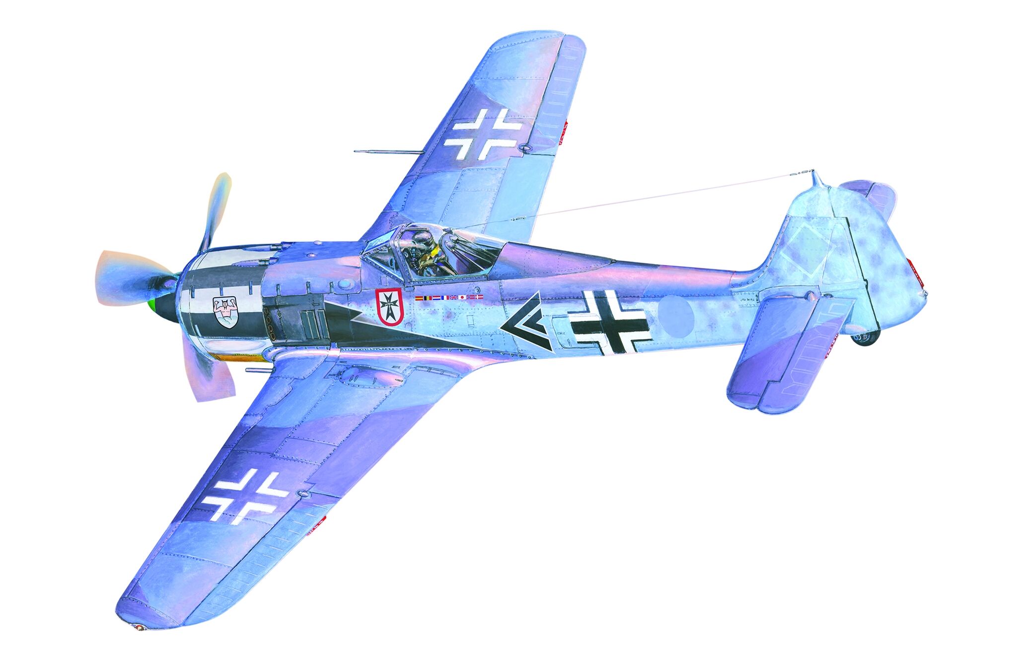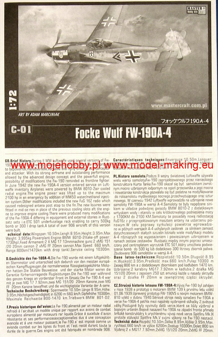 Focke-Wulf Fw-190 немецкий одномоторный цельнометаллический истребитель с крытой кабиной в конструкции низкоплана времен Второй мировой войны. Пилоты считали Fw-190 лучшим самолетом, чем Messerschmitt Bf-109. Отдельно стоящее низкоплан с работающим покрытием Fw-190 было заказано Luftfahrtministerium, собрано осенью 1937 года. Курт Танк представил два предложения по силовым установкам первое с двигателем Daimler-Benz DB 601 жидкостного охлаждения, а второе с новым звездообразным двигателем BMW 139. Был выбран последний, и начатые весной 1938 года работы возглавил Оберинг. Р. Блазер. Первый прототип Fw-190V1 был готов в мае 1939 года, а 1 июня 1939 года капитан Ганс Сандер поднял его в воздух в Бремене. Второй прототип, FW-190V2, вооруженный двумя пулеметами MG131 и двумя пулеметами MG17 калибра 7,92 мм, поднялся в воздух в октябре 1939 года. Чтобы уменьшить аэродинамическое сопротивление, оба были оснащены туннельным воздухозаборником в крышке воздушного винта, но проблемы с перегревом двигателя привели к возврату к проверенной конструкции щитка NACA. Прежде чем окончательно начались испытания этих прототипов, уже было принято решение о замене двигателя BMW 139 на более мощный, но более длинный и тяжелый BMW 810. Это потребовало множества изменений, усиления конструкции и перемещения кабины назад, что впоследствии стало источник проблем с центром тяжести. Преимуществом было снятие проблем с проницаемостью выхлопных газов и перегревом салона из-за его непосредственной близости к двигателю BMW 139. От третьего и четвертого прототипов отказались, а в начале достроили Fw-190V5 с новым двигателем 1940 года. Позже он получил крылья с увеличенным на один метр размахом (с исходных 9,5 м), что сделало его медленнее на 10 км/ч, но зато повысило скороподъемность и улучшило маневренность. Он получил обозначение Fw-190V5g, а вариант с более коротким крылом Fw-190V5k. Первые семь машин информационной серии Fw-190A-0 имели короткое крыло, остальные более длинное. Первая оперативная часть, оснащенная Fw-190 6./JG 26, дислоцированная в Ле-Бурже, заявила о своей оперативной готовности в августе 1941 г., и с первой же встречи нового истребителя с британскими Supermarine Spitfire стало очевидным его преимущество перед ними. Во время войны было создано около дюжины модификаций этого великого самолета. Машины версии А вместе с десятком-другим модернизаций служили истребителями. Версии с маркировкой В и С были лишь прототипами высотных истребителей, предназначенных для борьбы со стратегическими бомбардировщиками, но в серийное производство не поступали. Вариант D, как единственный из Fw-190, был оснащен новым двигателем Jumo 213A мощностью 1750 л.с. и был немецким ответом на P-51 Mustang. Новый двигатель удлинил фюзеляж на несколько десятков сантиметров. Этот вариант также выполнял в основном охотничьи и высотные истребительные задачи. Многочисленные варианты версии F использовались как истребители-бомбардировщики для непосредственной поддержки на поле боя. Версия G играла ту же роль, что и версия F, но имела больший радиус действия. За всю войну было выпущено более 20 000 экземпляров этого одного из лучших истребителей Второй мировой войны. Технические данные (вариант Fw-190A-8): длина: 9м, размах крыла: 10,51м, высота: 3,95м, максимальная скорость: 656км/ч, скороподъемность: 15м/с, максимальная дальность: 800км, максимальный потолок 11410м, вооружение : исправлено - 2 13-мм пулемета MG131 и 4 20-мм пу