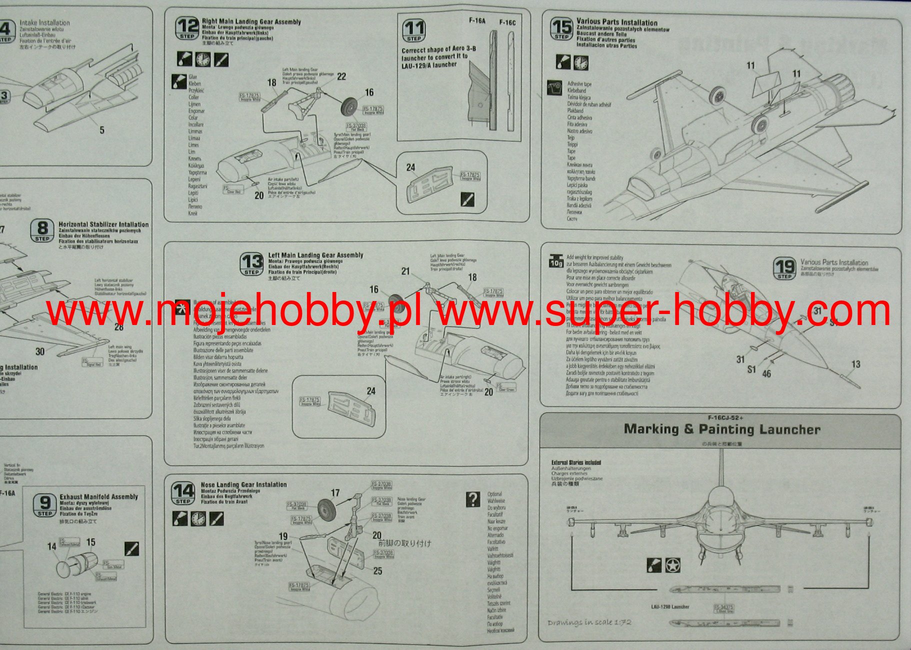Note: Comany Mistercraft frequently changes, without any notice, the decals that come with the model, so they may differ from the photos and descriptions on our website. If you need a specific version, please let us know about that by entering the appropriate notice in the comments field when placing the order. The General-Dynamics F16 Falcon is an American single-engine, multi-role light fighter and stormtrooper. Work on the F-16 project began in 1971 at the General Dynamics concern (which in 1993 was part of the Lockheed Martin giant), entering the competition for a light multi-purpose fighter (LWF) for the US Air Force. The YF-16 prototype first flew on February 2, 1974. A breakthrough in technical terms was the use of a computerized electric fly-by-wire control system, which made it possible to reduce the area of the wings and tail, and thus reduce the weight of the entire aircraft. The F-16 was the first fighter in the world to use such a system. The first versions were to a large extent made of aluminum alloys (about 83% of the total structure), but with time they gave way to composites. The different versions of the F-16 are powered by three versions of the engines: Pratt-Whitney F-100-PW-200, General Electric F110-GE100 and Pratt-Whitney F-100-PW-2020. The "brain" of the guidance system was the APG-66 radar, later replaced by the APG-68 (V) radar. It is worth noting that the YF-16 design turned out to be so successful that it won not only the LWF competition in the USA (in competition with the Northrop YF-17 aircraft), but also won the centenary contract for a multi-role fighter for European NATO countries. His rivals were the Dassault Mirage F.1 and SAAB J-37 Viggen machines. Serial production of the F-16 began in 1975. It was also attended by European NATO countries for which it was an injection of new aviation technologies. Final assembly was performed in the USA, Belgium and the Netherlands. The first serial F-16A Fighting Falcon was flown on August 7, 1978. It is an assault version of the F-16, intended primarily to counter ground targets. The F-16 also proved itself in combat, with a series of air victories in the war in Lebanon (1982) and during the Operation Desert Storm (1991). By the end of the 20th century, more than 4,000 of this successful aircraft had been produced. There were six basic versions of the F-16, marked as A, C, E (single-seater) and B, D, F (two-seater). On the basis of these six models, numerous upgrades are created, most often associated with the replacement of avionics, marked as "Block". Since 2006, the F-16 also serves in the Polish aviation. The Polish Ministry of Defense decided that the F-16 would be the backbone of the modernized air force, rejecting offers from Dessault and SAAB, although in this case they were Mirrage F2000 and JAS-39 Grippen fighters. Undoubtedly, the highest sum proposed by the American company as part of the so-called offset transaction. Technical data: Maximum speed: 2,170 km / h, rate of climb: 254 m / s, maximum ceiling 15240m, maximum range: 3890km, armament: fixed - one 20mm six-barrel M61A-1 cannon, suspended - up to 9275 kg of cargo.