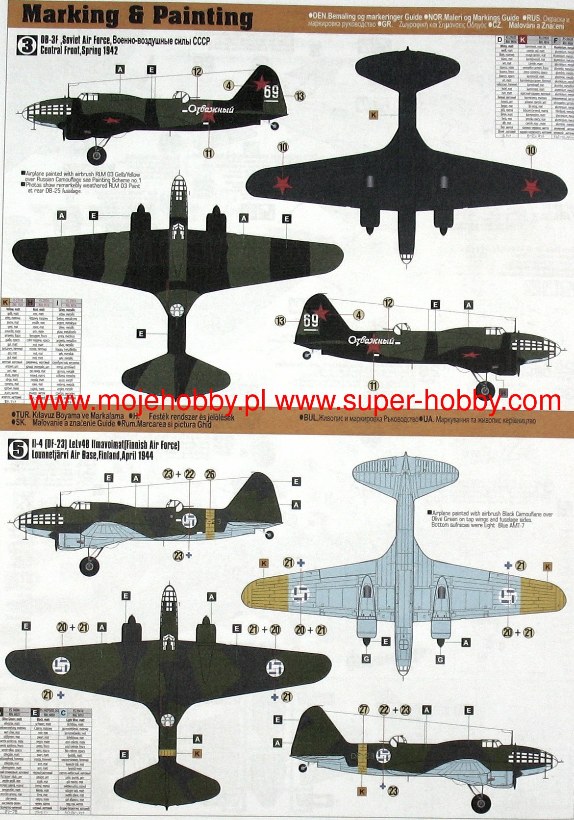 Ilyushin Ił-4 (DB-3F) is a Soviet, twin-engine, low-wing medium bomber from the Second World War. The Il-4 was a far-reaching modernization of the DB-3 aircraft. The changes concerned, inter alia, the structure of the airframe and wing and, above all, the use of duralumin instead of steel on a much larger scale. The flight of the Il-4 machine took place in 1940, and it entered service a year later. Serial production continued until 1944. In its course, there were also further improvements - self-sealing fuel tanks, the use of protective weapons with a larger caliber, and above all the use of Tumanski M-88B 14-cylinder engines with a capacity of 1100 HP, in place of the Tumanski M-88 engines with a capacity of 1000 HP. Ilyushin Il-4 was the primary medium bomber of the Soviet Air Force throughout the war. It was used in many operations on the Eastern Front, especially in the period 1942-1943, as well as in several propaganda bombing raids over Berlin. The Il-4T aircraft was also used as a long-range torpedo bomber. About 5256 copies of this machine were produced globally. Technical data: length: 14.76m, wingspan: 21.44m, height: 4.1m, maximum speed: 410km / h, rate of climb: 6.9m / s, maximum range: 3800km, maximum ceiling 8700m, armament (early production series): fixed - three 7.62 mm SzKAS machine guns, suspended - up to 2700 kg of bombs. Note: Comany Mistercraft frequently changes, without any notice, the decals that come with the model, so they may differ from the photos and descriptions on our website. If you need a specific version, please let us know about that by entering the appropriate notice in the comments field when placing the order.