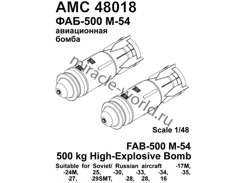 AM AMC 48018 ФАБ-500 М-54 (4ШТ.) /ФУГАСНАЯ АВИАБОМБА КАЛИБРА 500КГ./ 1/48 (1/48) продается в 2 магазинах. Выберите подходящий Вам интернет-магазин и перейдите по ссылке «В магазин».