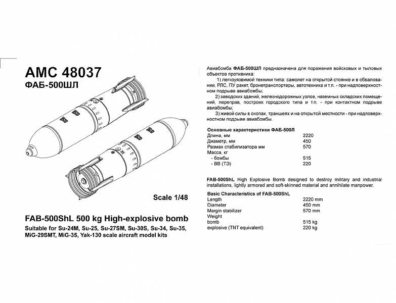Описание ОФАБ-500 ШЛ, осколочно-фугасная авиабомба калибра 500 кг
