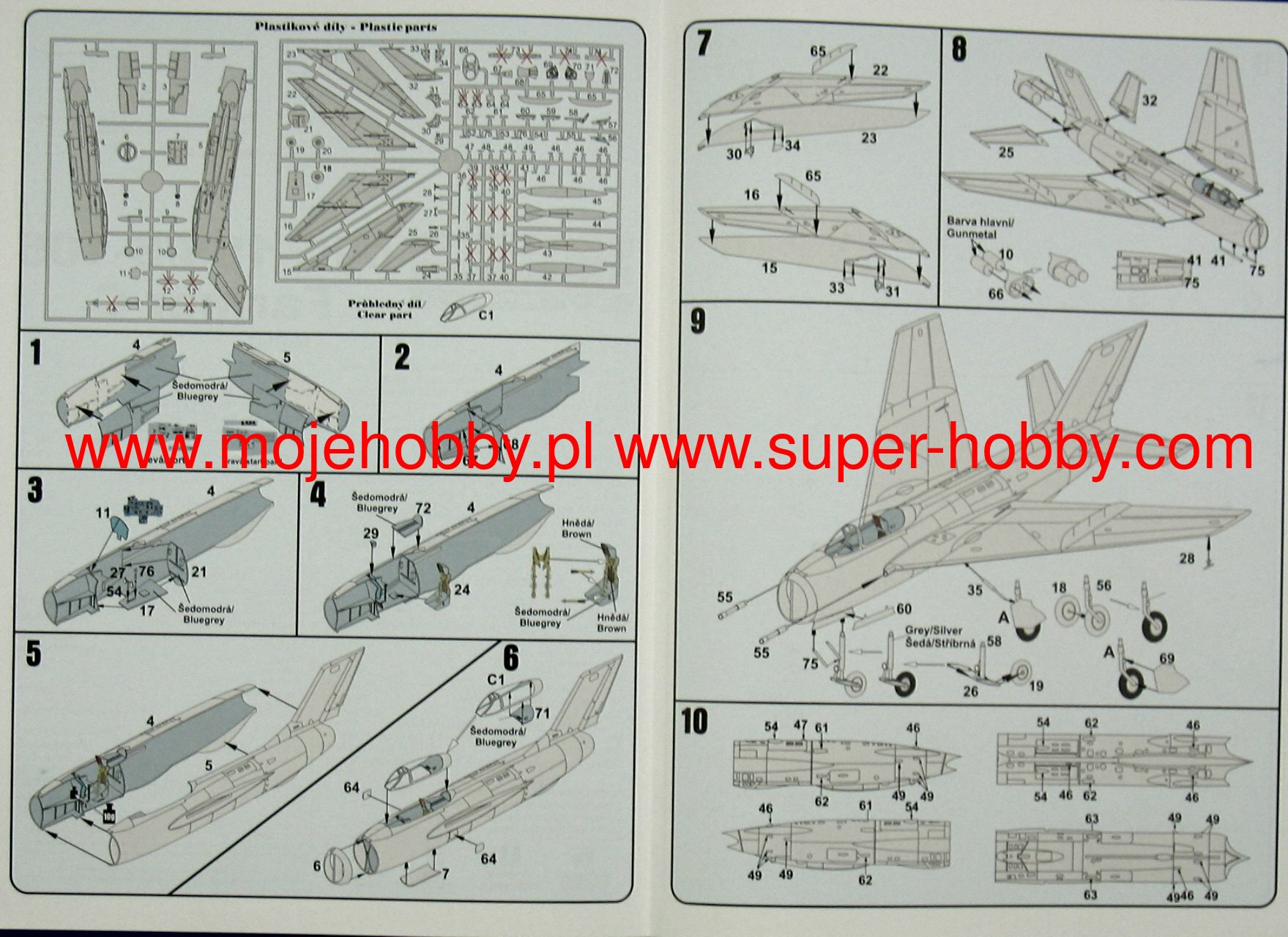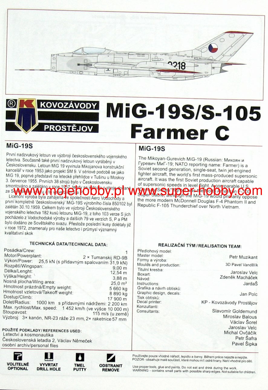 The Mikojan-Guriewicz MIG-19 built in the early 1950s was the first mass-produced supersonic fighter plane. The experience gained in the design and implementation of new technologies in this aircraft has greatly helped the constructors in the construction of the next versions of the MiG aircraft. The MiG-19 in serial production was marked with the symbol SM. The SM-9/1, flown on January 5, 1954, became a direct model for the serial MiG-19. The plane did not yet have a plate horizontal tail. Therefore, the first series of MiG-19 planes had a classic tail. The MiG-19 flight tests with a plate tail continued throughout 1955. Soon after, the serial production of the MiG-19S aircraft, derived from the SM-9/3 prototype, began. Airplanes for various purposes come directly from it. Built in 1956, the MiG-19SW high-altitude fighter. MiG-19R reconnaissance aircraft and a short series of MiG-19SF aircraft reaching speeds of 1560 km / h. The second development line consists of airplanes built on the basis of the SM-7 prototype, equipped with the RP-5 radar on-board station. New interceptors have been developed. The SM-7/2 prototype turned into the MiG-19P aircraft, then the MiG-19PF and the MiG-19PG with the "Gorizont-1" station were built (it was used to guide the aircraft at the target according to the ground command point). In a short series, the MiG-19PU plane with additional rocket accelerators was built. The SM-7 / 2M prototype, equipped with the RP-2U radar station and armed with 4 RS-2U (K-5) guided missiles, was manufactured under the designation MiG-19PM. A variant of the MiG-19PM aircraft was equipped with the MiG-19PMŁ telemetry device "Łazur". MiG-19 planes were used in the Warsaw Pact countries: the USSR, Bulgaria, Czechoslovakia, East Germany, Poland, Romania and Hungary, as well as in China, Egypt, Indonesia, Iraq, Pakistan, Syria and Cuba. The production of the aircraft was started in Czechoslovakia (MiG-19S as S-105) and in China, where the planes were initially produced under the license under the designation J-6, and then their own designs were developed on their basis. Technical data: length: 12.54m, wingspan: 9m, height: 3.9m, maximum speed: 1455km / h, speed of climb: 180m / s, maximum range: 1390km, maximum ceiling 17500m, armament: permanent - 3 cannons NR -30 caliber 30 mm, suspended - the most common were 4 Vympel K-13 air-to-air missiles.