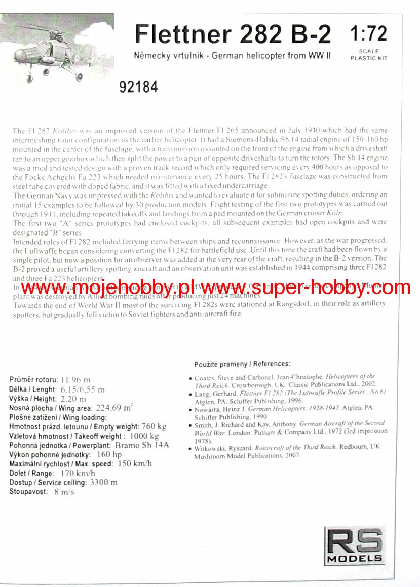 The Flettner Fl 282 Kolibri was a German WW2 fixed landing gear helicopter with two intermeshing rotors and no propeller on the tail boom. The drive was provided by a single Bramo Sh14A radial engine with 160 HP. The flight of the prototype took place in 1941, and serial production continued in 1941-1943. In total, about 20-25 helicopters of this type were built. The machine did not have a permanent on-board armament. The Flettner Fl 282 was the first mass-produced helicopter in the history of aviation and the first helicopter in history used in combat operations. The Fl 282 was commissioned by the Kriegsmarine, which needed a light machine for reconnaissance and patrol flights, but the Wehrmacht also quickly expressed interest in the helicopter. In the course of serial production, two main development versions were created: Fl 282 A-1 (single-seat sea reconnaissance helicopter), Fl 282 (two-seat land liaison and reconnaissance helicopter). It was also planned to create a version of the Fl 282 A-2, which had an opera from submarines. The Flettner Fl 282 entered service in 1942 - in Kriegsmarine it served primarily in the basins of the Baltic and Mediterranean Seas, while in the land forces it fought mainly on the Eastern Front, for example, a few examples took part in the Berlin operation in April-May 1945. In 1945, single copies of Flettner Fl 282 were intercepted by the Americans and the Russians.