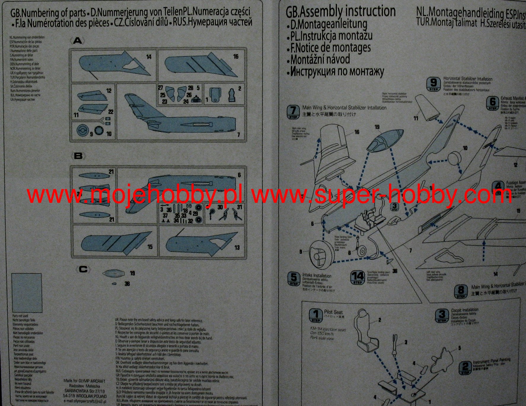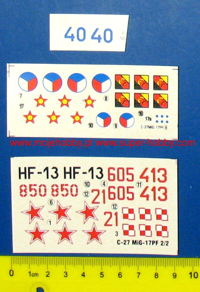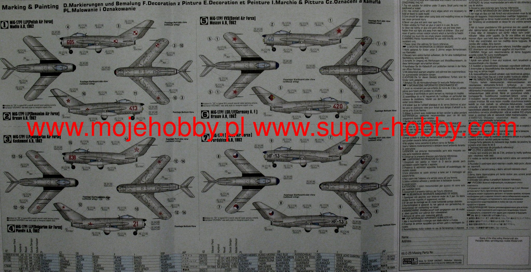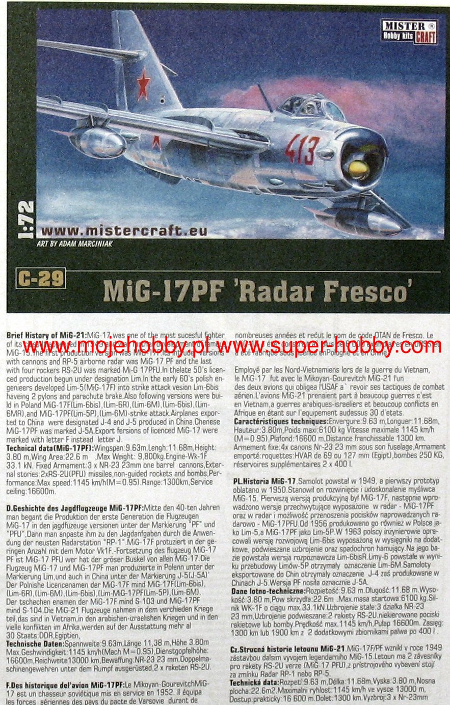 Mikojan-Guriewicz MIG-17 советский одномоторный реактивный истребитель со средним расположением крыла, наклонным крылом и классическим хвостовым оперением, известный в коде НАТО как Fresco. Полет прототипа состоялся в январе 1950 года. МиГ-17 был продолжением конструкции МиГ-15. Изменения были сосредоточены на новом двигателе (Климов WK-1F), улучшенной аэродинамике и использовании радара на одной из версий разработки. Было создано несколько базовых модификаций этого самолета. Первая серийная версия МиГ-17Ф. Еще одним, оснащенным РЛС, был МиГ-17ПФ, а вариант МиГ-17ПФУ имел возможность наведения ракет с помощью бортовой РЛС. Самолет также выпускался по лицензии мин. в Польше и Китае. В Польше серийное производство началось в 1956 году под обозначением Lim-5, также создавался штурмовой вариант (Lim-6bis). Самолеты МИГ-17 до сих пор используются в авиации Мали и Северной Кореи. Технические данные (версия МИГ-17Ф): длина: 11,26м, размах крыла: 9,63м, высота: 3,8м, максимальная скорость: 1145км/ч, скороподъемность: 65м/с, максимальная дальность: 2060км, максимальный потолок 16600м, вооружение: стационарные - 2 пушки Нудельмана-Рихтера НР-23 калибра 23 м и 1 пушка Нудельмана Н-37 калибра 37 мм, подвесные - до 500 кг бомб и реактивных снарядов.Примечание: Mistercraft часто меняет наклейки, поставляемые с моделями, без предварительного уведомления, и они могут отличаться от фотографий и описаний на нашем веб-сайте. Если вам нужна конкретная версия, сообщите нам об этом, введя соответствующий комментарий в поле для комментариев при размещении заказа.