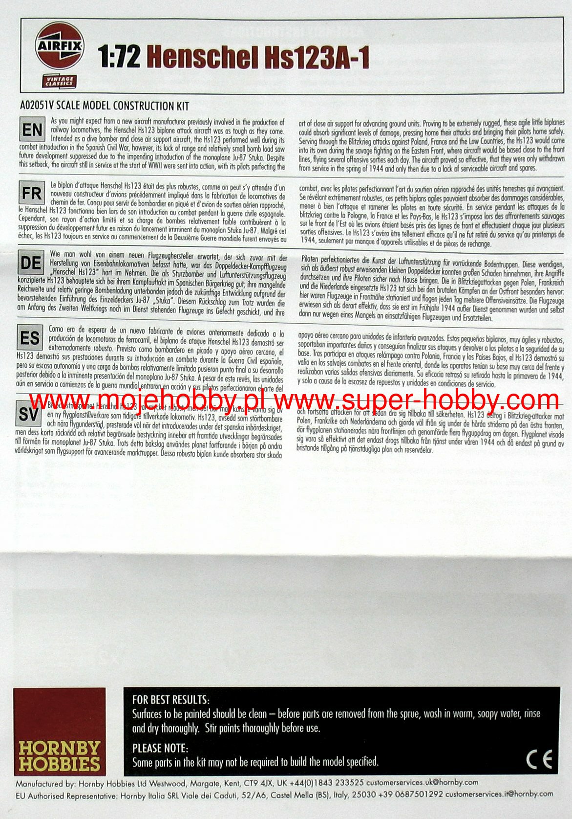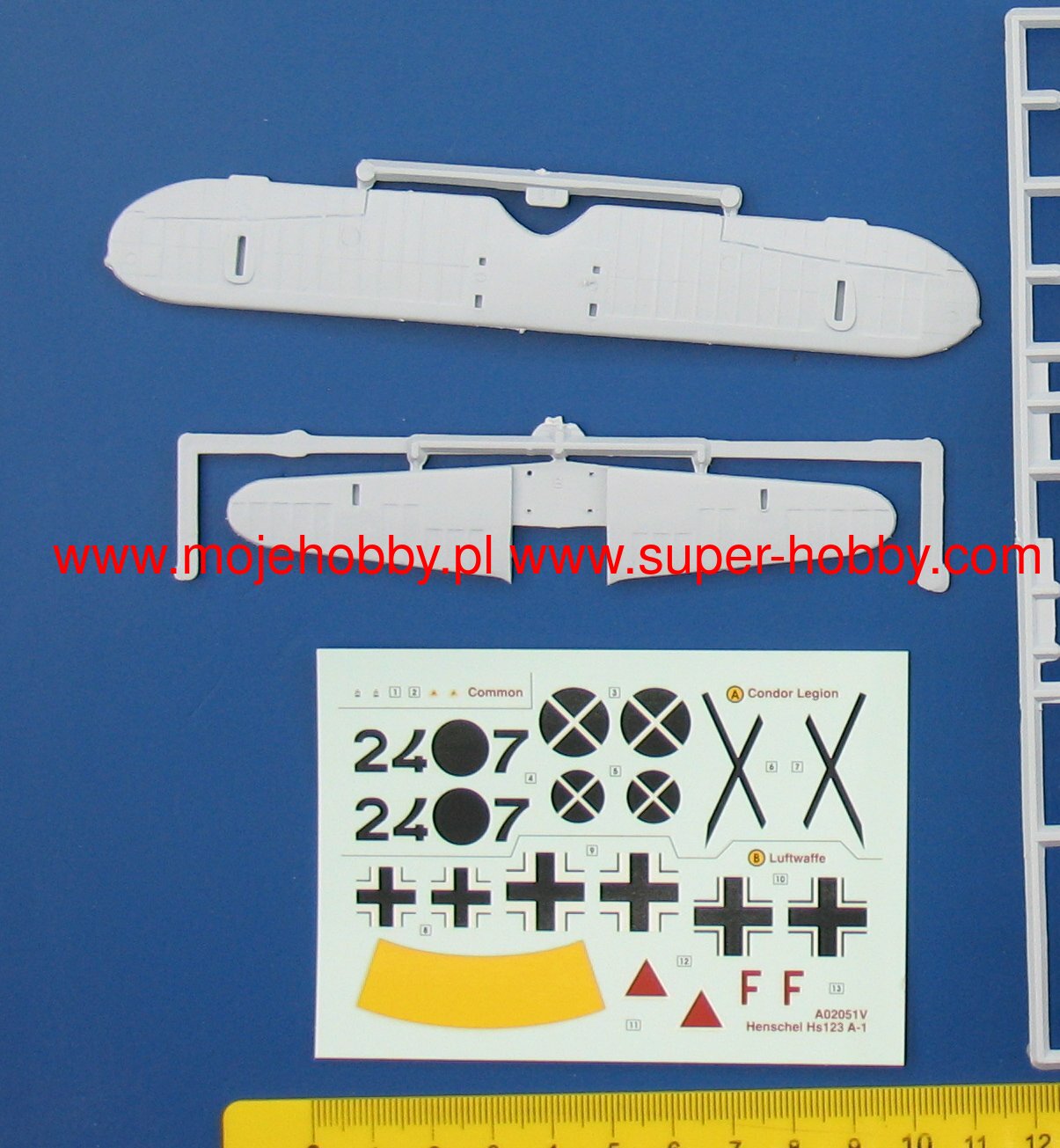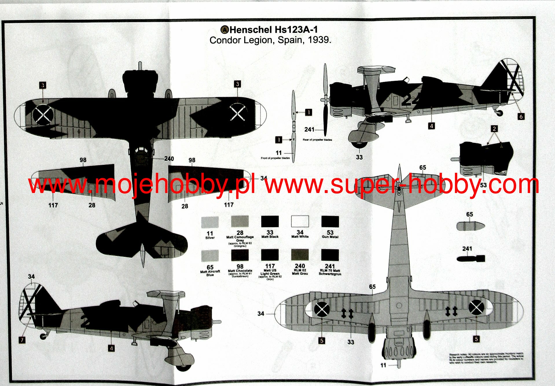 The Henschel Hs123 is a German early WWII single-engine biplane and dive bomber. The flight of the prototype took place on May 8, 1935, and from 1936 the plane entered the line service. Despite the backwardness of the structure at the outbreak of the war, it was used until 1944. The plane performed very well during the Spanish Civil War (1936-1939), where it served as a classic stormtrooper. However, the development of the design was stopped due to the entry into mass production of the Ju-87 Stuka. Hs123 also fought during the Polish campaign and in the West in 1940. It was also used on a small scale on the Eastern Front, where the last serial copies were destroyed, out of 255 produced. A 9-cylinder BMW 132 Dc star engine with 880HP was used as the drive. Technical data: length: 8.33 m, wingspan: 10.5 m, height: 3.2 m, maximum speed: 341 km / h, maximum range: 860 km, maximum ceiling 9000 m, armament: 2 MG17 cal.7 machine guns, 92mm, suspended - up to 450kg bombs.