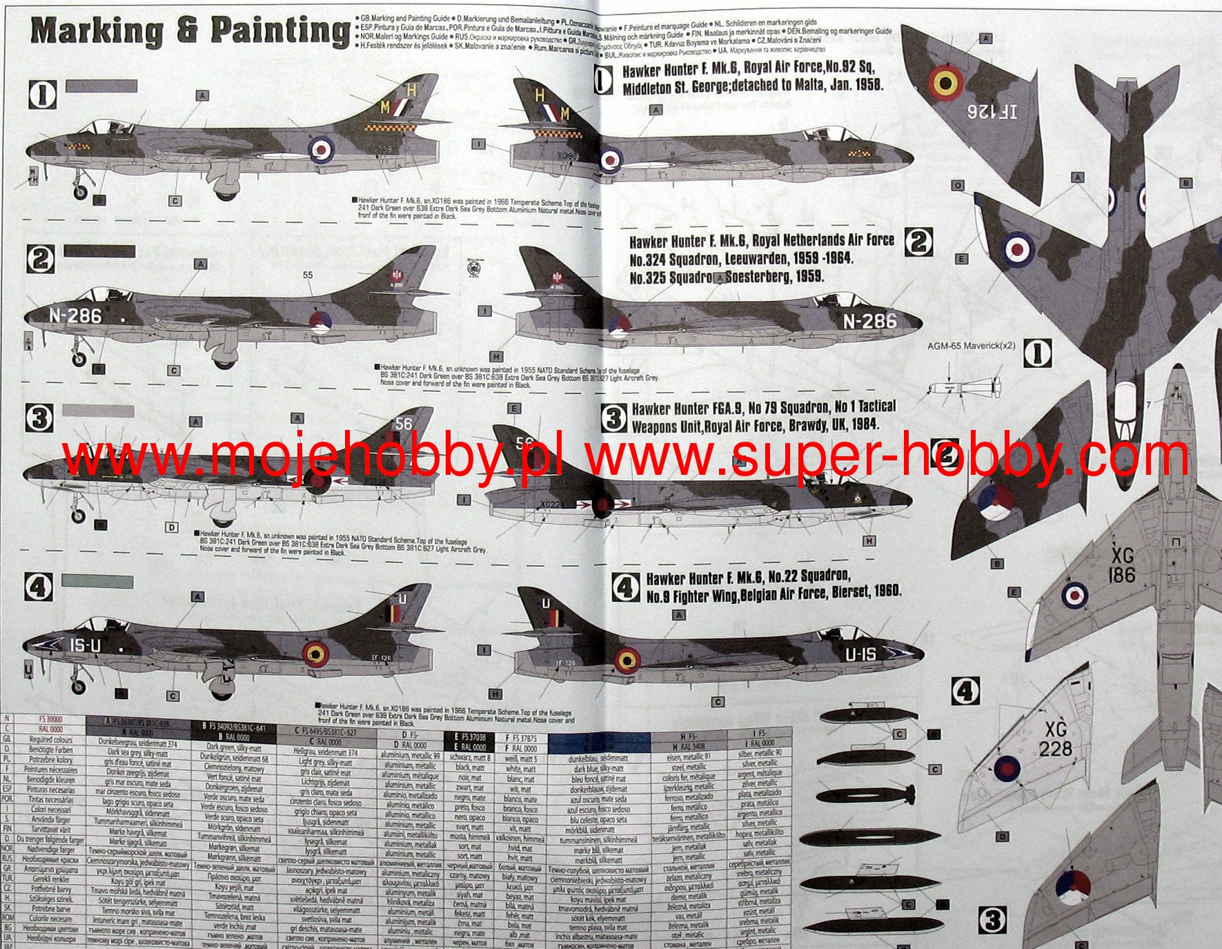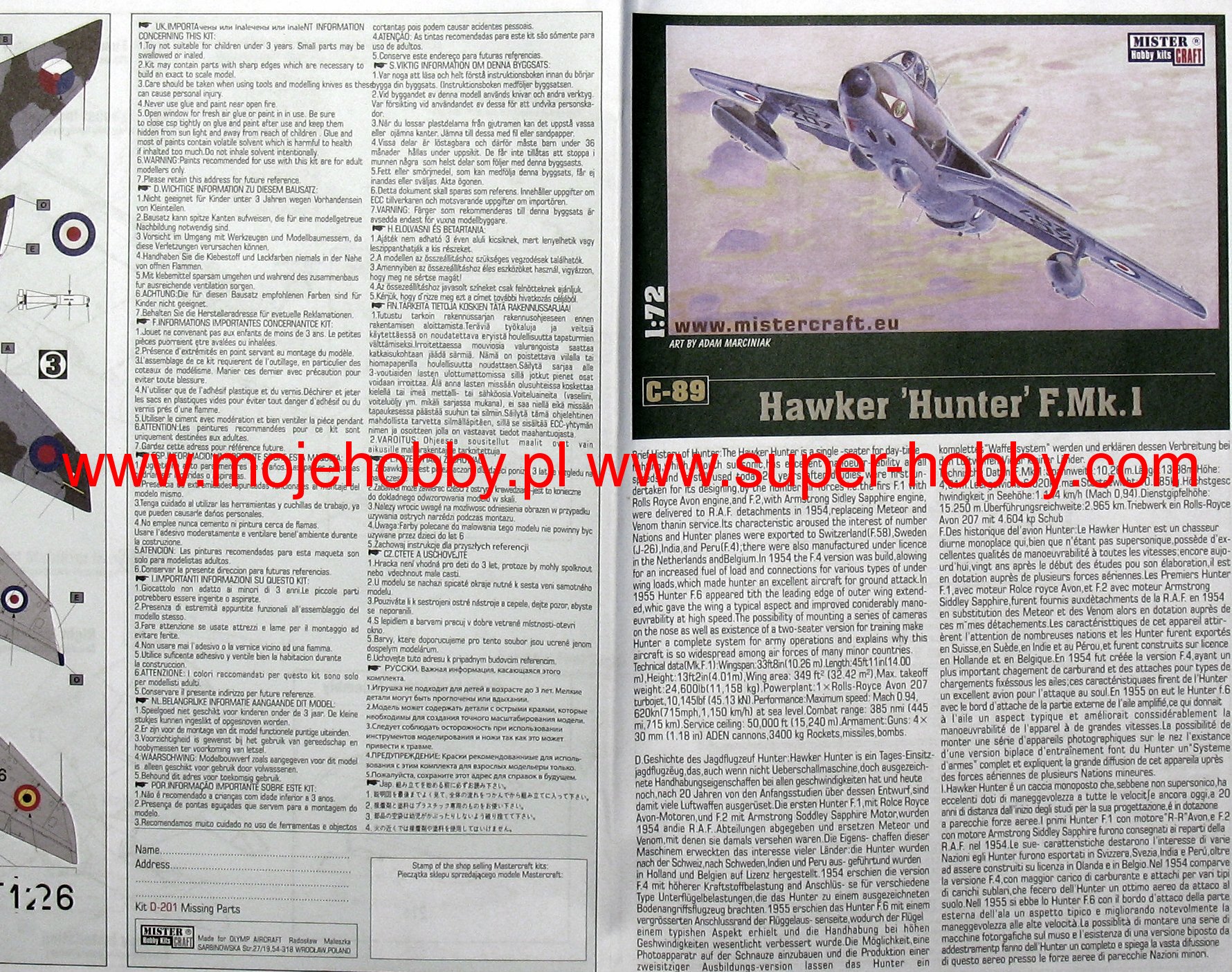 Note: Comany Mistercraft frequently changes, without any notice, the decals that come with the model, so they may differ from the photos and descriptions on our website. If you need a specific version, please let us know about that by entering the appropriate notice in the comments field when placing the order. The Hawker Hunter was one of the most successful and most widespread fighters of the 1950s. It was designed by British constructor Sir Sydney Camm in 1948 as a day fighter, successor to the Gloster Meteor. The first prototype flew in July 1951, while the first machine in the F.1 production series entered service exactly three years later. The Hunter FGA.9 was a version adapted to carry out attacks against ground targets, also equipped with the more powerful Rolls-Royce Avon 207 engine, instead of the Avon 203 from the F.6 model, and thus with a better payload and range. The changes also included redesigning and strengthening the wings. A total of almost 2,000 Hawker Hunter machines of all types were built, of which about 700 were then resold to foreign recipients after decommissioning. Belgium, Sweden, Peru and India. The Hawker Hunter machine was involved in, among others. in the Suez Crisis in 1956, in the Second Kashmir War (1965) and in the Bangladeshi War of Independence in 1971. Technical data (Hunter F.6 version): length: 14m, wingspan: 10.26m, height: 4.01m, maximum speed: 1150km / h, rate of climb: 87.4m / s, maximum range with overhead tanks: 3060km , maximum ceiling 15240m, armament: fixed - 4 30mm ADEN cannons, suspended - up to 3400 kg of cargo.
