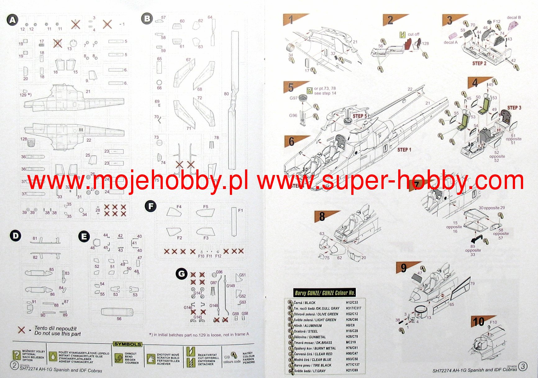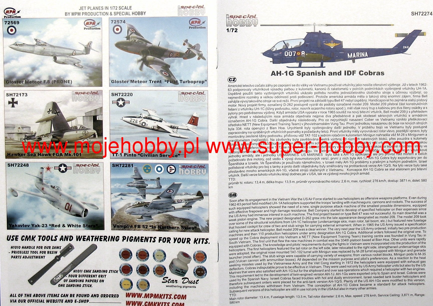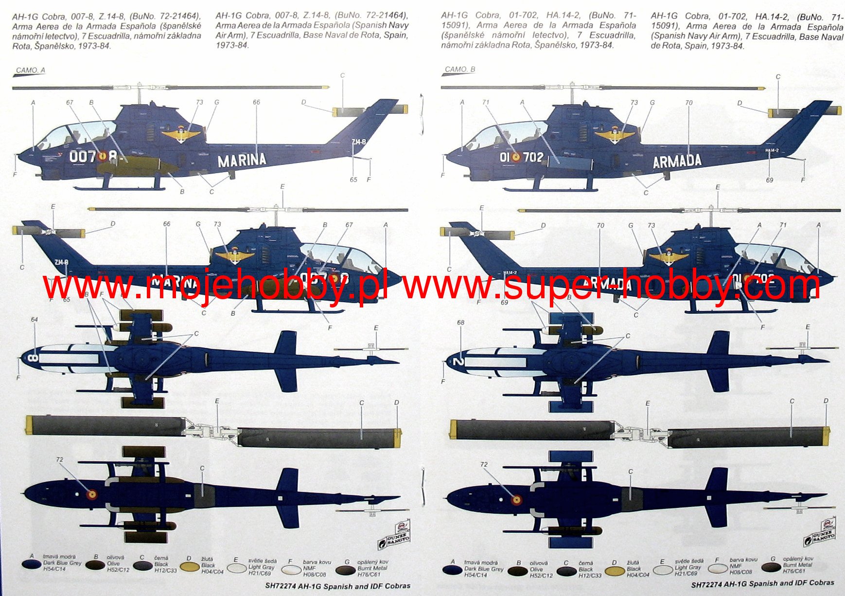 Helikopter AH-1 Cobra (Bell 209) to migłowiec szturmowy w układzie klasycznym, wykorzystujšcym bardzo wiele podzespołów swego starszego brata UH-1 Huey. Pierwszy lot prototypu AH-1 miał miejsce 7 wrzenia 1965 i w tym samym roku migłowiec wszedł do produkcji seryjnej. W czasie wojny wietnamskiej wyprodukowano 1126 maszyn modelu G, z których utracono w walce 279. Ze względu na bardzo wysokš niezawodnoć konstrukcji, niewielki profil boczny oraz dobre osišgi migłowiec pozostaje w służbie do dnia dzisiejszego w Korpusie Piechoty Morskiej Stanów Zjednoczonych. AH-1 pozwolił armii USA w pełni realizować teoretyczne założenie piechoty aeromobilnej (kawaleria powietrzna), poprzez wsparcie ogniowe lšdujšcych jednostek piechoty. W dniu dzisiejszym AH-1 Cobra jest wykorzystywany przede wszystkim przeciwko celon opancerzonym. Od 1965 powstało kilka wersji tego udanego migłowca min.: AH-1G (wersja podstawowa), AH-1J (wersja dwu-silnikowa), AH-1Q (wersja uzbrojona w rakiety TOW). Dane techniczne: Prędkoć maksymalna: 333 km/h; zasięg maksymalny (zależnie od wersji): 507-574km, uzbrojenie: stałe-1 działko trzylufowe M197 kal.20mm, podwieszane-rakiety, pociski kierowane pociski niekierowane i zasobniki z działkami. Co oprócz modelu będę potrzebować do jego sklejenia?
