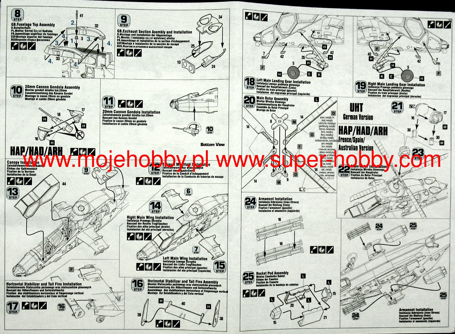 Note: Comany Mistercraft frequently changes, without any notice, the decals that come with the model, so they may differ from the photos and descriptions on our website. If you need a specific version, please let us know about that by entering the appropriate notice in the comments field when placing the order. Eurocopter Tiger is a twin-engine attack helicopter of German, Spanish and Italian production, with a metal structure in a classic arrangement with a main rotor and a tail rotor on the beam. In the basic version, the drive is provided by two Rolls-Royce / MTU 390 engines with 1183 HP each. The flight of the first prototype took place in 1991, and serial production, which only started in 2002, is still ongoing. At present (2017), it is estimated that approx. 100 copies of this helicopter have been produced. The Eurocopter Tiger was created in response to a competition announced in 1984 by the French and German Ministry of Defense for a new attack helicopter for the armies of both countries. In order to reduce costs, a consortium of Aerospatiale and MBB was established. In the course of serial production, four specialized development versions were created, produced in - so far - in relatively short batches. One of them is the UHT version used by the German army as an anti-tank helicopter. Interestingly - this version does not have a plot. Another is the version of the HAP used by the armies of France and Spain as a close support and escort helicopter. In general, all versions of the Eurocopter Tiger are very similar to each other and differ mainly in their weapons and avionics. Eurocopter Tiger have been used in combat in Afghanistan by France, Germany and Spain since 2009.