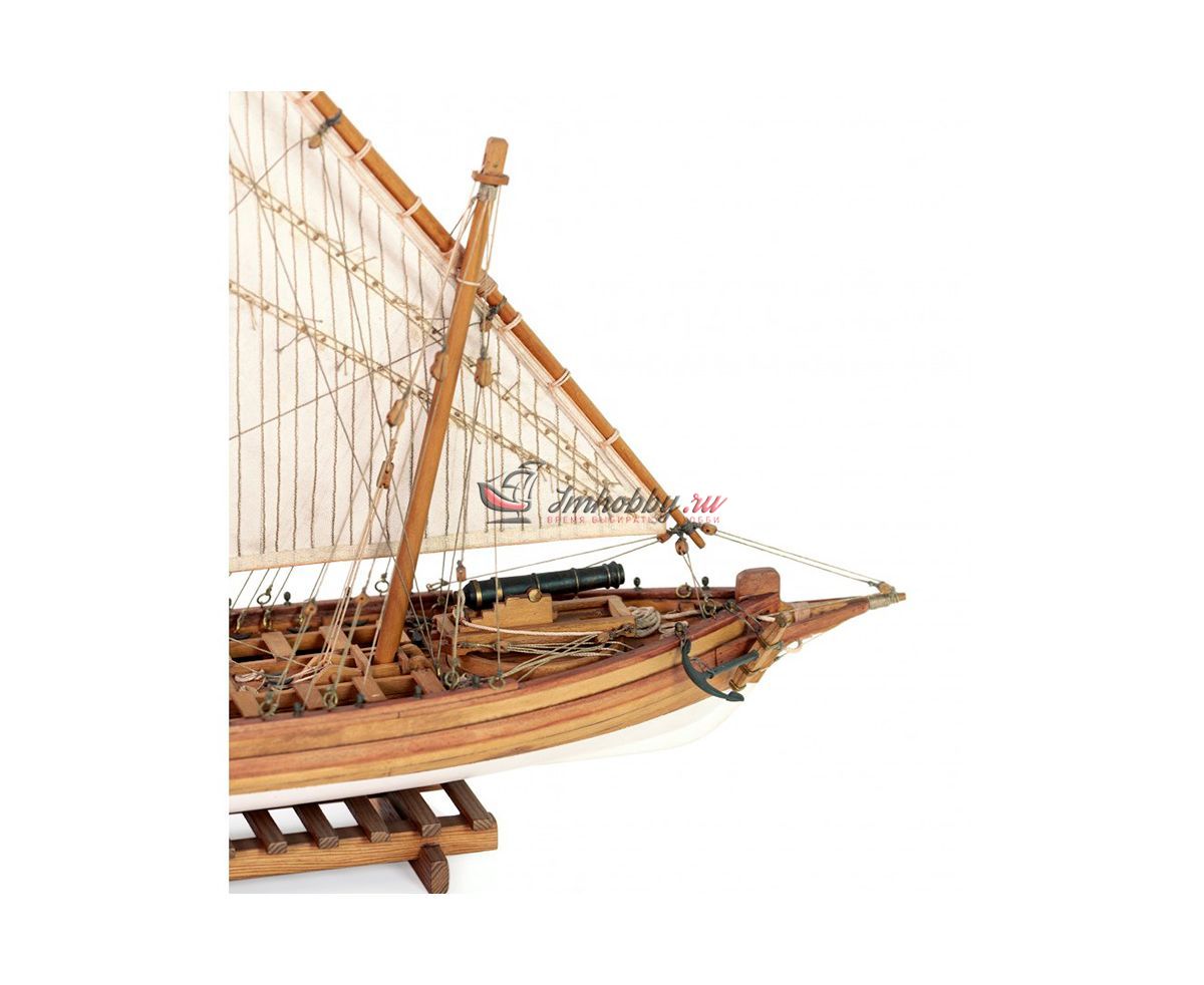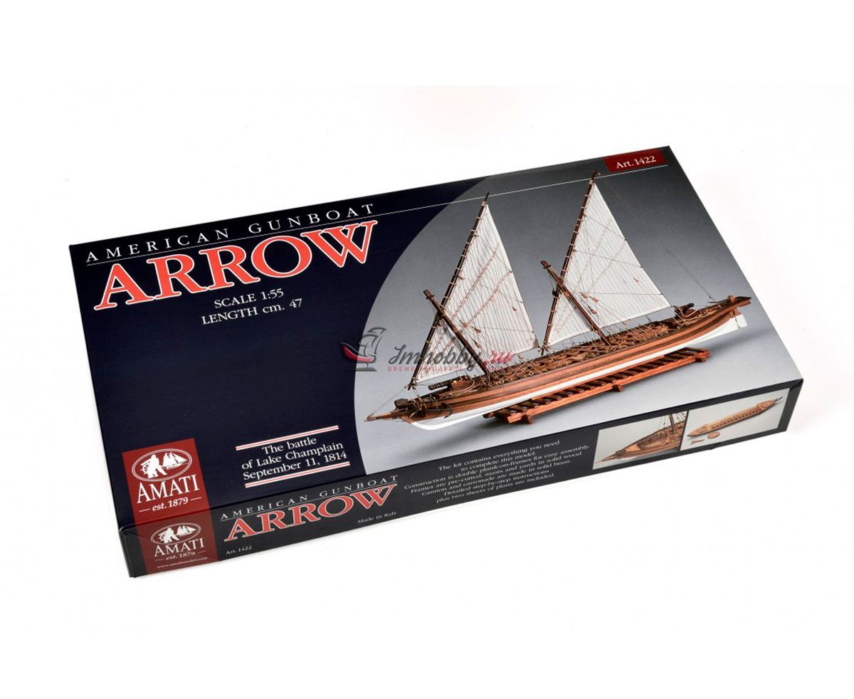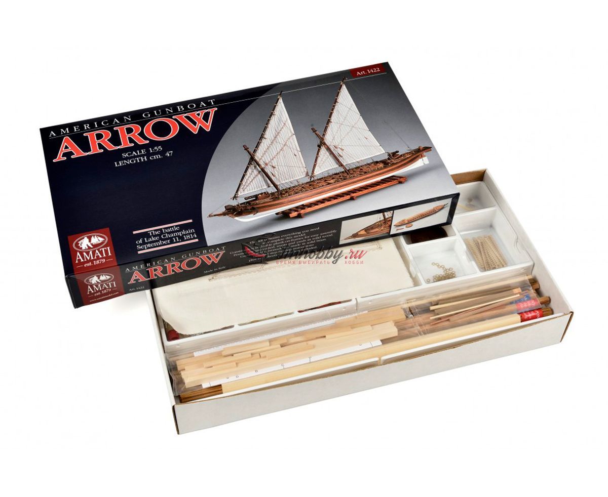 24 Августа 1814 года: Вашингтон занят английским войсками, Белый дом с Капитолием сожжены, армия разгромлена, правительство бежит из города. Английские войска заняли более 35000 миль американских территорий. Кажется, дух американской армии сломлен Наступает 11 сентября 1814 года Платтсбург Американская база на берегу озера Шамплейн Англичане намерены разделить США на две части, ударив сразу с двух сторон, со стороны штата Мэн и со стороны Канады около озера Шамплейн Британская флотилия в составе 16 военных кораблей вооруженных 100 пушками поднимают паруса и идут на юг, но немногочисленная американская флотилия во главе с превосходным командиром Томасом МакДонаутом внезапно идут им наперерез.. В конце сражения четыре британских корабля, потеряв мачты, капитулируют, а остальные спешно отступают. Оказавшись без поддержки флота, сухопутные силы Британии вынуждены отступить в Канаду. В этом сражении в составе американского флота были канонерские лодки (галера) типа Arrow (Стрела). Сражение длилось всего 2 часа 20 минут, но вынудило английское правительство прекратить войну и искать мир. 24 декабря был подписан Гентский договор, восстановивший довоенный статус-кво, но не решивший территориальных и экономических вопросов, вызвавших войну. Общие потери американцев в войне составили 2260 человек. Эта война также получила название второй Войны за независимость (именно такое название принято в американской историографии). Интересная наборная конструкция корпуса модели обшивается как изнутри (настил), так и снаружи. Изнутри используются рейки танганики шириной 3мм, первая внешняя обшивка корпуса выполняется рейками липы 1х3мм, вторая рейками ореха 0,5х3мм. Специфичные для канонерки обводы корпуса завершаются интересной конструкцией штевней. В носовой и кормовой частях лодки на поворотных площадках устанавливаются пушка и карронада страшная, разрушительная сила. Фок и грот-мачта модели сильно наклонены вперед, две реи несут латинские паруса. По этой причине такелаж будет выполнять интересно и не очень сложно. При этом используются нити трех диаметров от 0,25 до 0,75мм. Два паруса пропечатанны на ткани, но можно их сделать и самостоятельно. Подставка в виде стапеля входит в комплект. Хорошие чертежи на 4-х больших страницах и инструкция на 16-ти страницах великолепно соответствуют высокому уровню детализации модели. Кроме того, к комплекту прилагается перевод инструкции на русский язык с комментариями, советами и предостережениями. Спецификации:Масштаб - 1:55Длина - 470 мм