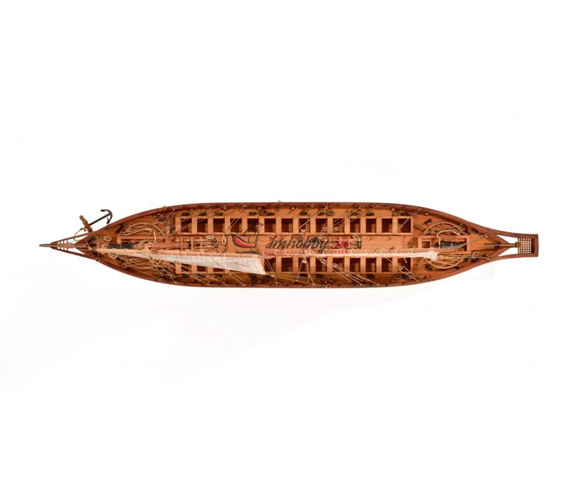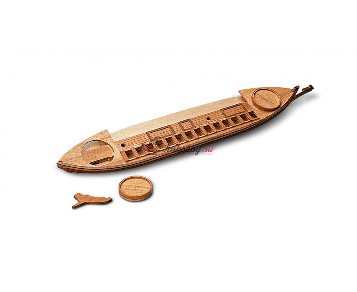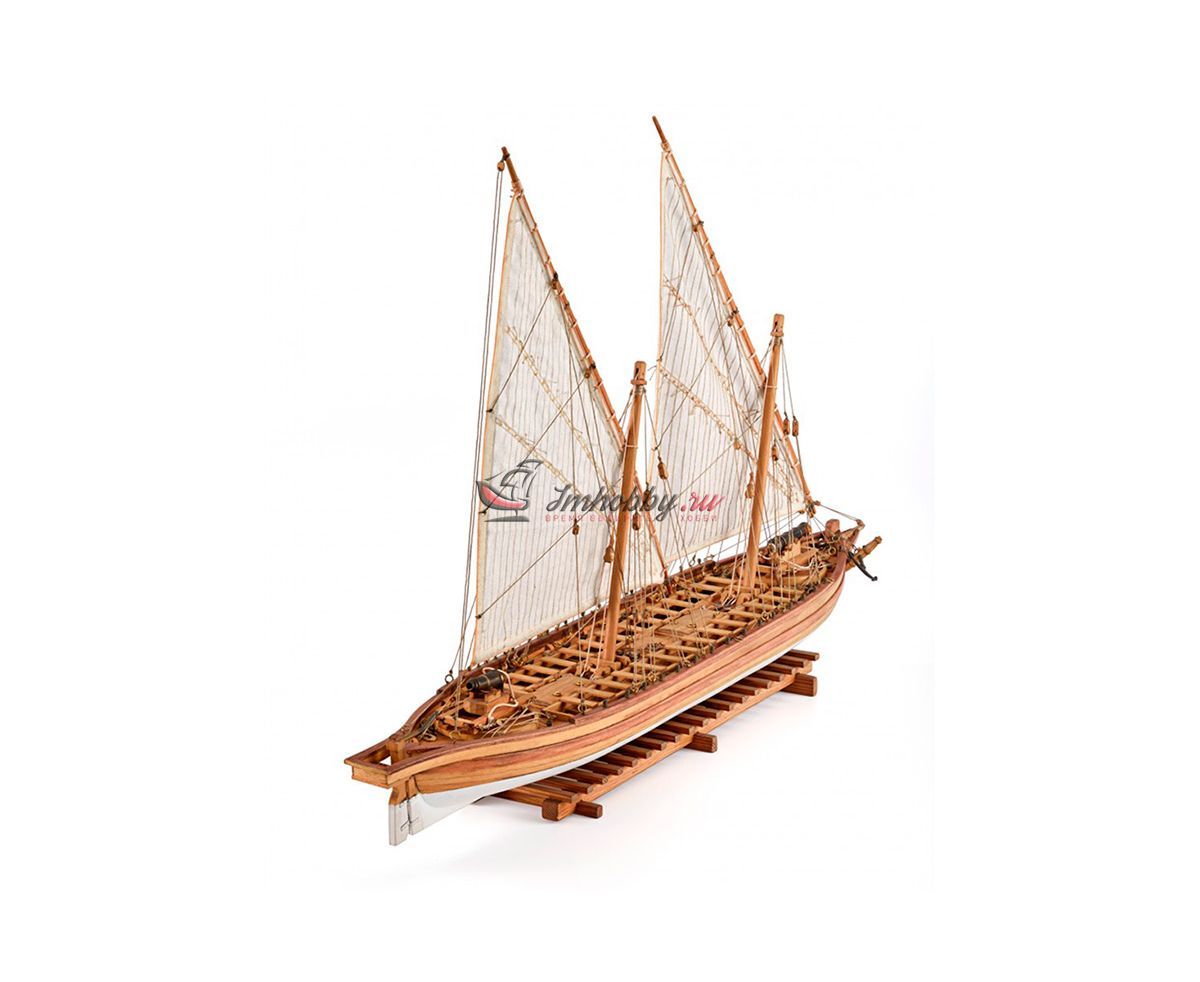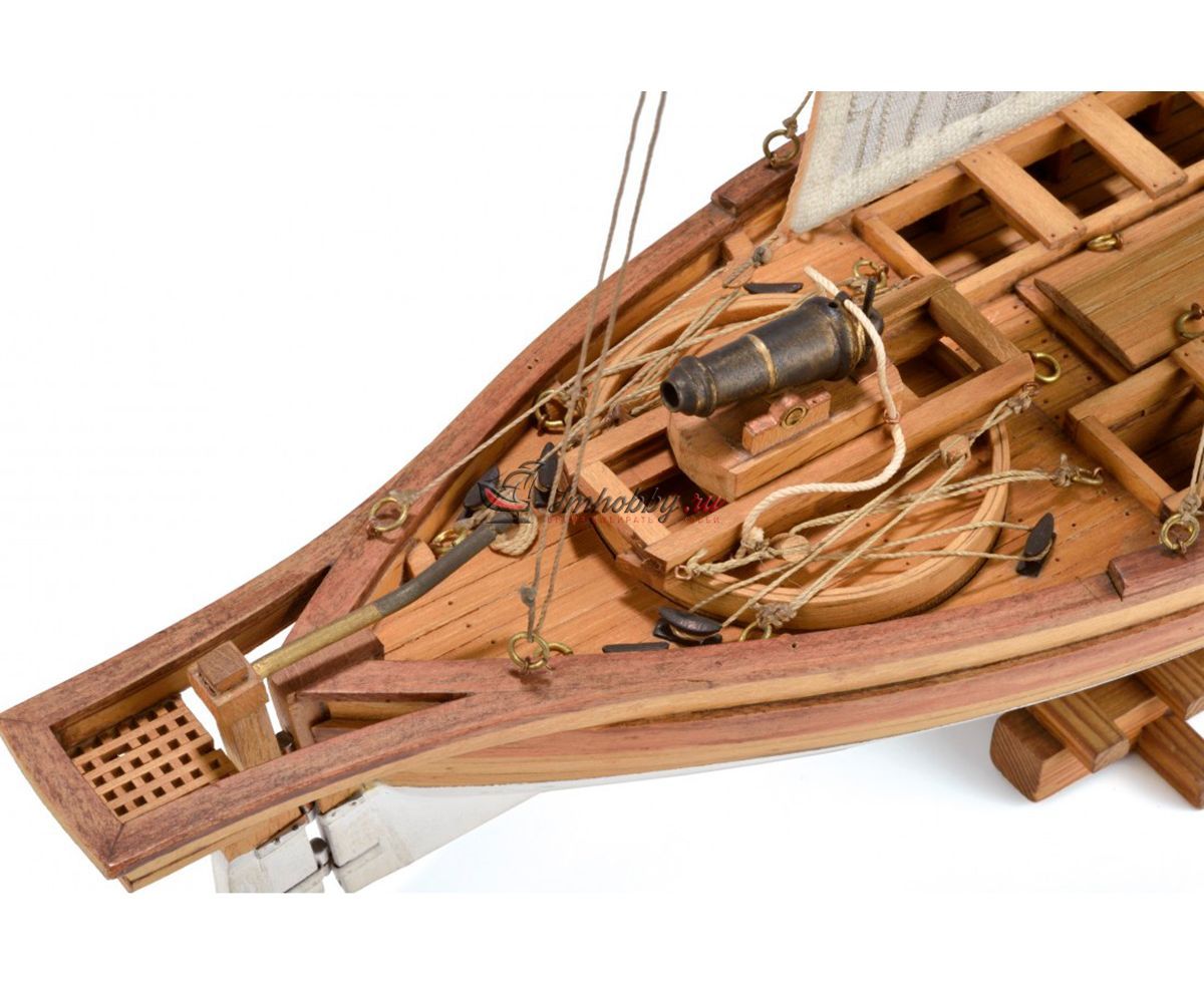 24 Августа 1814 года: Вашингтон занят английским войсками, Белый дом с Капитолием сожжены, армия разгромлена, правительство бежит из города. Английские войска заняли более 35000 миль американских территорий. Кажется, дух американской армии сломлен Наступает 11 сентября 1814 года Платтсбург Американская база на берегу озера Шамплейн Англичане намерены разделить США на две части, ударив сразу с двух сторон, со стороны штата Мэн и со стороны Канады около озера Шамплейн Британская флотилия в составе 16 военных кораблей вооруженных 100 пушками поднимают паруса и идут на юг, но немногочисленная американская флотилия во главе с превосходным командиром Томасом МакДонаутом внезапно идут им наперерез.. В конце сражения четыре британских корабля, потеряв мачты, капитулируют, а остальные спешно отступают. Оказавшись без поддержки флота, сухопутные силы Британии вынуждены отступить в Канаду. В этом сражении в составе американского флота были канонерские лодки (галера) типа Arrow (Стрела). Сражение длилось всего 2 часа 20 минут, но вынудило английское правительство прекратить войну и искать мир. 24 декабря был подписан Гентский договор, восстановивший довоенный статус-кво, но не решивший территориальных и экономических вопросов, вызвавших войну. Общие потери американцев в войне составили 2260 человек. Эта война также получила название второй Войны за независимость (именно такое название принято в американской историографии). Интересная наборная конструкция корпуса модели обшивается как изнутри (настил), так и снаружи. Изнутри используются рейки танганики шириной 3мм, первая внешняя обшивка корпуса выполняется рейками липы 1х3мм, вторая рейками ореха 0,5х3мм. Специфичные для канонерки обводы корпуса завершаются интересной конструкцией штевней. В носовой и кормовой частях лодки на поворотных площадках устанавливаются пушка и карронада страшная, разрушительная сила. Фок и грот-мачта модели сильно наклонены вперед, две реи несут латинские паруса. По этой причине такелаж будет выполнять интересно и не очень сложно. При этом используются нити трех диаметров от 0,25 до 0,75мм. Два паруса пропечатанны на ткани, но можно их сделать и самостоятельно. Подставка в виде стапеля входит в комплект. Хорошие чертежи на 4-х больших страницах и инструкция на 16-ти страницах великолепно соответствуют высокому уровню детализации модели. Кроме того, к комплекту прилагается перевод инструкции на русский язык с комментариями, советами и предостережениями. Спецификации:Масштаб - 1:55Длина - 470 мм