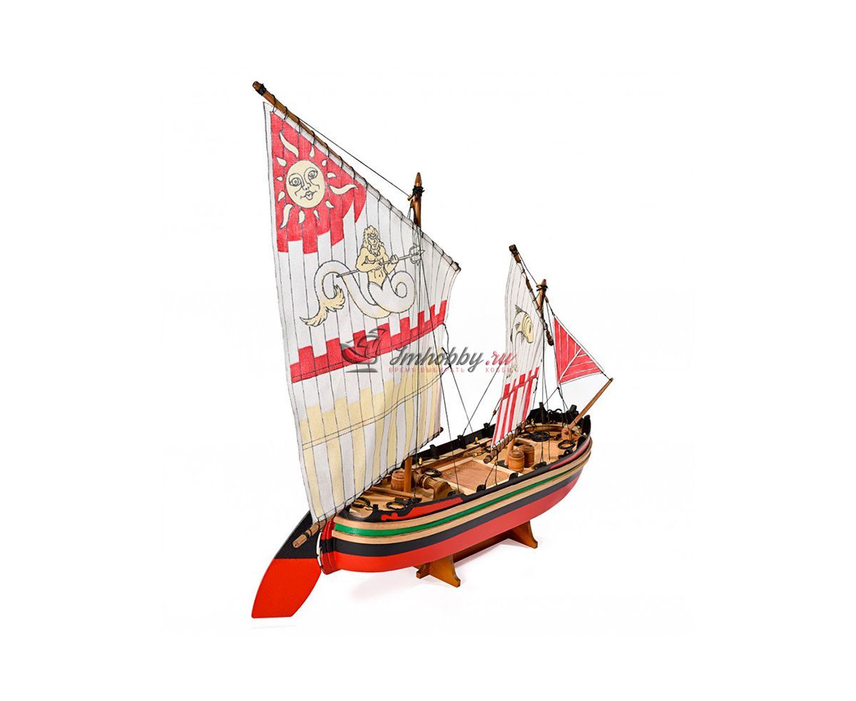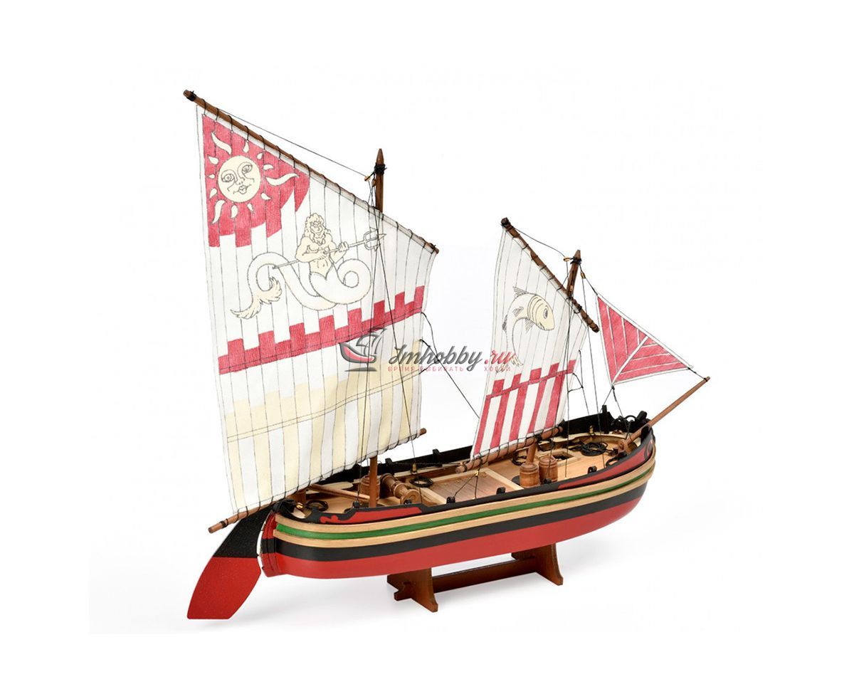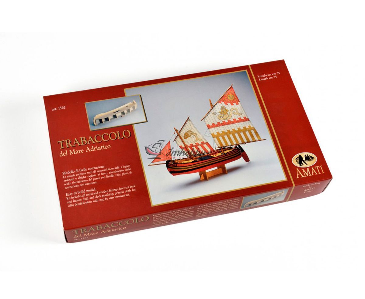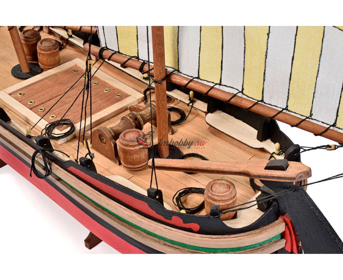 Требаки - торговые суда, которые использовались в Средиземном, Чёрном и Азовском морях. Самую большую популярность возымели в Адриатическом море. Требаки получили популярность неплохих прибрежных судов, способных выходить и в море. Своё начало данный вид судов берет из Кьоджа, Италия. Европейцы использовали требаки для переброски войск и армейских грузов. Широкое распространение в России требаки не получили. Так, к примеру, для дел флота было выстроено только 5 требак.Возводили требаки по образцами итальянских купеческих судов "Коло" и приняли на вооружение в виде посыльных и лоцманских судов. Трофейные требаки часто переоборудовались и входили в соединения флота.Модель корабля Trabaccolo от итальянской фирмы Amati привлекает внимание за счет яркой окраски, несложной сборки и по-прежнему высокому качеству используемых материалов.Корпус модели собирается из вырезанных лазером деталей и имеет одинарную обшивку из бука. В комплект входят блоки, нити, трап, деревянные бочки, якорь-кошка, брашпиль и нагеля. Обшивку и детали рангоута предлагается выполнить из таких пород дерева как липа, бук и тёмный орех. Завершают модель нити для такелажа, паруса с рисунками, отпечатанные на ткани. Набор содержит полномасштабный чертеж и инструкцию по сборке на итальянском языке.Данная модель подходит для начального уровня. Мы рекомендуем её для людей без опыта и тех, кто хочет попробовать свои силы в судомоделизме.Спецификации:Длина 445 ммВысота 370 ммШирина 85 мм