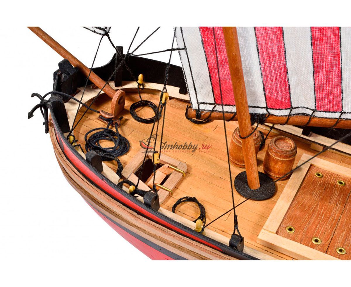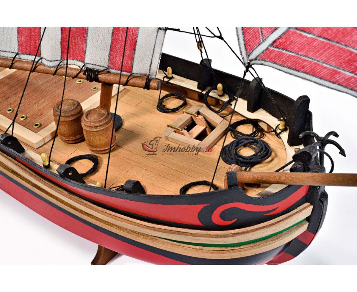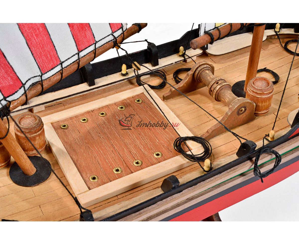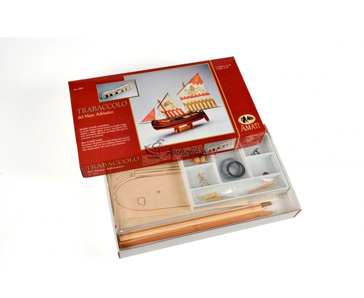 Требаки - торговые суда, которые использовались в Средиземном, Чёрном и Азовском морях. Самую большую популярность возымели в Адриатическом море. Требаки получили популярность неплохих прибрежных судов, способных выходить и в море. Своё начало данный вид судов берет из Кьоджа, Италия. Европейцы использовали требаки для переброски войск и армейских грузов. Широкое распространение в России требаки не получили. Так, к примеру, для дел флота было выстроено только 5 требак.Возводили требаки по образцами итальянских купеческих судов "Коло" и приняли на вооружение в виде посыльных и лоцманских судов. Трофейные требаки часто переоборудовались и входили в соединения флота.Модель корабля Trabaccolo от итальянской фирмы Amati привлекает внимание за счет яркой окраски, несложной сборки и по-прежнему высокому качеству используемых материалов.Корпус модели собирается из вырезанных лазером деталей и имеет одинарную обшивку из бука. В комплект входят блоки, нити, трап, деревянные бочки, якорь-кошка, брашпиль и нагеля. Обшивку и детали рангоута предлагается выполнить из таких пород дерева как липа, бук и тёмный орех. Завершают модель нити для такелажа, паруса с рисунками, отпечатанные на ткани. Набор содержит полномасштабный чертеж и инструкцию по сборке на итальянском языке.Данная модель подходит для начального уровня. Мы рекомендуем её для людей без опыта и тех, кто хочет попробовать свои силы в судомоделизме.Спецификации:Длина 445 ммВысота 370 ммШирина 85 мм