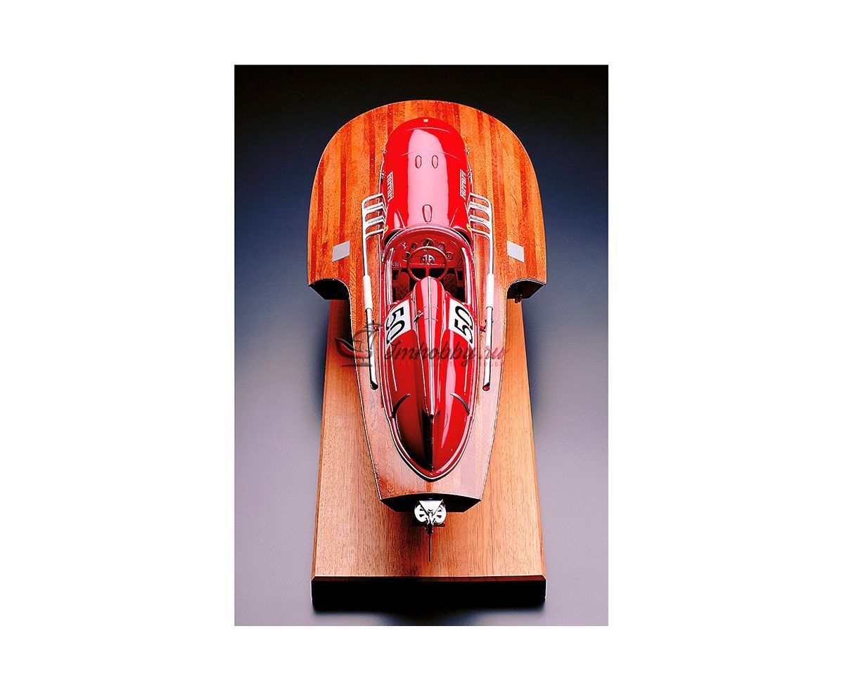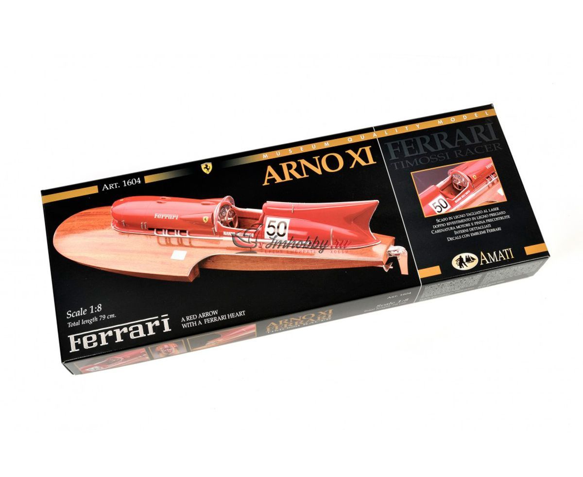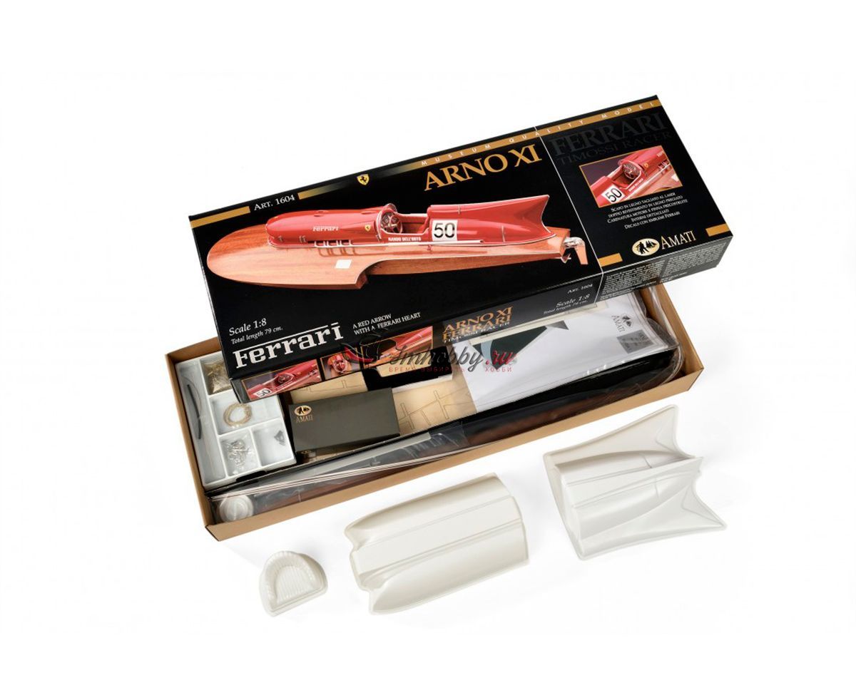 Сборная модель гоночной лодки Ferrari Arno XI от Amati в масштабе 1:8, артикул AM1604-рус. Фирма Amati предлагает сделать модель этой гоночной лодки с использованием каркаса, собираемого из вырезанных лазером деталей, при этом корпус имеет сложную форму и формируется сразу с обтекателем и выступами для установки стабилизатора. Обшивка корпуса сначала делается из уже раскроенных листов гибкой и тонкой фанеры, а затем сверху обшивается рейками красного дерева, а снизу устанавливаются металлические накладки. Желательно покрыть верхнюю обшивку корпуса глянцевым лаком и заполировать, тогда модель будет выглядеть неотразимо. Хорошо проработанный интерьер кокпита состоит из множества металлических фототравленных деталей отличного качества, литых смоляных и пластиковых деталей, дающих полное представление об органах управления лодки. Обтекатель двигателя, кормовой стабилизатор и сиденье гонщика даны пластиковыми деталями, которые необходимо склеивать и окрашивать в цвета Ferrari. Выхлопные трубы, руль, гребной винт и другие мелкие детали даны отлитыми из смолы и их нужно окрашивать краской под хром. Довольно подробная пошаговая инструкция состоит из более чем ста схем и рисунков, которые ссылаются на три полноразмерных чертежа. Завершают модель декали с логотипом Ferrari, именем гонщика и бортовым номером лодки. Основание, показанное на фото, не входит в комплект Эту модель гоночной лодки можно превратить в действующую с радиоуправлением. Для этого надо докупить трансмиссию AM1604-02, мотор, двухканальную аппаратуру радиоуправления с регулятором скорости для мотора, аккумулятор и желательно другой гребной винт. Спецификации:Масштаб - 1:8Длина - 790 ммМузейное качество.Изготовитель анонсирует эту модель как "трудную в изготовлении".