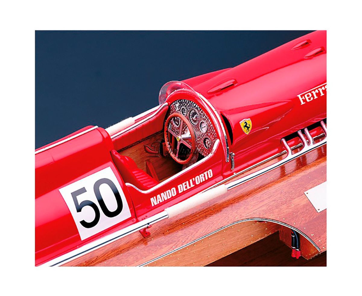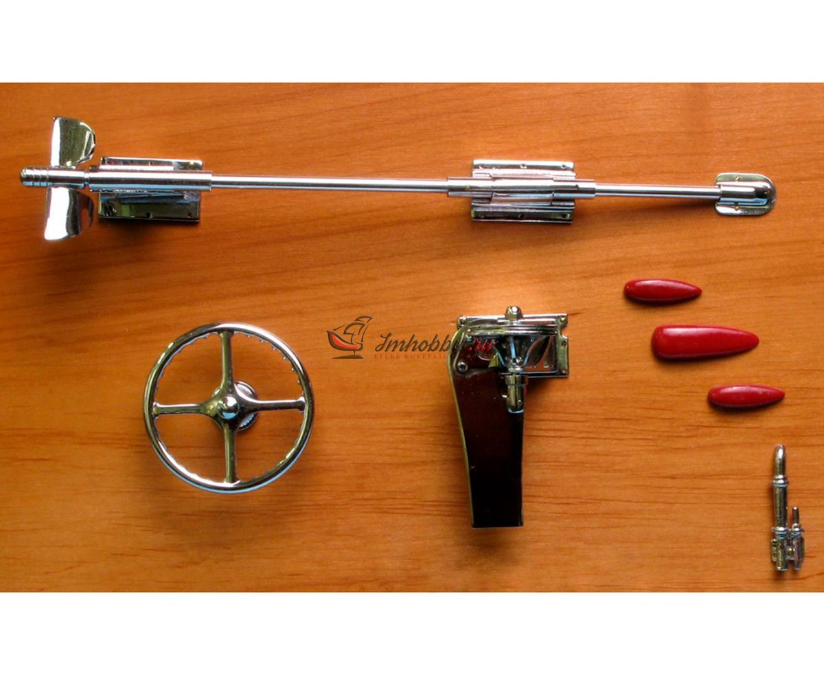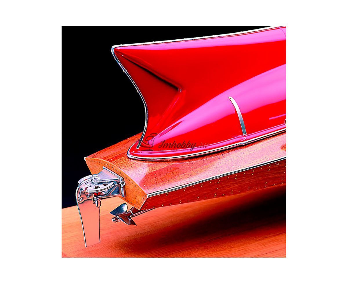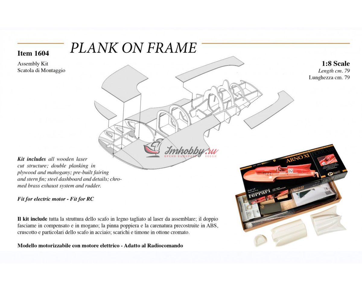 Сборная модель гоночной лодки Ferrari Arno XI от Amati в масштабе 1:8, артикул AM1604-рус. Фирма Amati предлагает сделать модель этой гоночной лодки с использованием каркаса, собираемого из вырезанных лазером деталей, при этом корпус имеет сложную форму и формируется сразу с обтекателем и выступами для установки стабилизатора. Обшивка корпуса сначала делается из уже раскроенных листов гибкой и тонкой фанеры, а затем сверху обшивается рейками красного дерева, а снизу устанавливаются металлические накладки. Желательно покрыть верхнюю обшивку корпуса глянцевым лаком и заполировать, тогда модель будет выглядеть неотразимо. Хорошо проработанный интерьер кокпита состоит из множества металлических фототравленных деталей отличного качества, литых смоляных и пластиковых деталей, дающих полное представление об органах управления лодки. Обтекатель двигателя, кормовой стабилизатор и сиденье гонщика даны пластиковыми деталями, которые необходимо склеивать и окрашивать в цвета Ferrari. Выхлопные трубы, руль, гребной винт и другие мелкие детали даны отлитыми из смолы и их нужно окрашивать краской под хром. Довольно подробная пошаговая инструкция состоит из более чем ста схем и рисунков, которые ссылаются на три полноразмерных чертежа. Завершают модель декали с логотипом Ferrari, именем гонщика и бортовым номером лодки. Основание, показанное на фото, не входит в комплект Эту модель гоночной лодки можно превратить в действующую с радиоуправлением. Для этого надо докупить трансмиссию AM1604-02, мотор, двухканальную аппаратуру радиоуправления с регулятором скорости для мотора, аккумулятор и желательно другой гребной винт. Спецификации:Масштаб - 1:8Длина - 790 ммМузейное качество.Изготовитель анонсирует эту модель как "трудную в изготовлении".