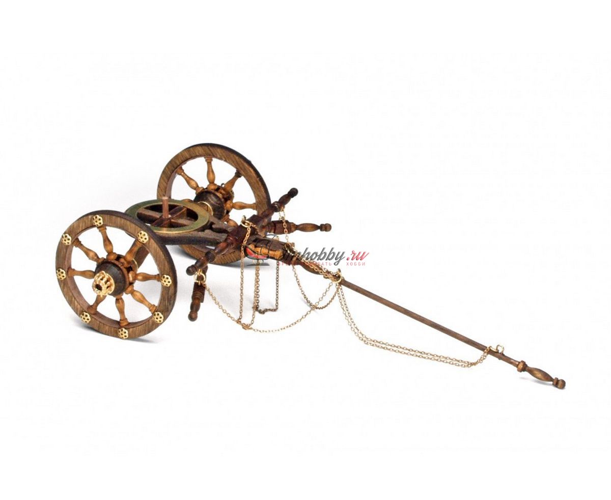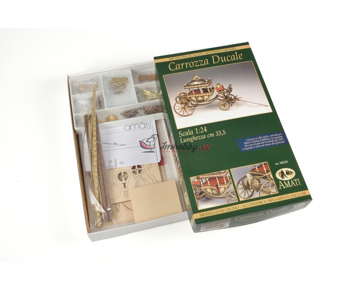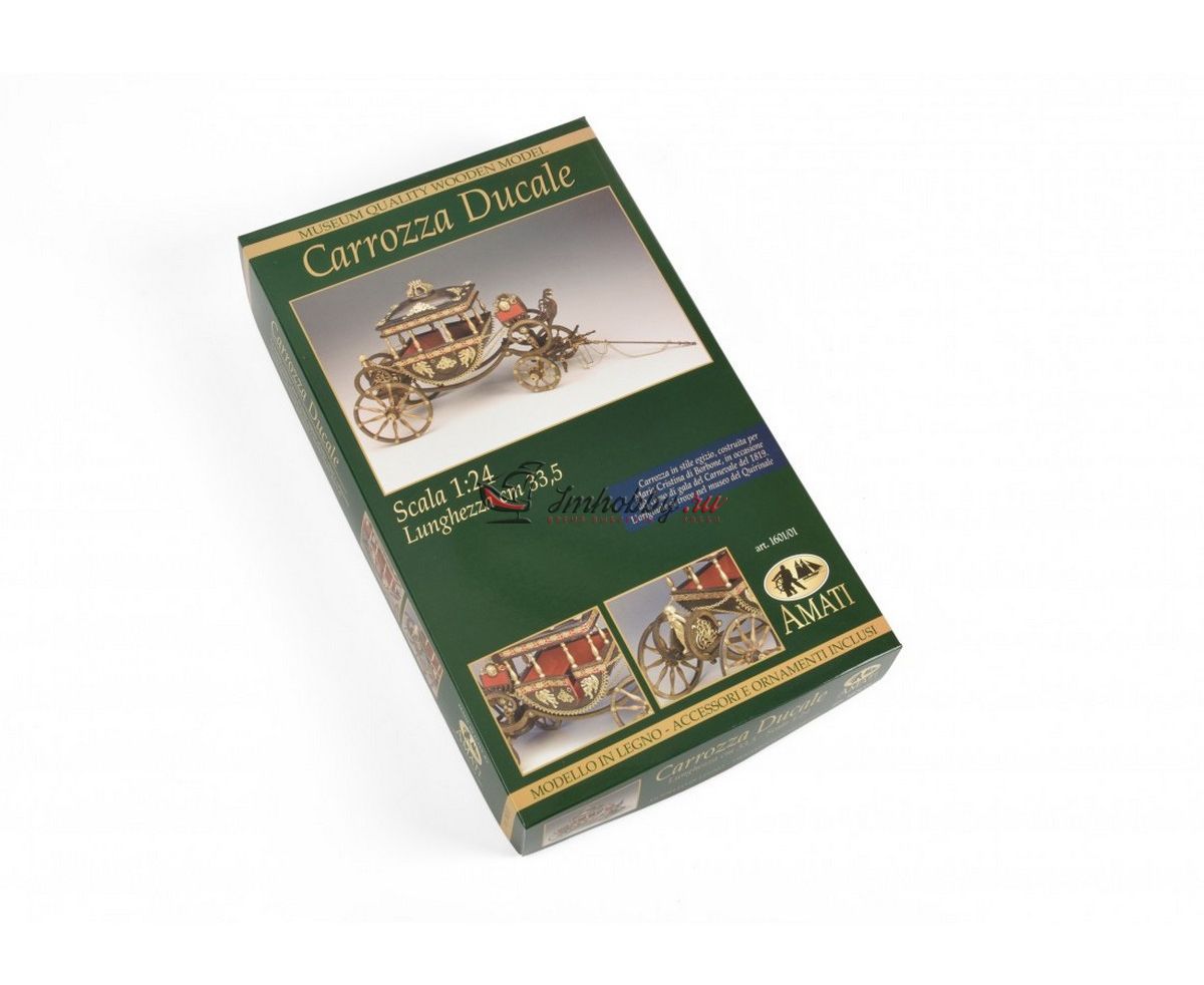 Эта очаровательная карета была сделана в 1819 году для карнавала в Турине, Италия. Её точная копия фирмы Амати восхитительна! Деревянные части, включая колеса и художественное оформление, вырезаны лазером. Стойки кареты идеально выточены на токарном станке. Много красивых детальных медных и позолоченных металлических элементов.Прилагается инструкция на русском языке.Спецификации:Масштаб - 1:24Длина 335 мм