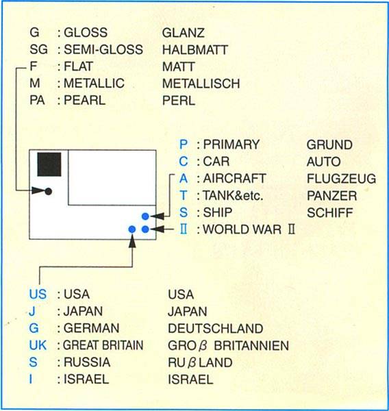AQUEOUS HOBBY COLOR - акриловая краска на водной основе. Объем 10мл, цвет колпачка баночки соответствует цвету краски. Предназначена для окраски моделей из пластика, метала, дерева с помощью кисти или аэрографа. AQUEOUS HOBBY COLOR обладает уникальными характеристиками: укрывистости, точности (глубины) цветов и адгезии к различным поверхностям. Для работы с аэрографом производитель рекомендует использовать специальный разбавитель AQUEOUS COLOR THINNER. Расшифровку обозначений смотрите на второй фотографии