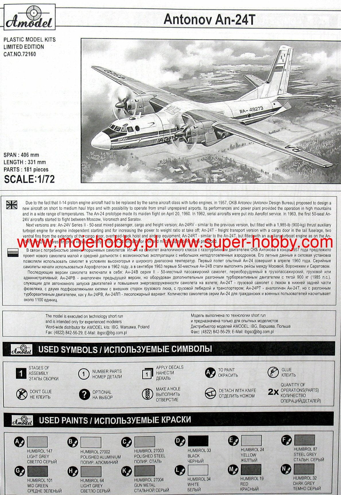 The Antonov An-24 was a Soviet, high-wing, twin-engine passenger and transport aircraft from the Cold War period. The drive was provided by two turboprop engines Ivchenko AI-24T 2820 hp each. The flight of the prototype took place in 1959, and serial production continued in 1959-1979. In total, approximately 1,370 aircraft of this type of all versions were built. The Antonov An-24 was developed to replace the increasingly obsolete IL-14 machines in civil and military aviation. Compared to its predecessor, the new aircraft featured a different wing layout, new, more efficient engines, much better avionics and communications equipment. The An-24 also required much less time to conduct a technical inspection and was adapted to operate from airports with poor infrastructure. In the course of production, many development versions of the aircraft were created, including: An-24 (basic version), An-24B (version with an enlarged passenger cabin), An-24T (transport version) or An-24P (fire aircraft). Many machines of this type are still in service.