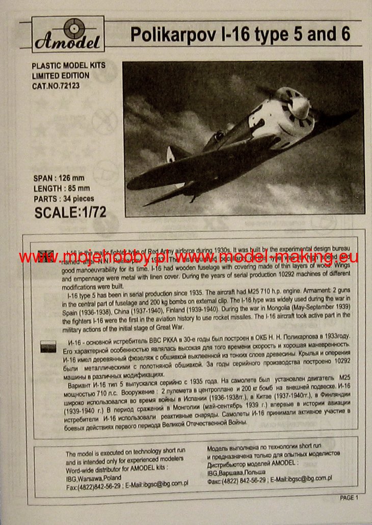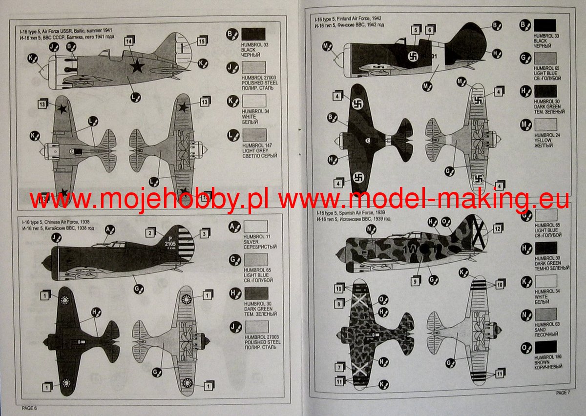The Polikarpov I-16 is a Soviet, single-engine low-wing fighter in a mixed design with a classic tail. The prototype's flight took place in 1933. The I-16 turned out to be one of the most modern fighters of that period. It had retractable wheels, modern wing geometry and the ability to change the "turn" of the propeller. At the same time, however, due to its short hull, it was very difficult to pilot and required a lot of attention from the pilot. I-16 had its baptism of fire during the Spanish Civil War, where about 500 units were delivered to the republican troops. The plane surprised the Frankists with its incredible maneuverability, firepower and speed of climb. In 1939, the I-16s was sent to China, which was fighting against Japan, and there it surprised its opponents again. Initially, the M-22 engine was used as a power unit, but on subsequent versions it was replaced with other power units, min. M-25 or M-63. The I-16 remained in the line on the Eastern Front until 1942, serving as not only a fighter, but also an attack aircraft. Technical data (version I-16 Type 24): length: 6.13m, wingspan: 9m, height: 3.25m, maximum speed: 525km / h, rate of climb: 14.7m / s, practical ceiling: 9700m, range maximum: 700km, armament: fixed - two 7.62mm SzKAS machine guns and two 20mm ShWAK cannons, suspended - up to 500 kg of bombs.