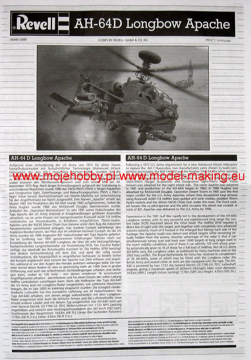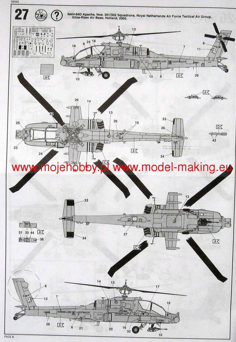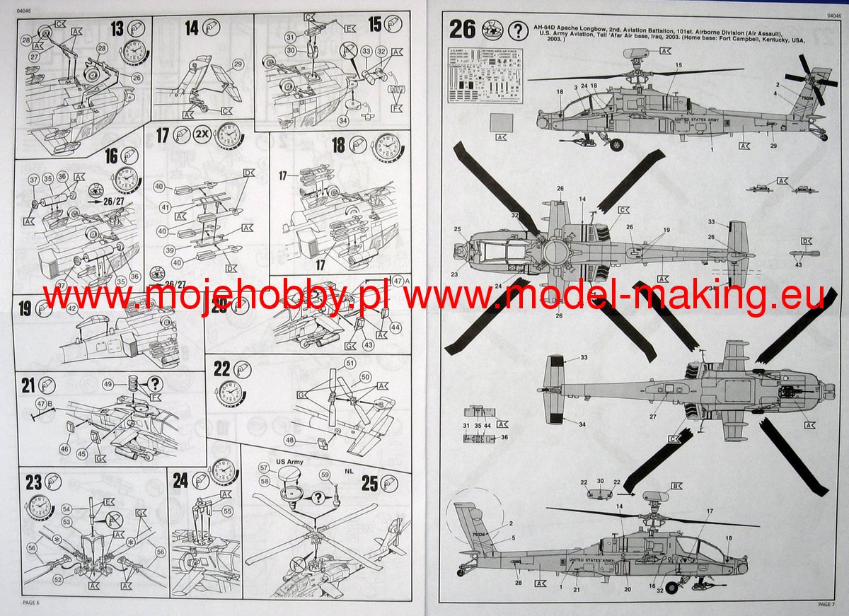 The McDonnell-Douglas (Boeing) AH-64 helicopter was selected as the winner in the competition with Bell's YAH-63 in December 1976. The name Apache stuck to the helicopter in 1981. This highly efficient machine has four-blade rotors driven by two General Electric T700-701 turbine engines with a capacity of 1696HP. The vestigial wings are fitted with conventional trailing edge flaps, and a plate tail improves longitudinal steering. The two-man crew takes seats one after the other in the armored cabin. The pilot's seat is in the rear, and the weapon operator / gunner is in the front. The key to the universal use of the helicopter are the TADS systems on the gunner's stand and the PNVS systems used by the pilot. The TADS is a target-tracking laser marker and rangefinder set and a forward-facing infrared sensor that is duplicated by the normal optics. The PNVS system is a developed FLIR system that allows you to pilot a helicopter just above the ground in order to prevent or delay detection by the enemy's anti-aircraft defense. Apache helicopters took part in the operation in Panama in 1989, during the Desert Storm in 1991, or the last conflict in Iraq (2003). At the end of 1990, the construction of a new version of the helicopter began, equipped with a Martin / Westinghouse Longbow millimeter radar installed above the head to control the weapons. It is used to control the Rockwell AGM-114 Hellfire anti-tank missiles. Technical data: Top speed: 300 km / h; climb speed 12.7 m / s, maximum range (without external tanks): 689 km, armament: 30mm Hughes M230A1 Chain Gun fixed-1 cannon, and outboard armaments - most often Hellfire missiles.