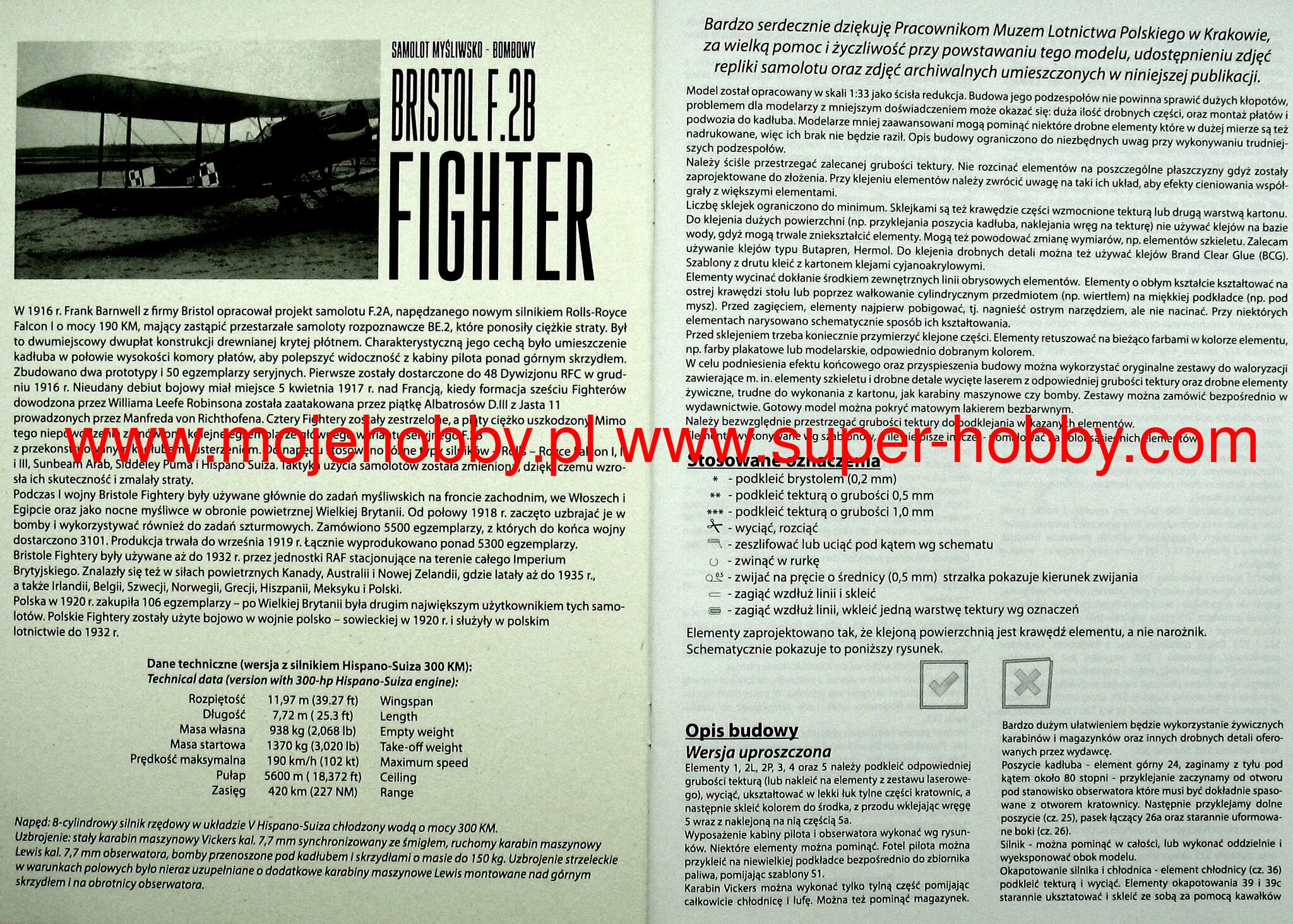 In 1916. the British Royal Flying Corps ordered a two-seater fighter from several aviation companies, which could defend itself against attacks by enemy aircraft. An observer or a shooter in the second cabin, operating a movable machine gun mounted on a turntable, was to contribute to this. The construction of such an aircraft was undertaken by the Bristol company, and at the beginning of 1916. Eng. Frank Bornwell, the company's constructor, designed the plane in a biplane layout, with the fuselage suspended between the wings and with a very close distance between the pilot's and observer's or gunner's open cabins so that they could easily communicate. The prototype of the plane powered by the Falcon in-line engine, designated the Bristol F.2A, was flew on September 9, 1916. During the flight tests, the prototype confirmed the good handling properties and the assumed performance. At that time, 50 of these aircraft were ordered, with which two Royal Flying Corps squadrons were equipped. After introducing a few design changes, the series production of the aircraft, designated the Bristol F.2B Fighter, began. In addition to British aviation orders, the plant also received orders from other countries. Overall, from 1916. by the end of World War I, 3101 Bristol F.2B Fighter aircraft were produced, and after its completion, a further 378 aircraft for British and 49 for foreign aviation. They were also produced under license in the USA of 50 pieces and in Belgium - 40 pieces. For the first time, 6 Bristol F.2B planes from 40 Squadron fought in the air on April 5, 1917. over Arras in France with 5 fighter planes from Richthofen's squadron. The German pilots then shot down 4 English planes without suffering any losses. Only the change of the tactics of using these planes from defensive to offensive showed their advantages and the pilots on these planes achieved a number of victories and so 20 RFC squadron equipped with Bristol F.2B Fighter planes shot down a total of 613 enemy planes. Individually, the most victories on this type of aircraft were achieved by the Canadian crew: Maj. Pil. A. Mac Keever and the gunner LF Powell, the first of them shot down 30 and the second 6 German planes within six months. The advantages of this aircraft, which were confirmed during the fights in World War I, meant that it was used in the British RAF aviation until 1932. Until the mid-thirties, it was also used in aviation, among others in Belgium, China and Spain. Ireland and Mexico. Technical data: Maximum speed: 192 km / h, speed of climb: 5.1 m / s, maximum altitude: 6100 m, maximum range: 467 km, armament: fixed - 3 machine guns, 7.7 mm caliber.