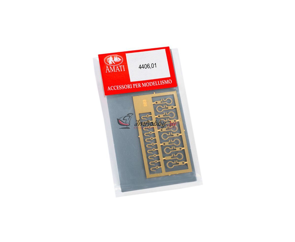 Вант-путенсы с крюками, выполнены из латуни методом фототравления. Количество 10 штук. Диаметр устанавливаемого юферса 3 мм.