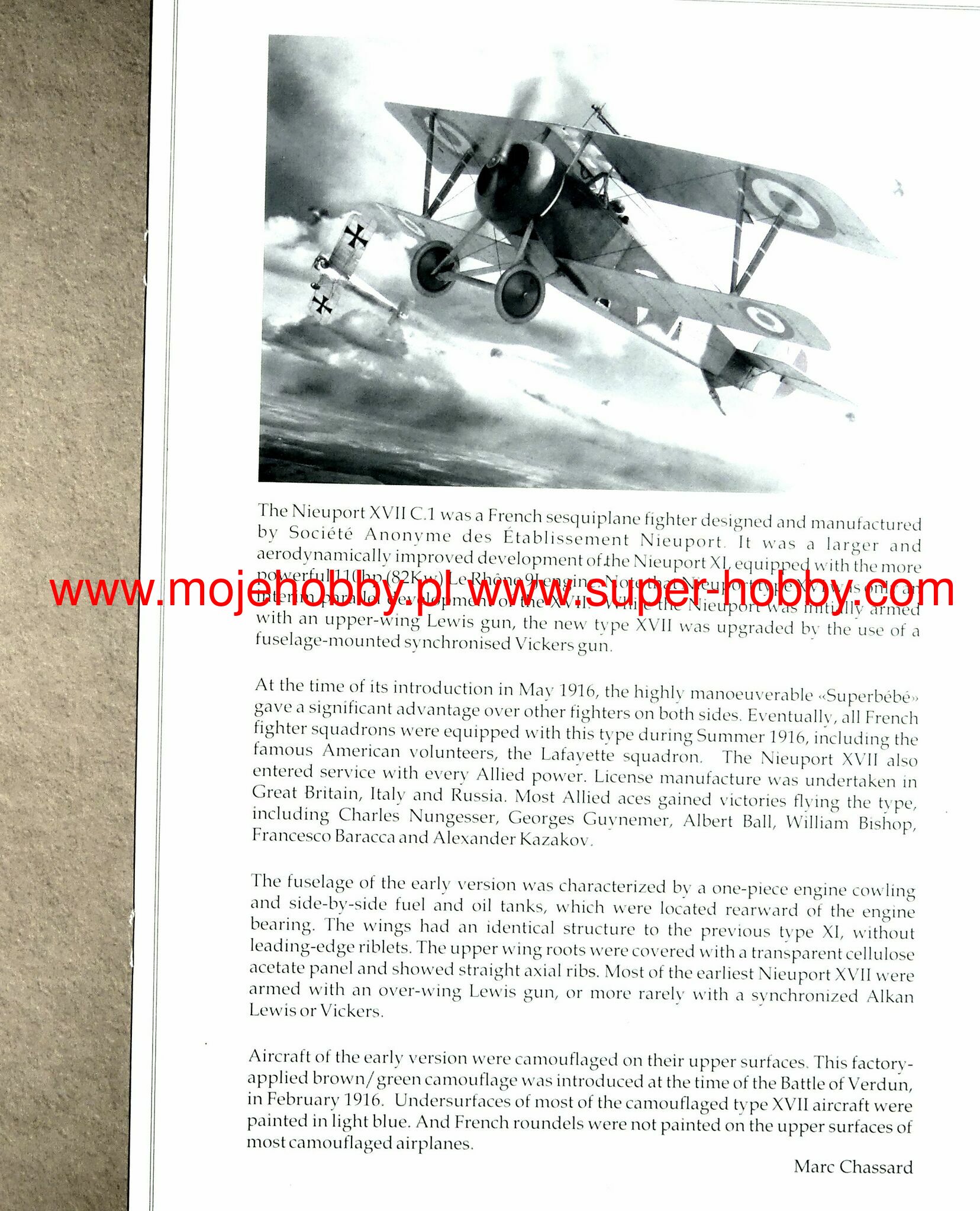 The Nieuport 17 is a French mixed-construction fighter from the First World War. The flight of the prototype took place in January 1916, and the machine entered service two months later. Le Rhone 9J engine with 110 HP was used as the drive. He was the successor of the Nieuport 11 aircraft and had great performance for its time, especially its rate of climb. At the same time, however, due to the delicacy of the structure and low overall strength of the airframe, the plane was difficult to pilot and rather "did not forgive" the pilot's mistakes. It was produced on a large scale and remained the main fighter of the French Army until the end of World War I. Many Allied fighter aces flew on it, including Billy Bishop or Albert Ball. Technical data: length: 5.8 m, wingspan: 8.16 m, height: 2.4 m, maximum speed: 177 km / h, rate of climb: 4.3 m / s, maximum ceiling 5300 m, armament: fixed - 1 Vickers machine gun or Lewis, suspended-to 8 Le Prieur missiles.