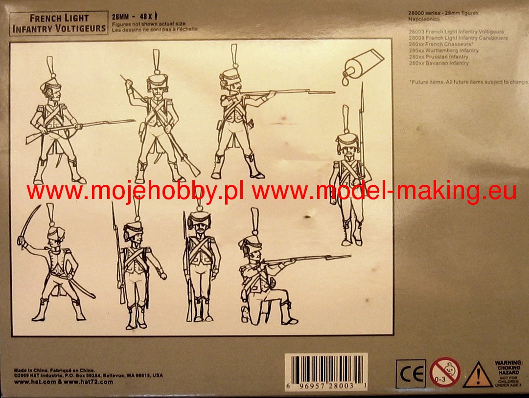 W dobie wojen rewolucyjnych (1792-1799) oraz - zwłaszcza - w okresie napoleońskim (1799-1815) Francja posiadała prawdopodobnie najsprawniejszą machinę wojenną na Starym Kontynencie, która nieomal doprowadziła do jej trwałej hegemonii nad Europą. Truizmem będzie stwierdzenie, że kluczowym elementem owej machiny była francuska armia. W tejże natomiast armii bardzo istotną rolę odgrywała piechota, w której od 1803 roku zaczęto formować jednostki woltyżerów (fr. voltigeurs). Jednostki te były przeznaczone do walki w tyralierze przed główna masą nacierającą własnego pułku piechoty. Wykorzystywano je również jako piechotę lekką do ubezpieczenia przemarszów własnych wojsk czy prowadzenia rekonesansu. W ich szkoleniu kładziono bardzo duży nacisk na umiejętności strzeleckie, samodzielność na polu walki oraz umiejętność wykorzystywania przeszkód terenowych. Rekrutowano również do nich niższych mężczyzn, aniżeli do piechoty liniowej czy grenadierów. Od 1804 roku w batalionie piechoty liniowej znajdowała się pojedyncza kompania woltyżerów, która liczyła etatowo 120 ludzi. Natomiast od 1808 roku, kiedy to zmniejszono liczbę kompanii w batalionie, kompania woltyżerska liczyła etatowo 140 ludzi. Warto dodać, że w przeciwieństwie do piechoty liniowej, woltyżerowie posługiwali się karabinkami dragonów. Co oprócz modelu będę potrzebować do jego sklejenia?