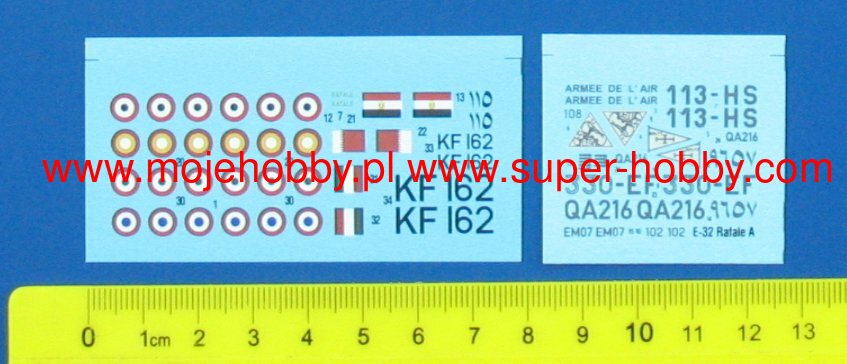 Note: Comany Mistercraft frequently changes, without any notice, the decals that come with the model, so they may differ from the photos and descriptions on our website. If you need a specific version, please let us know about that by entering the appropriate notice in the comments field when placing the order. The Dassault Rafale (French squall) is a French twin-engine multi-role fighter plane with delta wings. Construction of the Rafale was initiated in 1980 by Dassault as an experimental combat aircraft - the ACX. It was to replace the tactical battlefield aircraft of the French air force Jaguar and the French navy Vouhgt F-8E and Dassault Super Etendard. Rafale A, powered by two General Electric F104 turbofan engines, left the assembly line on December 14, 1985, and exceeded the speed of sound in its first flight on July 4, 1986. In April 1987, the plane made several approaches to aircraft carrier Clemenceau to mark an operation from the deck. In April 1989, the new SNECMA M88-2 engine was introduced, which became the basic power unit. The flight of the aircraft in this configuration took place on February 27, 1990. The plane was purchased by India in 2012, so far (2013) other countries apart from India and France have not acquired the plane. Technical data: length: 15.27 m, wingspan: 10.8 m, height: 5.34 m, maximum speed: 2130 km / h, climb speed: 305 m / s, practical ceiling: 16 800 m, maximum range: over 3700 km, armament: fixed - 1 GIAT 30 cannon, cal.30 mm, suspended - up to 9500 kg of cargo.