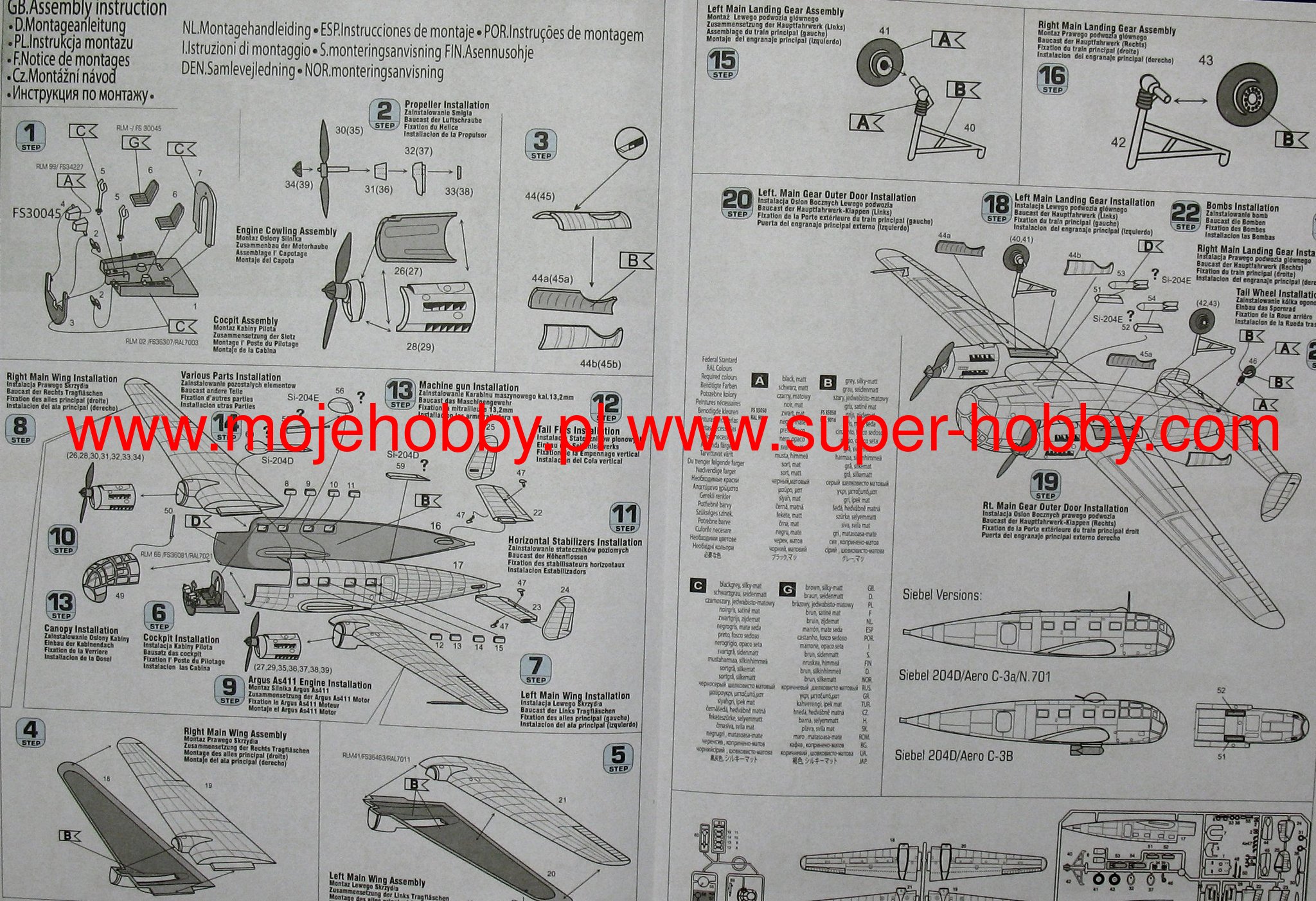 Note: Comany Mistercraft frequently changes, without any notice, the decals that come with the model, so they may differ from the photos and descriptions on our website. If you need a specific version, please let us know about that by entering the appropriate notice in the comments field when placing the order. The Siebel Si 204 is a German, twin-engine, multi-role, semi-shell aircraft, all-metal, low-wing design. The drive was made of two Argus As 410 engines with a maximum power of 360 HP. The single-spar wing was equipped with crocodile flaps powered by an electro-hydraulic mechanism. The shuttlecocks were covered with linen. The hull had a cross-section similar to a rectangle rounded at the top. The crew cabin with two seats was located at the front of the fuselage. A passenger cabin with eight seats was placed in the fuselage. The cabin entrance door was on the left side of the fuselage. The vertical tail was doubled, the rudder had horn compensation. The ballasts were covered with sheet metal, while the moving parts were covered with linen. The electro-hydraulic retractable landing gear was retracted to the rear in the engine nacelles. Siebel Si-204V1 was flown on May 23, 1941. The aircraft entered serial production with the designation Si-204A-1. A year later, the Si-204D version was tested, which received a new, fully glazed front with the crew cabin inscribed in the longitudinal contour of the fuselage. The aircraft was powered by two Argus As 411 engines with a take-off power of 580 KM, equipped with biplane propellers. These planes were used extensively in aviation schools. The machine took two members, five apprentices as well as special navigational or radar equipment and, if necessary, a small bomb load. These airplanes were mainly used for groundless pilot training, navigation, and also as a flying lecture hall for candidates for radio operators. The Si-204 V22, V23 prototypes and the Si-204E-O aircraft were equipped with a 01 131 dorsal shooting turret with a single 13mm MG 131 machine gun. These planes could carry a bomb load of up to 1000 kg on external hooks. It was also planned to start production of the Si-204D-3 variant with wings, vertical and horizontal tail of an all-wooden structure. The production of Si-204 aircraft was carried out by the SNCAC factory in France (168 in total, of which the Luftwaffe took over 147) and the Aero (515) and MBB (491) plants in the Protectorate of Bohemia and Moravia. Numerous Si-204 planes fell into the hands of the victorious Allies. Apart from the Soviet Union, Great Britain has acquired the greatest number of aircraft of this type. About twenty Si-204 aircraft were on the territory of Switzerland. In the Netherlands, the Si-204D aircraft served as a flying laboratory after the war. After the war, the production of Si-204D was continued by the Aero plant in Prague, which produced a total of 172 copies of these machines under the designation C-3 and C-103. SNCAC plants in France also continued production of the Si-204, the Si-204 aircraft were designated Nord NC-701, and the Si-2O4A Nord NC-702. Both types were called Martinet. French aircraft were equipped with Renault12S engines, which are the equivalent of Argus As 411 A1 engines with a three-blade, metal, self-adjusting Ratier propeller with a diameter of 2.65 m. In total, 350 copies of these aircraft were produced in France after the war. Air France used 31 Martinets, six NC702s were used to transport mail from late 1946, and six more machines in the air-photogrammetric version were used by the National Geographic Institute. Most of the Martinets, however, were taken over by the French military aviation, which used them as transport aircraft, among others in the fighting in Vietnam. Specifications: length: 13m, wingspan: 21.33m, height: 4.25m, maximum speed: 364km / h, climb speed: 6m / s, practical ceiling: 6400m, maximum range: 1400km.