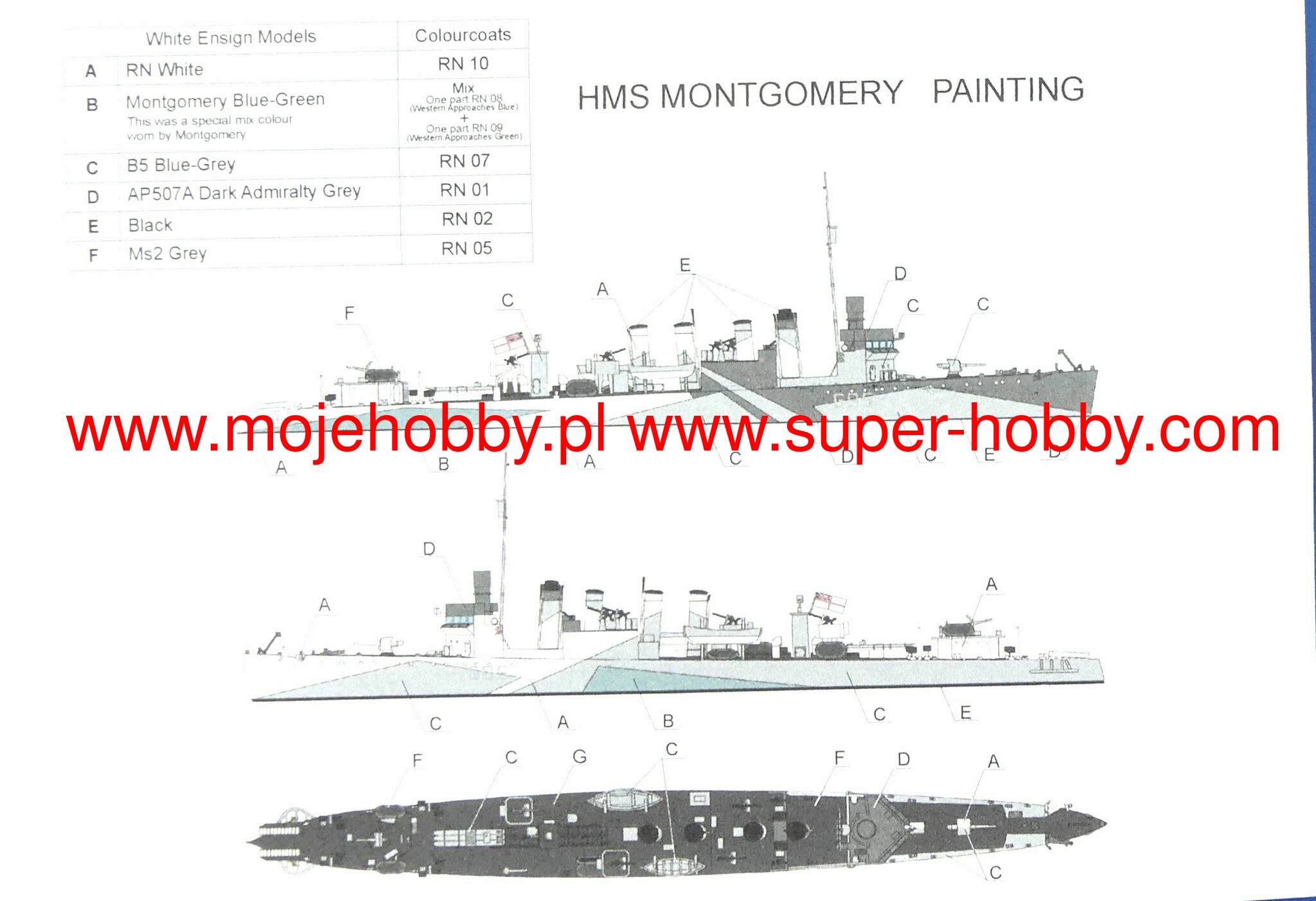 HMS Montgomery (G95)[inna nazwa: USS Wickes (DD-75)] was initially an American and then a British destroyer of World War I, the interwar period and World War II. The keel for this unit was laid in 1917, the launch took place in June 1918, and the entry into service with the US Navy - also in 1918. The total length of the ship at the time of launching was 95.8 meters and a width of 9.43 meters. The displacement reached approx. 1,250 tons, and the maximum speed reached approx. 35 knots. The armament at the time of launch consisted of four single 102 mm guns, a single 76 mm gun and four triple 533 mm torpedo tubes. The USS Wickes (DD-75) was the leading unit of the destroyer class of the same name, with a total of 111 ships. Destroyers of this type were designed primarily with the aim of achieving the highest possible speeds, but also in such a way that they could be produced on a large scale. Finally, a series of destroyers with four funnels (hence the often nickname "four-pipe") and a relatively simple structure of the superstructure and deck were created. The leading unit of this class, i.e. the USS Wickes (DD-75), took a very small part in World War I, and in 1922 it was placed in reserve, from where it returned to the line in 1930. She was returned to the reserve in 1937, but returned to the line after the outbreak of World War II. In 1940, the destroyer was handed over to the Royal Navy, where it changed its name to HMS Montgomery (G95). After reaching Great Britain, it was relatively quickly modernized and adapted to the role of an escort destroyer. In the years 1942-1943 he served as a convoy in the Atlantic, and in February 1944 he was assigned to the reserve of the British fleet. The unit was scrapped in 1945.