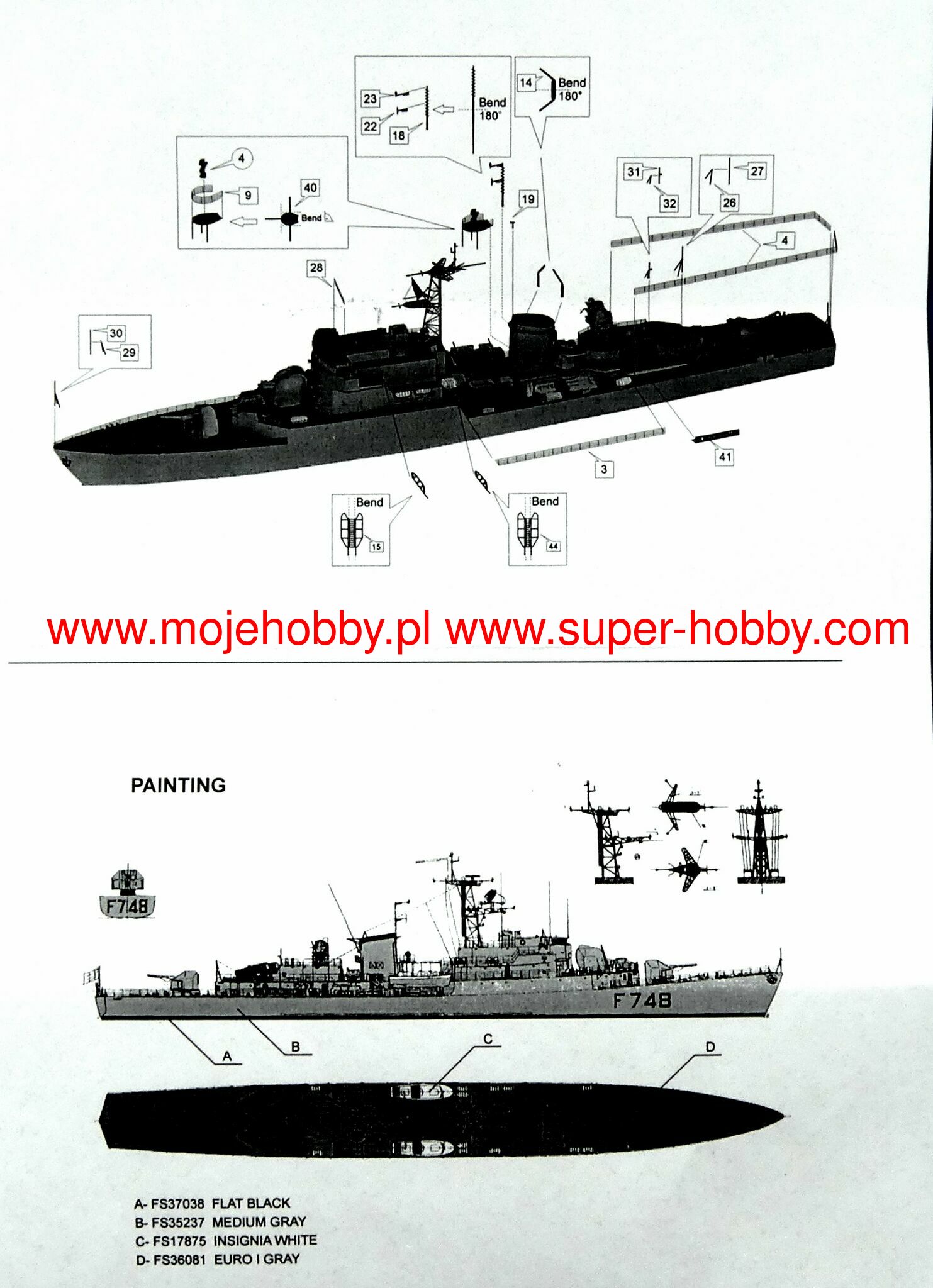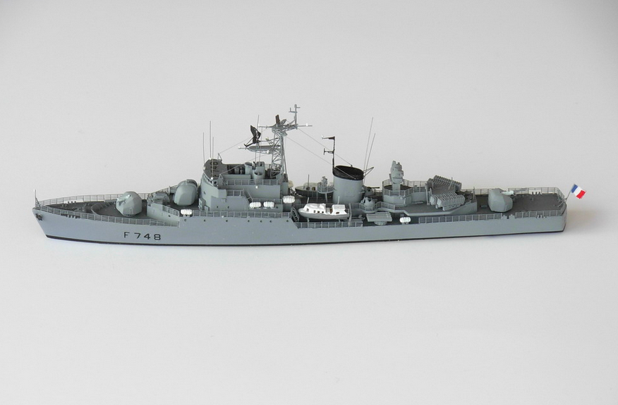 Protet (F748) is a French frigate (fr. sloop-escort) the keel was laid in September 1961, was launched in December 1962 and entered service with the Marine Nationale in 1964. The total length of the ship at the time of launching was 103 m, width 11.5 m, with a full displacement of about 2,200 tons. The maximum speed was up to 25 knots. At the beginning of the service, the unit was armed with: 3 100 mm guns, 2 30 mm anti-aircraft guns or 2 triple 550 mm torpedo tubes. The Protet (F748) was one of nine Commandant Riviere-class frigates. Units of this type were built as ships intended for peacetime patrol tasks and for escort tasks (especially convoy cover) in wartime. Compared to the previous frigates of a similar role - the Le Normand type - they were clearly larger, had stronger artillery weapons and a significantly increased swimming range. The Protet (F748) was built at the Arsenal de Lorient shipyard in Lorient, Brittany. The unit underwent a very active service, often sailing in African waters. In 1991, she was assigned to Djibouti, but did not take an active part in Operation Desert Storm. A year later (1992), the Protet frigate was decommissioned and sunk in 2001 as a target ship.