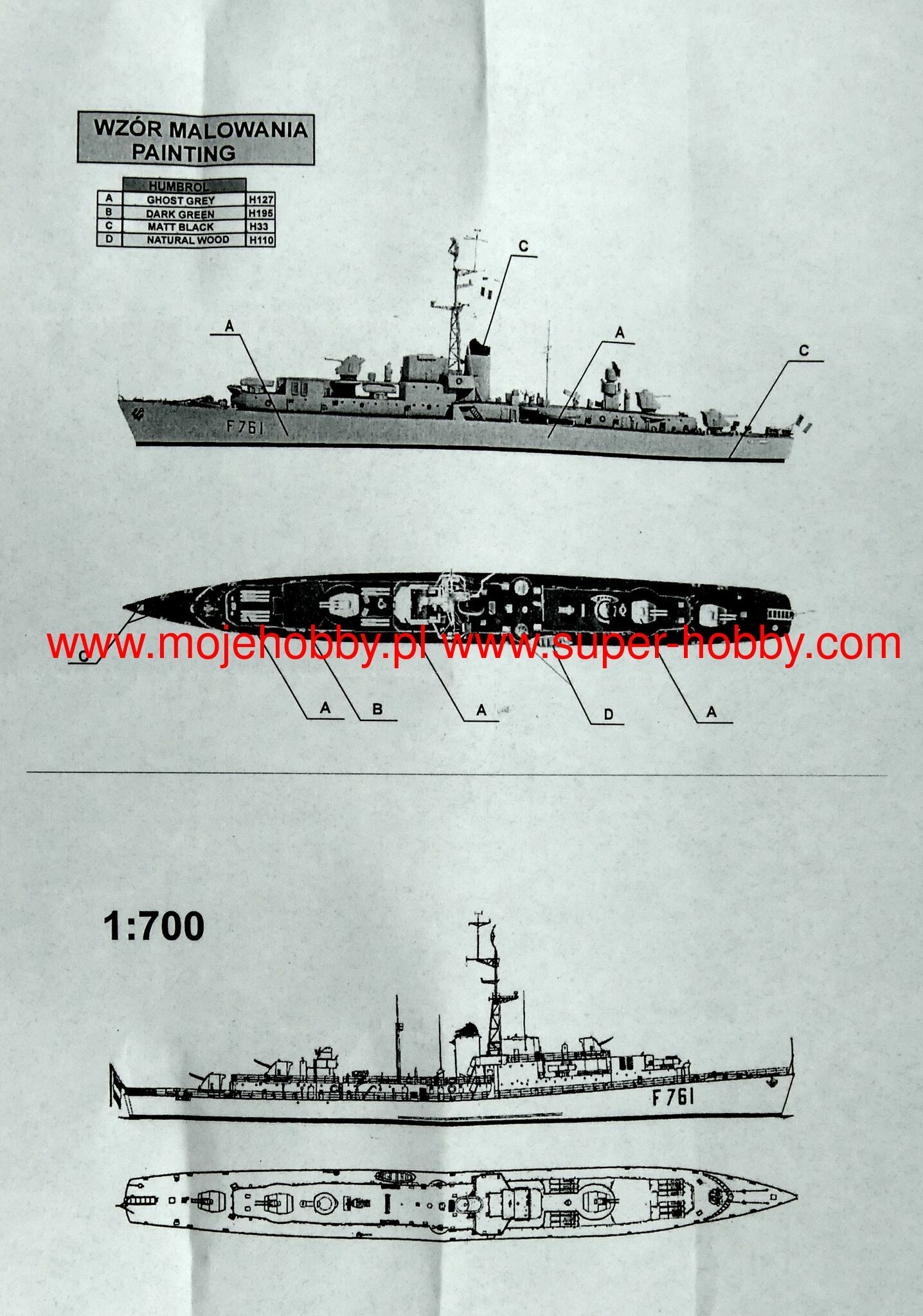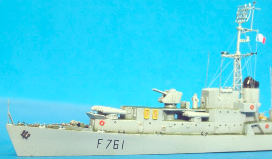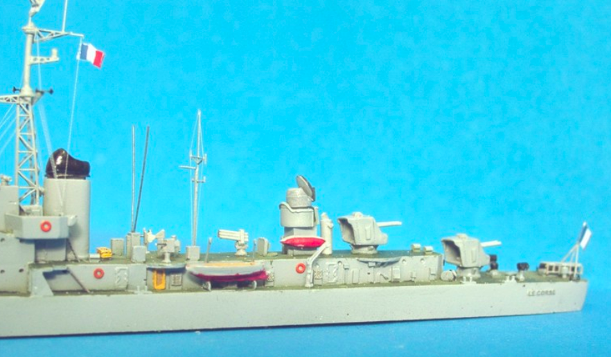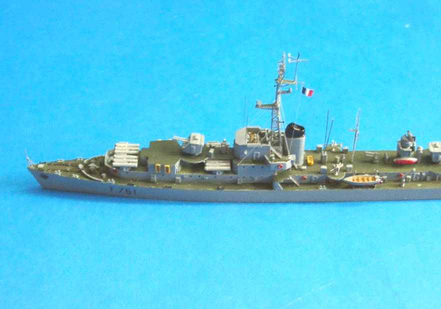 Le Corse (F761) is a French frigate (fr. escorteurs rapide) the keel was laid in March 1952, was launched in August of the same year, and entry into service with the Marine Nationale took place in 1955. The total length of the ship at the time of launching was 99.8 m, width 10.3 m, with a full displacement of approximately 1,700 tons. The maximum speed was 27 knots. At the beginning of service, the unit was armed with: 6 57mm guns, 2 20mm Oerlikon anti-aircraft guns or 4 triple 550mm torpedo tubes. Le Corse (F761) was the first of four frigates to belong to the class of the same name, the Le Corse. They were the first ships built in France after the end of World War II and were a kind of symbol of the rebuilding of the Marine Nationale after this military conflict. The ships were designed to perform primarily escort and convoy tasks. They received strong, for the 1950s, anti-aircraft armament and ZOP (anti-submarine warfare). The units were also distinguished by high maximum speed compared to other frigates and escort units. The Le Corse frigate (F761) was built at the Arsenal de Lorient shipyard in Lorient, Brittany. She remained in service until the early 1970s, and was destroyed as a target ship in 1975.