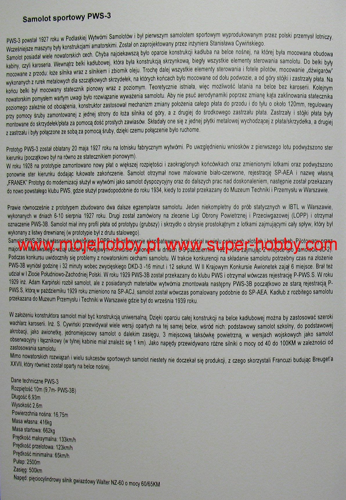 The PWS-3 was a Polish prototype sports and liaison plane with a wooden structure, in a high-wing configuration with a fixed landing gear, from the interwar period. The drive in the PWS-3B version was provided by a single Walter NZ-60 engine with a capacity of 60-65 HP. The first flight of this machine took place in 1927, but the plane did not enter mass production. PWS-3 was the first sports plane designed and built entirely from scratch by the Polish aviation industry after regaining independence in 1918. Its creator was Eng. Stanisław Cywiński. In the period 1927-1928, the plane took part in aviation competitions with some successes. It was also considered at that time as a potential new military aviation service and observation aircraft. However, in the end, probably after the first tests, it did not arouse further interest of the military. The machine never entered mass production, and in 1933 the fuselage of one of the prototypes went to the Museum of Industry and Technology in Warsaw.