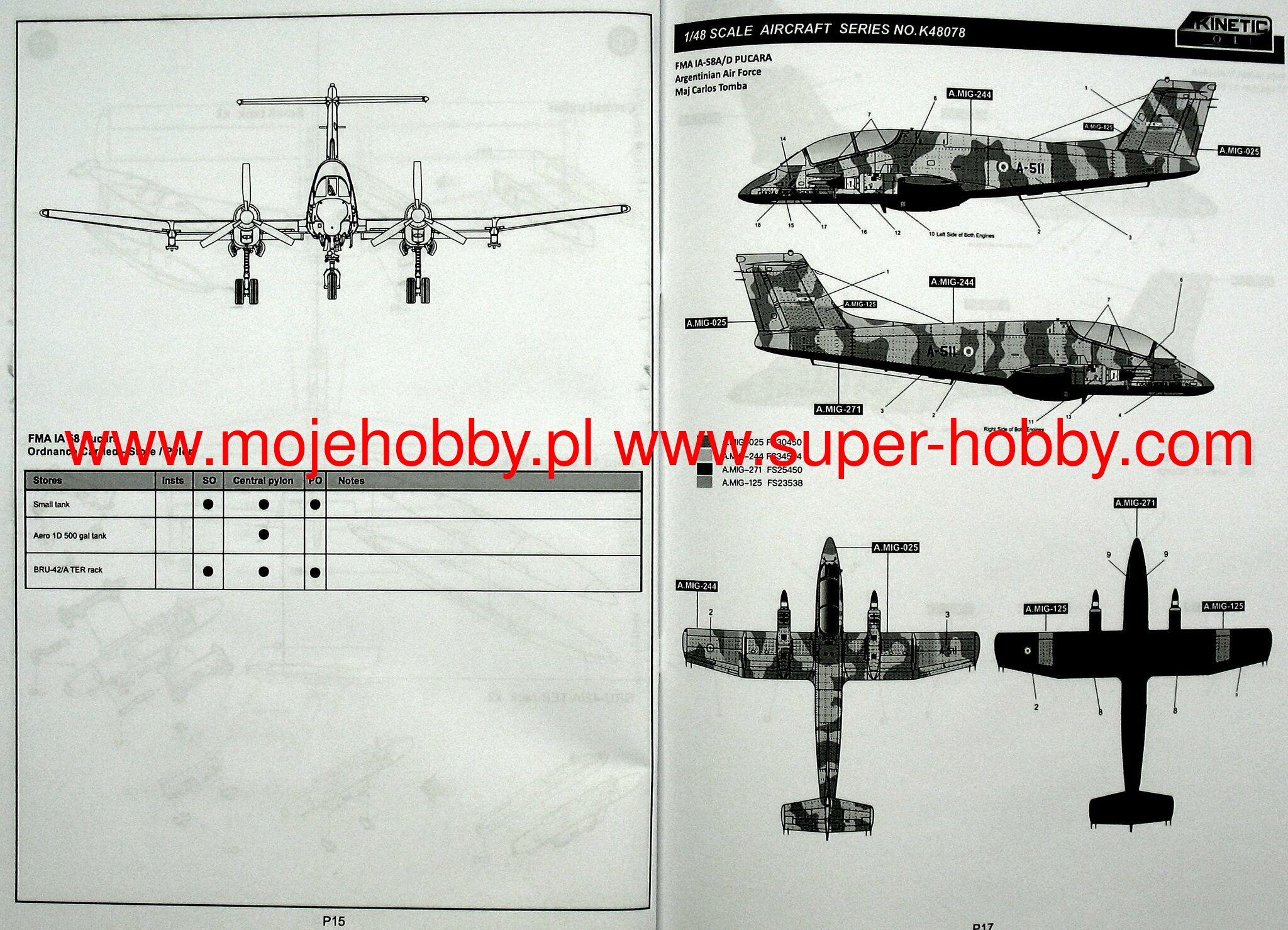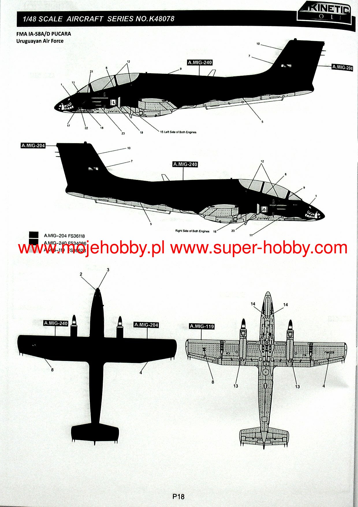The FMA IA-58 Pucara is an Argentinian twin-engine attack and anti-partisan aircraft in a metal low wing structure. The beginnings of the IA 58 Pucara date back to the mid-1960s. The first flight of the AX-2 Delfin prototype, powered by two Garett TPE331-U-303 turboprop engines, took place on August 20, 1969. The next prototype aircraft were equipped with French-made Turbo Meca Astazou XVIG engines. Pucara can operate from ground airports with very little ground handling. These assumptions proved correct during the war for the islands of the Falkland archipelago in 1982. The plane can fly at night, but due to the lack of an advanced targeting system, the combat capabilities drop drastically. The first flight of the production series (IA 58A) aircraft took place on November 8, 1974. Deliveries to the Argentine Air Force began a year later. The IA 58A is armed with two 20mm Hispano HS804 cannons with 270 rounds per cannon, and four 7.62mm FN Browning machine guns with 900 rounds per rifle. Additional weapons, including classic bombs, napalm tanks, 70mm unguided rocket pods, cannon pods and additional fuel tanks. The IA 58B model was equipped with a new avionics and two 30 mm cannons (instead of 20 mm). The first flight of the prototype took place on May 15, 1979. The aircraft was not put into production. The IA 58C is a single-seat version, armed with a 30mm DEFA553 cannon, capable of carrying Magic 2 air-to-air missiles, Martin Pescador air-to-water missiles. The modernized avionics includes a HUD display, ballistic computer, VLF navigation system, IFF identification system. Some IA 58As were rebuilt to IA 58C. The IA 58 was exported to Uruguay and Colombia. Technical data: length: 14.25m, wingspan: 14.4m, height: 5.36m, maximum speed: 520km / h, climb speed: 18m / s, practical ceiling: 1000m, maximum range: 1360km.