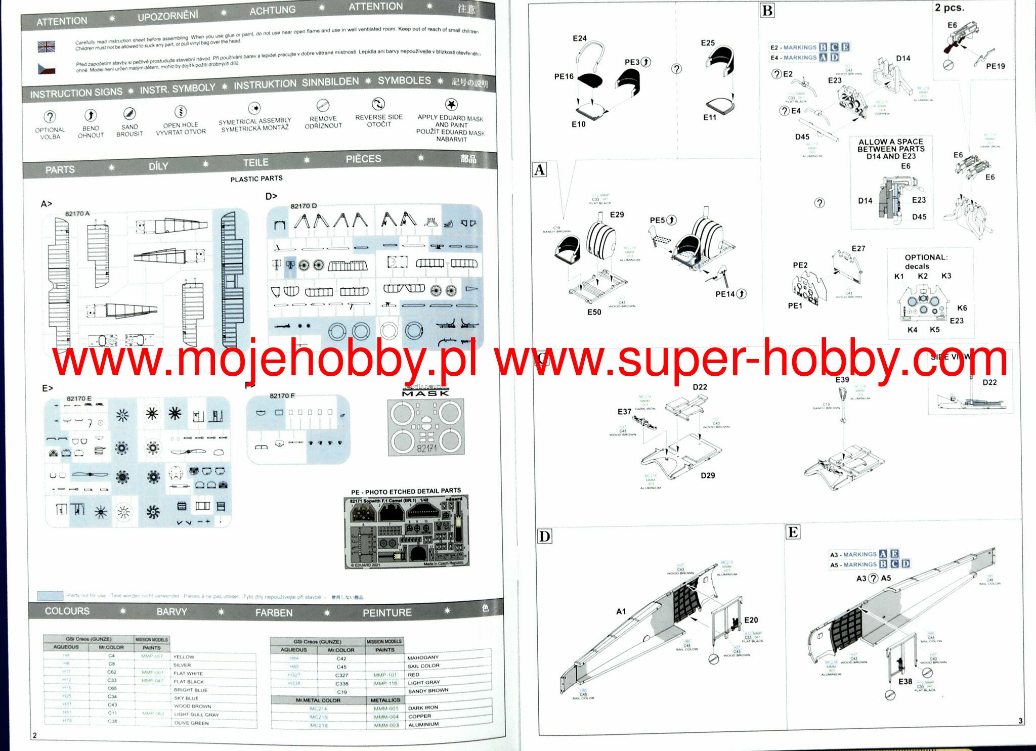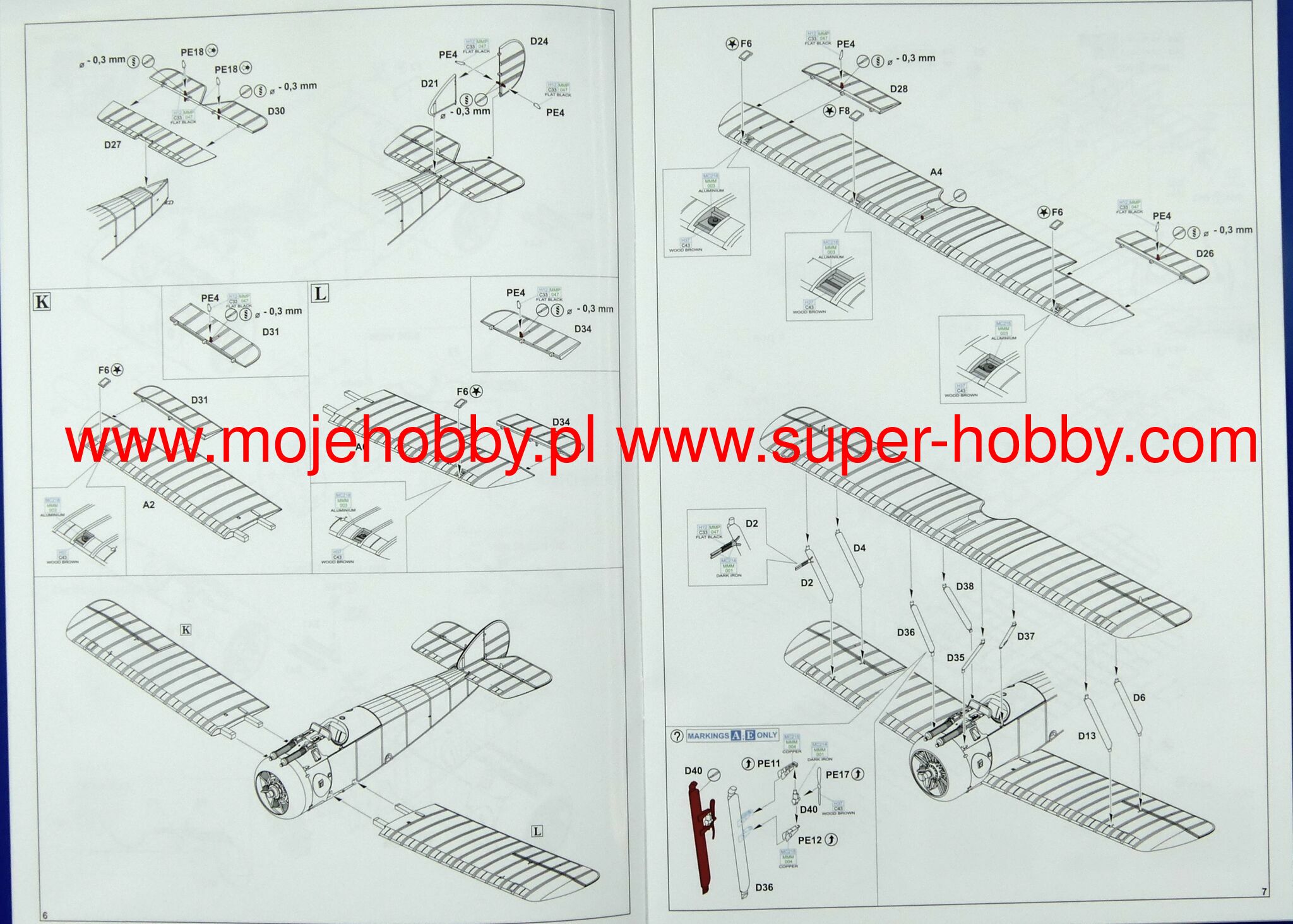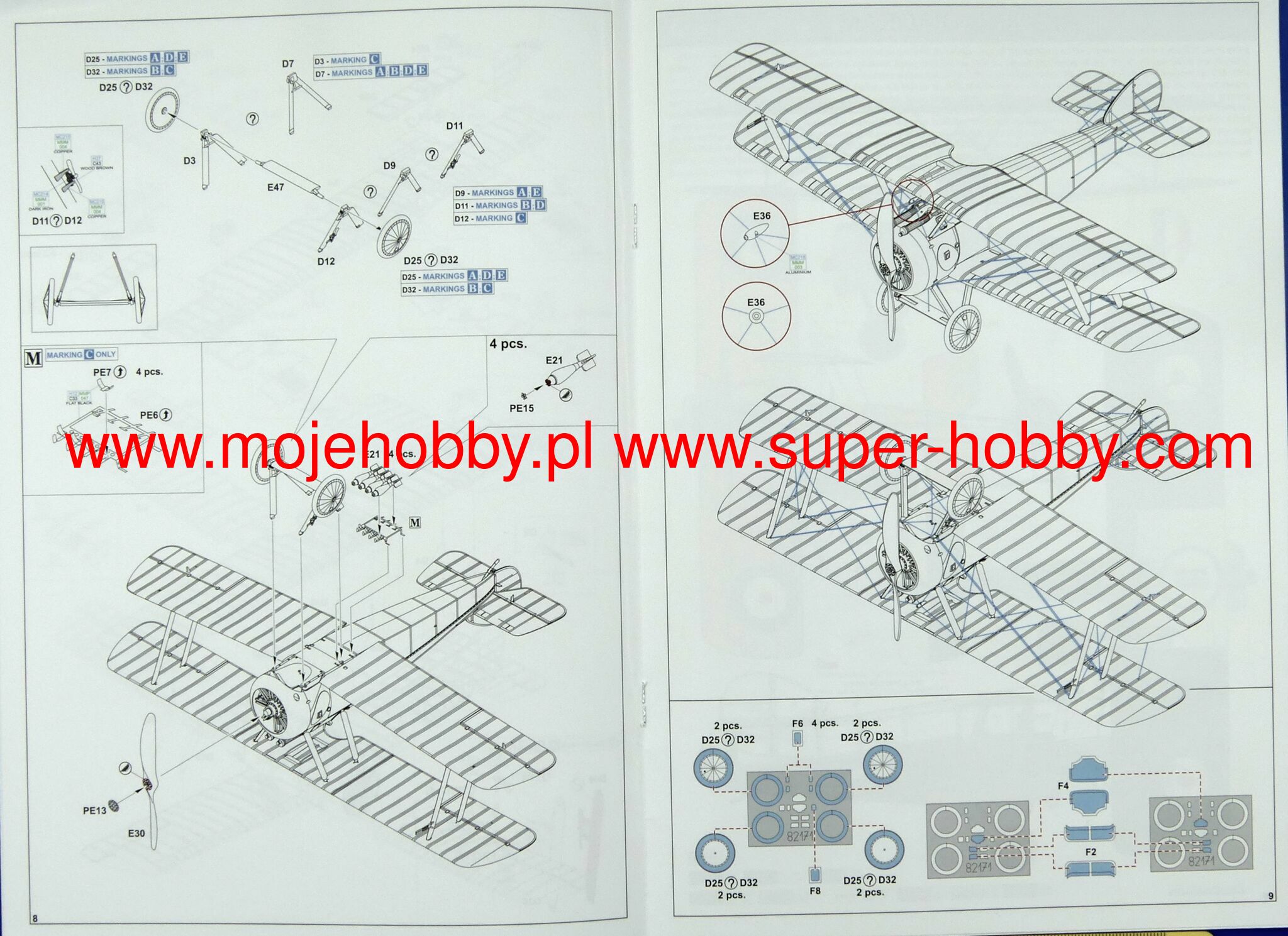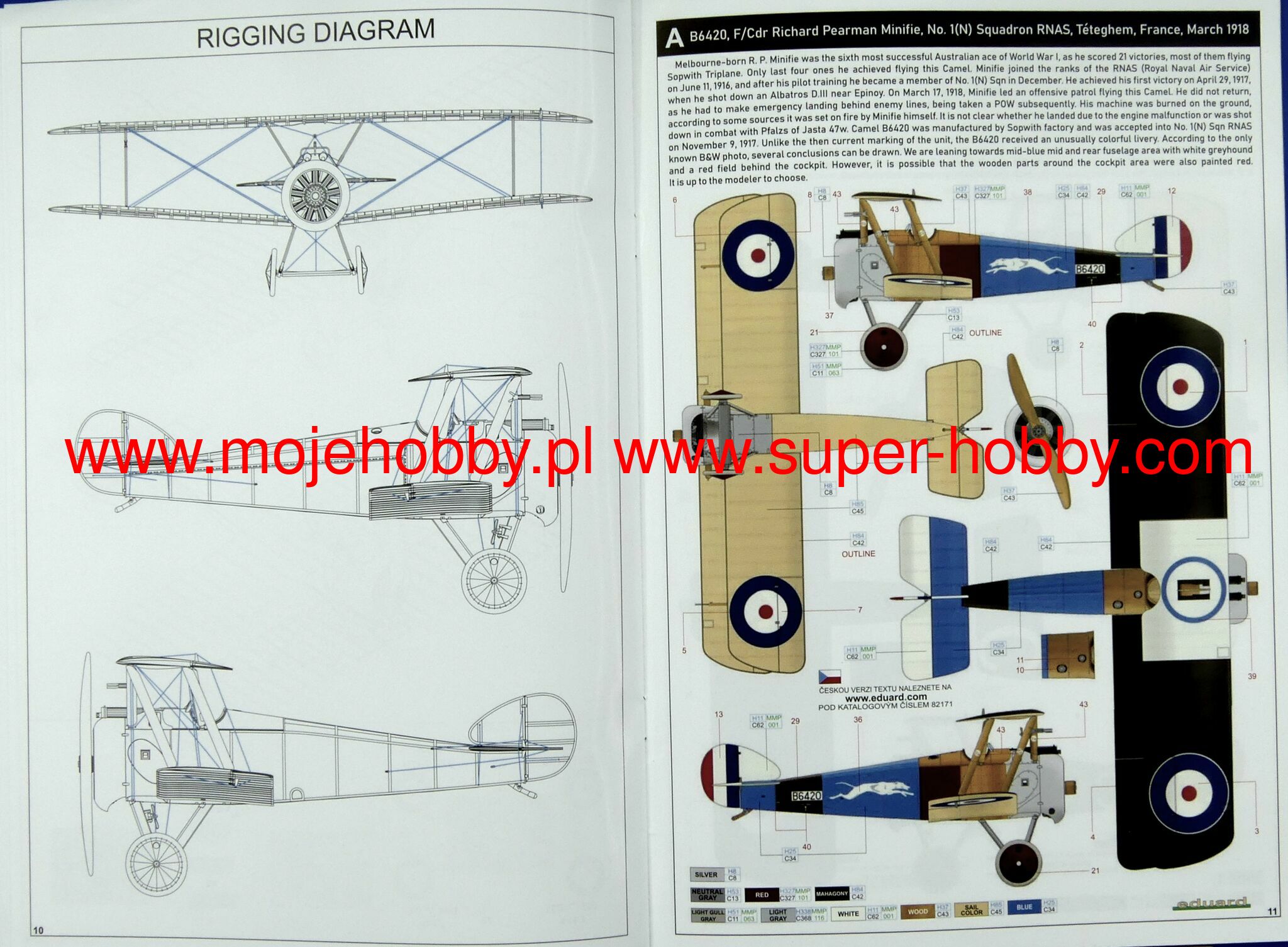 British fighter plane with a wooden structure, a Sopwith Camel biplane from the First World War. The camel owes its nickname to the "hump" in front of the pilot's cabin, which housed machine guns. The Camel was the successor to the successful Sopwith Pup fighter. The first flight of the prototype took place in December 1916, and deliveries to the front units began in the summer of 1917. The first serial batches required great abilities from the pilots and showed asymmetry of flight characteristics, unheard of in other Allied machines. With time, however, the Camel gained a reputation among pilots of a very maneuverable, solid machine with a decent rate of climb. He was a worthy rival to the German machines from the Albatros or Fokker factories. During the course of the war, several versions of the Camel were created. The most important of them are: F.1 - fighter, F.1.3 - night fighter, TF1 - trench fighter, 2F.1 - deck fighter. Thanks to the commencement of serial production by eight different aviation factories, it was possible to produce as many as 5,490 machines during the war. Technical data: Top speed: 185 km / h; climb speed 5.5 m / s, maximum ceiling 6400 m, armament: two 7.7mm Vickers machine guns, firing through a propeller. In the assault version, 7.7mm Lewis machine guns. 3_edu82171_instruction_sheet.pdf