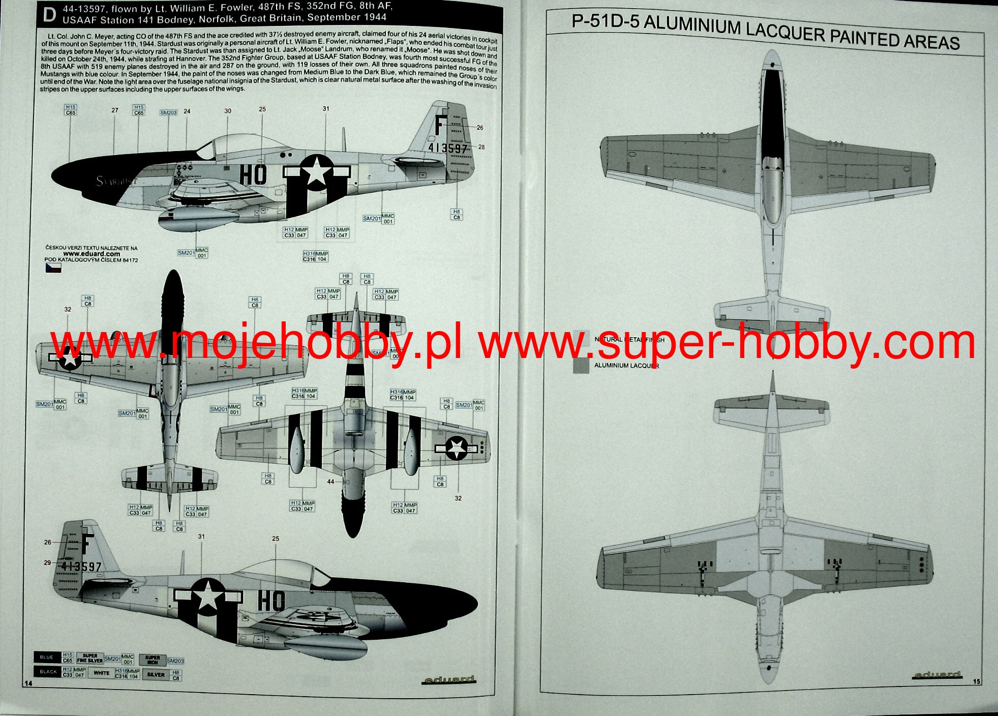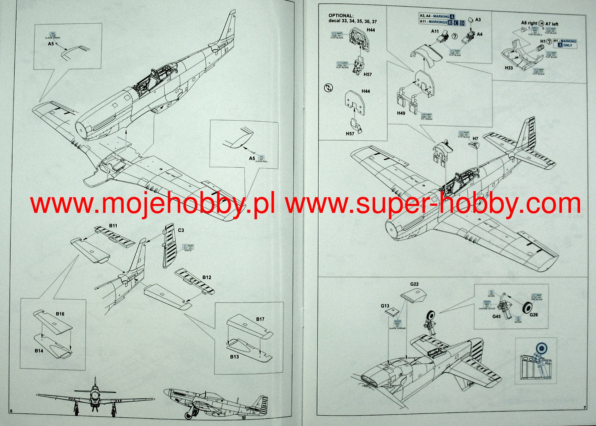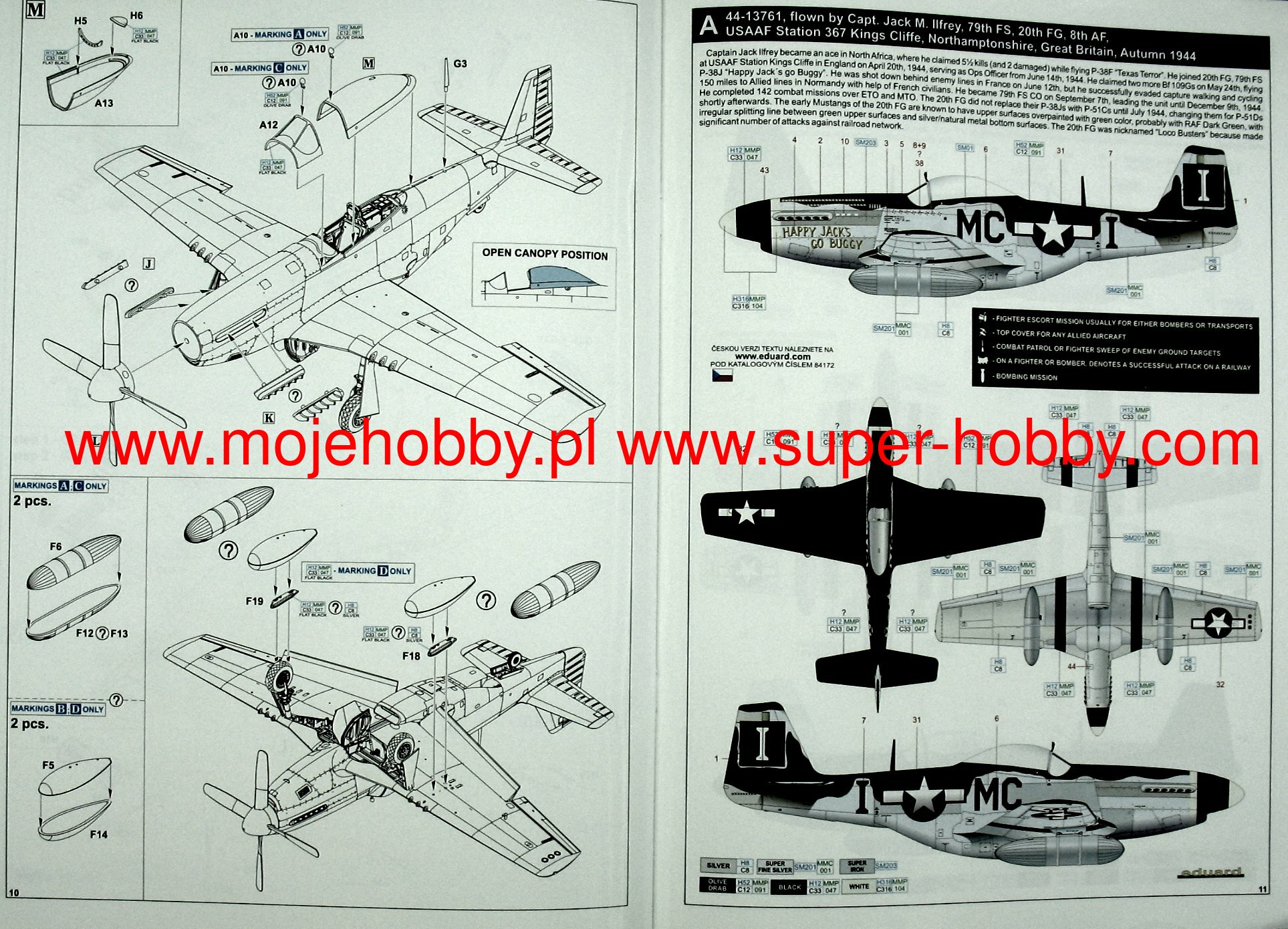 The North American P-51 Mustang is an American, single-engine, long-range fighter and attack aircraft with a classic tail and all-metal construction. The flight of the prototype took place on October 26, 1940. The P-51 Mustang has earned a reputation as one of the best, if not the best, WWII fighter. Replacing the Allison V-1710-39 engine from the first project with a Rolls-Royce Merlin motor (P-51 Mustang Mk.Ia version) made the Mustang, like never before, reached perfection. The single-seat fighter impressed with its maximum speed, range, maneuverability, and powerful weapons. The combination of all the most important parameters for the assessment of the aircraft made the Mustang prove itself in virtually every role entrusted to it: it gained air superiority, escorted, carried out reconnaissance missions, attacked ground targets. The class of design is evidenced by the fact that the Mustang remained in active service until the 70's! One of the most important versions was the P-51D, based on the P-51B. It received a drip cab fairing, ensuring excellent visibility, and a new engine - Packard V-1650-7, which significantly improved performance. Technical data (P-51D version): length: 9.83m, wingspan: 11.28m, height: 4.08m, maximum speed: 703km / h, rate of climb: 16.3m / s, maximum range: 2755km, ceiling practical: 12800m, armament: fixed - 6 12.7mm M2 machine guns, suspended - up to 908 kg of bombs or 10 127mm HVAR rocket launchers. 3_edu84172_instruction_sheet.pdf