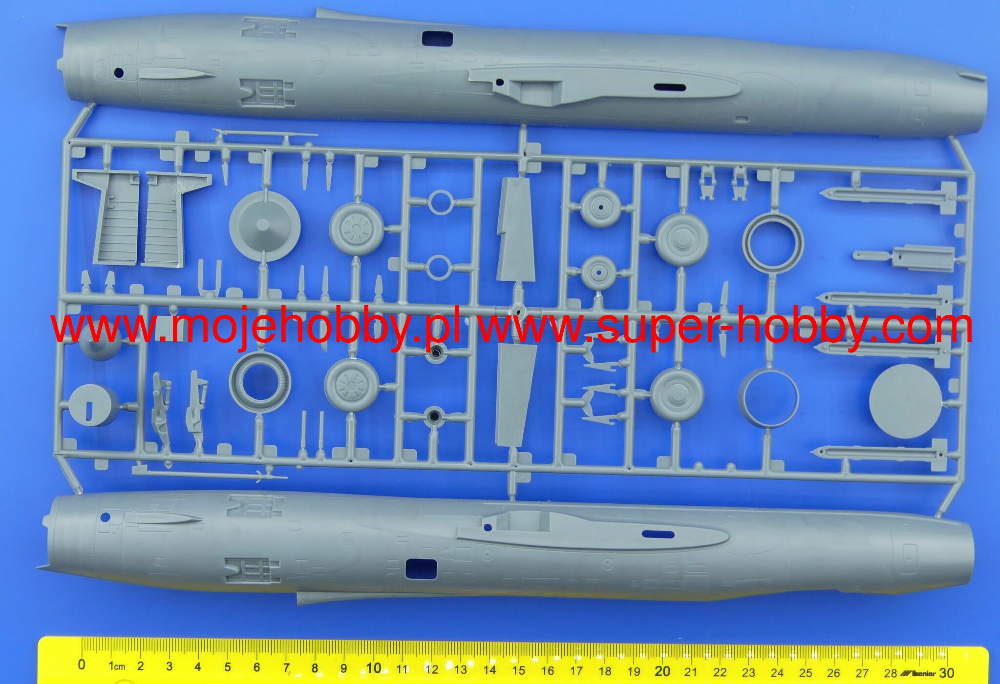 The Sukhoi Su-7 is a Soviet fighter-bomber with oblique wings, full metal structure with a classic tail. The drive was provided by a single Lulka AL-7F1 engine. The flight of the prototype took place on September 8, 1955. It entered the line in 1958. The first production version was the machine designated as Su-7, acting as a fighter plane. However, a very interesting tactical variant of the Su-7B quickly appeared. At the end of the years. 50, the Soviet command promoted the concept of "atomization" and "rocketization" of the battlefield. The main role of carrying atomic charges on the tactical battlefield was to be played by ground-to-ground missiles and barrel artillery, but for the elimination of particularly mobile cells (columns of troops) or requiring a precise strike (nuclear weapons of the enemy, secured command and communication stations), it was intended to be used as carrier of a high-speed supersonic plane. Due to the high speed, large payload, "strong" engine and the appropriate range, and equally importantly, the need to quickly put the machine into service (before the Su-7B, provisionally modified Mig-15 / -17 was used for this role), the choice fell on the Sukhoi design. In the mid-1960s, the plane was recommended for serial production of the Suchoja Su-7B, the first units left the production line in the second half of this year. Later, new versions were created, such as the Su-7BM, with additional rocket launch engines, the Su-7UB, i.e. a training version with a two-person cabin, or the Su-7BK or Su-7BKL versions. Technical data: length: 16.8m, wingspan: 8.77m, height: 4.8m, maximum speed: 1.6Ma, climb speed: 152m / s, practical ceiling: 15500m, maximum range: 1450km, armament: permanent- 2 NR-30 30mm cannons, suspended - up to 4000 kg of cargo on 4-6 under-wing pylons.