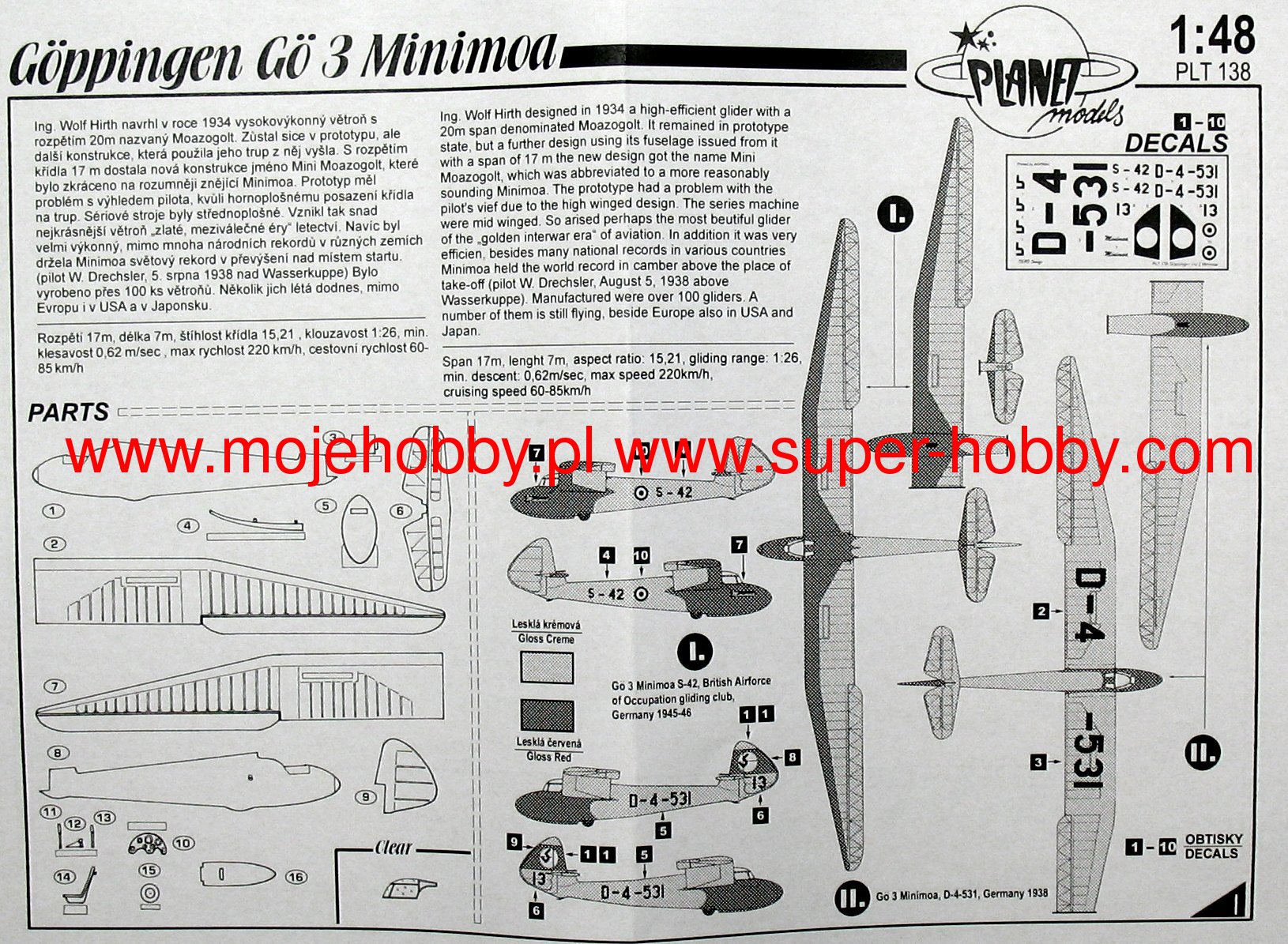 The Göppingen Gö 3 Minimoa was a German performance glider from the interwar period and World War II. The prototype flight took place in 1935. This aircraft had a dorsal wing configuration. It was 7 meters long with a wingspan of 17 meters. The take-off weight of the glider reached 350 kilograms, and the maximum speed was up to 290 km / h. The Göppingen Gö 3 Minimoa was designed by Martin Schempp and Wolf Hirt as the successor of the Göppingen Gö 1 glider. Compared to its predecessor, it not only differed in size, but also received a completely different shaped wings, which now received the rare so-called arrangement of gulls. Originally, the glider was designed as a high wing wing, but after the test flights, it was decided to use the back wing configuration. The Göppingen Gö 3 was considered to be one of the most beautiful gliders of the interwar period, but it was also a very successful glider, which, among others: the international altitude record in 1938. Gliders of this type were also sold on international markets, e.g. in the USA or Japan.