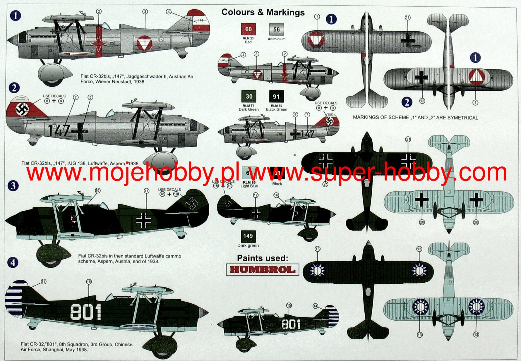 The Fiat CR.32 is an Italian metal biplane fighter. The flight of the prototype took place in April 1933. A year later, the plane entered service. The drive unit was a 600HP Fiat A30 RA-bis V12 engine. In 1934-1939 it was the most common fighter in the Regia Aeronautica. Fiat CR.32 gained the reputation of a solid and easy-to-pilot machine and proved itself perfectly during the Spanish Civil War (1936-1939), where it was one of the basic aircraft of General Franco's troops. One of the best pilots of this war - Joaquin Garcia Morato y Castano - flew it and achieved as many as 36 air victories. The plane was then exported to many countries, including to Austria, China, Paraguay and Hungary. Unfortunately, at the outbreak of World War II, the FIAT CR.32 was distanced by modern British, French or German constructions. As a result, the CR.32 was systematically moved from 1942 to training tasks and night combat flights. In total, over 1,300 aircraft of this type were built. Technical data: Maximum speed: 360 km / h, rate of climb: 9 m / s, maximum ceiling 8,800 m, maximum range: 781 km, armament: fixed-2 Breda-SAFAT machine guns cal. 7.7 or 12.7 mm, Suspended - up to 100 kg of bombs.