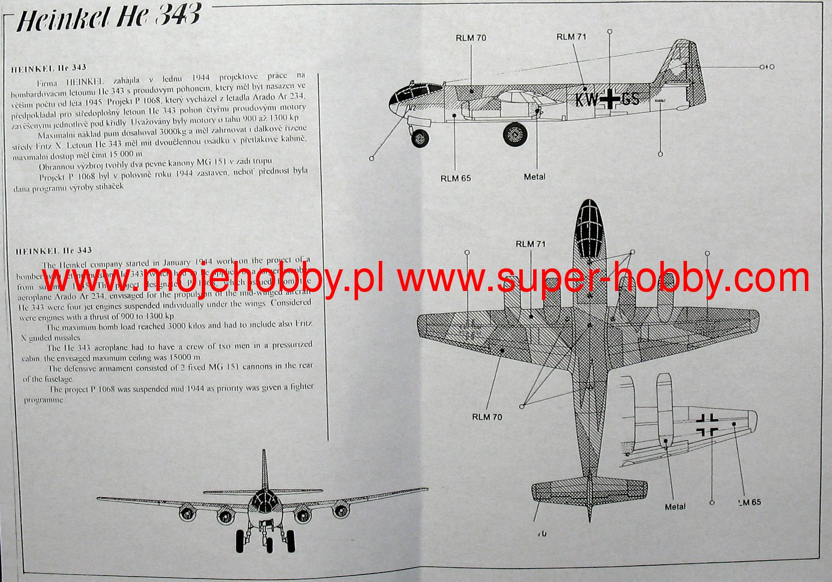 The Heinkel He 343 was a project of a German WWII bomber and fighter. The propulsion was likely to be provided by four jet engines Heinkel HeS 011 or Junkers Jumo 004. The deck armament was to consist of four 30mm Mk.108 cannons. The machine was supposed to be able to take up to 3,000 kg of bombs on board. The plane, however, has never been tested, nor has it entered mass production. The design work for the Heinkel He 343 has been largely based on the experience and lessons learned from the production and operation of the Arado Ar-234. It was planned to produce as many as four versions of this aircraft. The first one (designation: He 343 A-1) was to be a bomber. The second (He 343 A2) was planned as a recon vehicle, and finally the last two (He 343 A-3 and B) were planned as heavy jet fighters capable of fighting Allied strategic bombers. A preliminary order was placed for 20 copies of this aircraft, but in 1944 the order was canceled. Thus, the Heinkel He 343 project was never realized. It is worth noting, however, that he greatly contributed to the creation - after the end of World War II - of the Soviet Il-22 bomber project.
