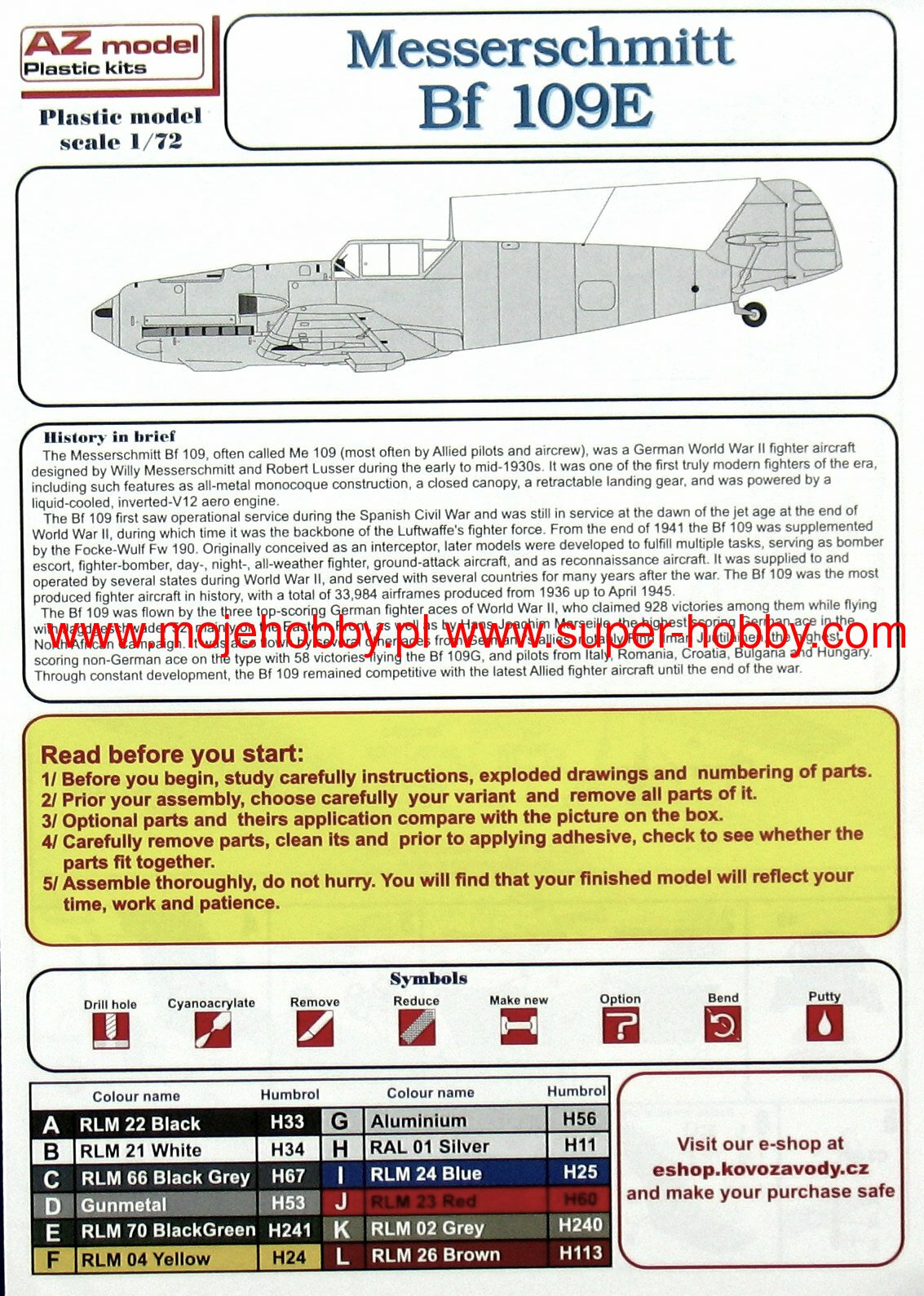 The Messerschmitt Bf-109 is a German metal-structure single-engine fighter in a low wing configuration with a classic tail. It turned out to be the basic and most produced Luftwaffe fighter during World War II. The flight of the prototype took place on May 29, 1935, and serial production continued in the years 1936-1945. In total, it is estimated that a total of about 35,000 Messerschmitt Bf-109 fighters of all varieties were produced, many of which ended up in the Czech and Israeli air forces after the war. The roots of the Bf-109 go back to the competition announced in 1933 by the Luftwaffe for a new fighter plane. In competition with the He-112, the Bf-109 project initially lost, but thanks to Willie Messerschmitt's intrigues, the project could continue and eventually he was the winner of the competition, becoming the Luftwaffe's primary fighter. Several main variants of the Bf-109 were developed in the course of production. The first pre-production series was the Bf-109B (Berta) with different versions of the Junkers Jumo 210 (A or Da) engine. They were tested in Spain from 1937 during the Civil War. The next version is the Bf-109C (Caesar). They had a different engine than the B version, and extensive armament consisting of two 20mm and 2 HP 7.92mm cannons. These machines also fought in the skies of Spain. The third version is the Bf-109D (Dora) with the Junkers Jumo 210 Da or Daimler-Benz DB 600 engine. It fought in the September campaign, but at the turn of 1939/1940 it was replaced by the E version. The most famous model was the Bf-109E (Emil) with a Daimler-Benz 601A or N engine. It was the first to use a three-blade, not a two-blade propeller. Bf-109E fought in the French campaign, over England, and in North Africa and on the Eastern Front. The ace who started his career on the Bf-109E was the famous Adolf Galland. The next version is the Bf-109F (Friedrich), which, according to the German pilots, was the most aerodynamically perfect. It sowed the changed shape of the fuselage, wings, cabin fairings, but no new engine was used. It was put into service at the turn of 1940/1941. As part of the development of the design, further Bf-109 specifications were developed, of which the G (Gustav) version was produced in the largest number of copies. The most important change increasing the machine's performance was the installation of a new 12-cylinder Daimler-Benz DB605A engine with 1475HP. The armament of the Bf-109G was a pair of 13mm machine guns located in the fuselage in front of the cockpit fairing, and the MG151 20mm or heavier MK108 30mm cannon. The last mass-produced version was the Bf-109K (Kurfirst), which production started in October 1944. A Daimler-Benz DB 605DB or DC unit was used as the engine. The Bf-109K was the fastest version produced during World War II, reaching up to 730 km / h. Apart from that, two versions were created - H and Z, but they were rather experimental versions and their mass production did not start. Subsequent improvements in propulsion and armament made the Messerschmitt Bf-109 one of the most dangerous fighters of World War II, and at the same time showed the great potential of the slightly angular airframe created by Willi Messerschmitt. Technical data (version Bf-109 G-6): length: 8.95 m, wingspan: 9.92 m, height: 2.6 m, maximum speed: 640 km / h, rate of climb: 17 m / s, maximum range: 850 km, maximum ceiling 12000m, armament: fixed - 2 MG131 13mm machine guns and 1 MG151 20mm cannon, suspended - 250 kg bombs, or 2 Wfr missile launchers. Gr. 21.
