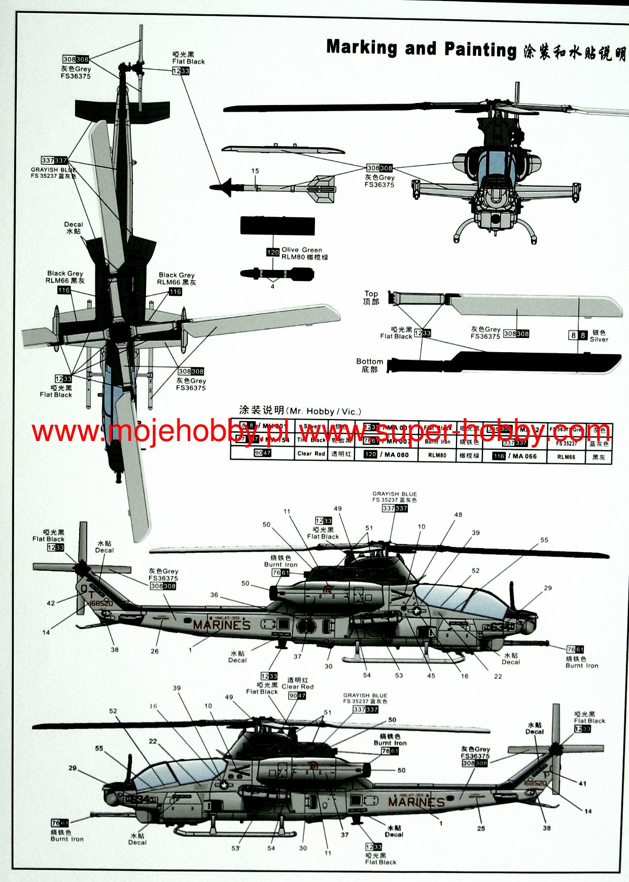 The AH-1 Cobra helicopter (Bell 209) is an attack helicopter in the classic layout, using many components of its "big brother" UH-1 Huey. The first flight of the AH-1 prototype took place on September 7, 1965 and the helicopter entered mass production in the same year. During the Vietnam War, 1,126 machines of the G model were produced, of which 279 were lost in combat. Due to the very high reliability of the structure, small side profile and good performance, the helicopter remains in service to this day in the US Marine Corps. The AH-1 allowed the US Army to fully implement the theoretical assumption of airmobile infantry ("air cavalry") through the fire support of landing infantry units. Today, the AH-1 Cobra is primarily used against an armored celon. From 1965, several versions of this successful helicopter were created, including: AH-1G (basic version), AH-1J (two-engine version), AH-1Q (version armed with TOW missiles). Technical data: Top speed: 333 km / h; maximum range (depending on version): 507-574km, armament: fixed-1 20mm M197 three-barrel cannon, slung rockets, guided missiles, unguided missiles and cannon pods.