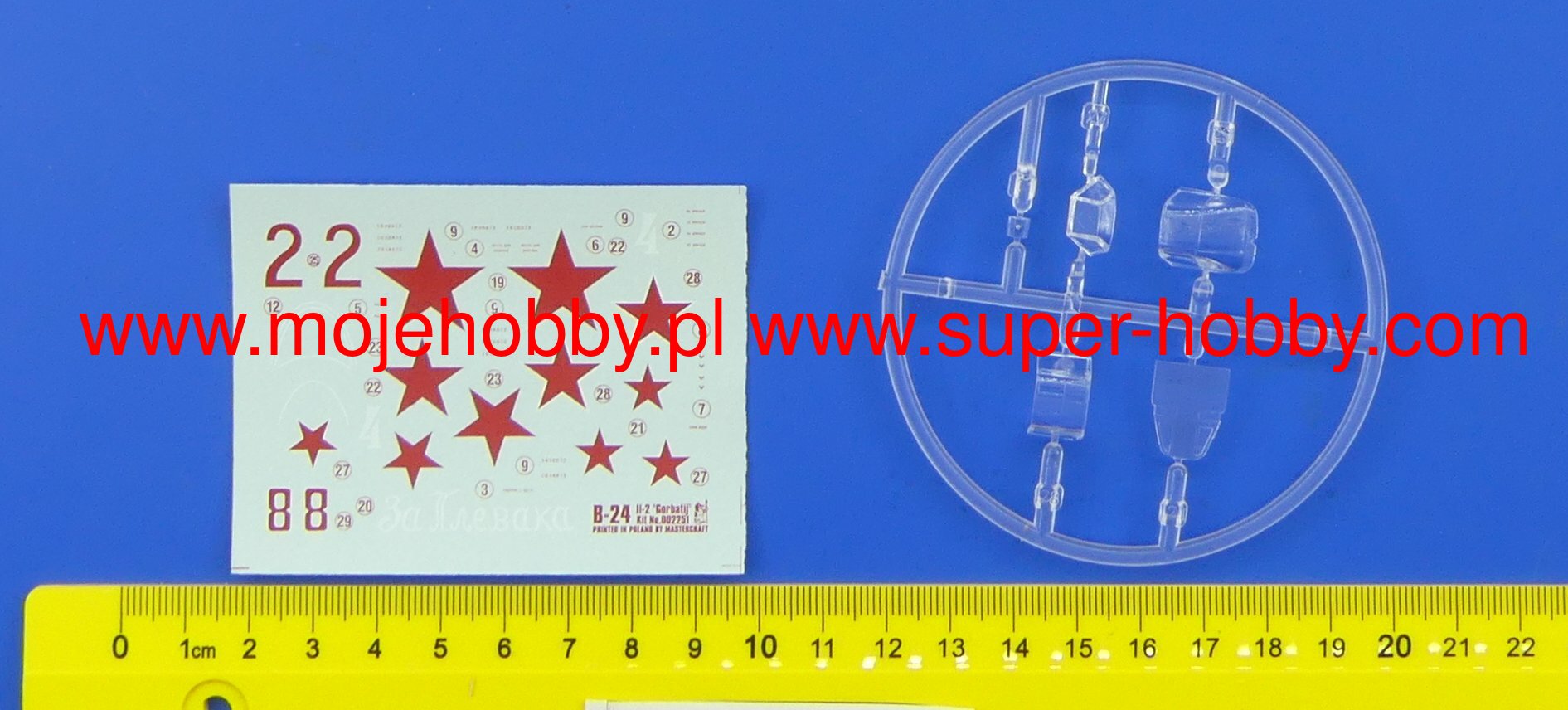 Note: Comany Mistercraft frequently changes, without any notice, the decals that come with the model, so they may differ from the photos and descriptions on our website. If you need a specific version, please let us know about that by entering the appropriate notice in the comments field when placing the order. The Ilyushin Il-2 is a Soviet, single-engine low-wing and mixed structure attack aircraft with a classic tail, designed by Sergei Ilyushin from the Second World War. The flight of the prototype took place on October 2, 1939, and serial production started in 1940 and lasted until 1945. In total, as many as 36,183 copies of this great plane were created. The power unit was a 12-cylinder Mikulin AM-38 piston engine with a power of up to 1600 HP. The concept of the Il-2 aircraft was based on the desire to create a heavily armed and heavily armored attack aircraft designed to destroy the enemy's land targets and his armored vehicles. The airplanes produced in series had armor from 4 to 6mm around the engine and cockpit. The Il-2 was therefore resistant to small arms fire as well as to single hits with 20mm cannons. After improving the quality of crew training and applying new tactics, the Il-2 became an aircraft capable of wreaking havoc among the German Panzewaffe. It is no coincidence that the Germans gave him the nickname "flying death", and the designer nicknamed him "flying tank". During the war, a dozen or so versions of Ił-2 were created, the most important of which is Ił2m3. Its crew consisted of two people - a pilot and a rear gunner, the Mikulin AM-38F (1700 KM) unit was used as the engine and a self-sealing fuel tank was introduced. The aerodynamic properties were also improved. In total, 7377 machines of this version were built by 1944. Il-2 took part in all major battles on the Eastern Front - from Moscow (1941) through Stalingrad and Kursk (1942/1943), until the Berlin Operation in 1945. Technical data (version Ił-2 mod.1942): length: 11.65m, wingspan: 14.6m, maximum speed: 426km / h, practical range: 740km, practical ceiling 6200m, armament: permanent - 2 WJ cannons cal. 23mm, 2 x 7.62mm SzKAS machine guns, underslung-8 RS-82 / RS-132 unguided missiles, up to 400 kg of bombs.
