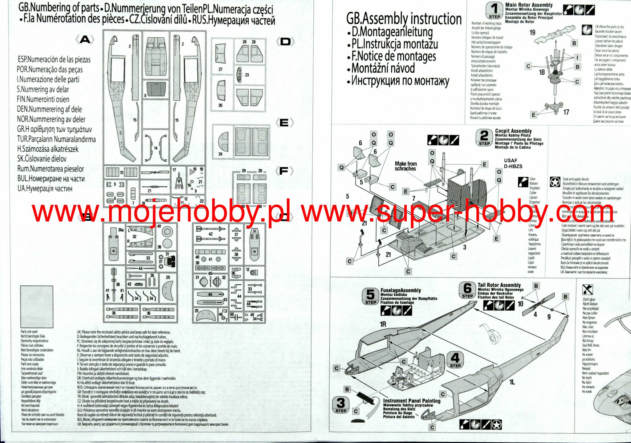 Note: Comany Mistercraft frequently changes, without any notice, the decals that come with the model, so they may differ from the photos and descriptions on our website. If you need a specific version, please let us know about that by entering the appropriate notice in the comments field when placing the order. Bell UH-1 Iroquois (commonly known as Huey) is a multirole helicopter of American production from the Cold War and modern times. The flight of the prototype took place in 1956, and the machine entered service in 1959. The helicopter - in the UH-1D version - has a total length of 17.4 m, and the diameter of its main rotor is 14.6 meters. The drive is provided by a single 1100 HP Lycoming T-53-L-11 engine. Its maximum speed in horizontal flight reaches 220 km / h. The helicopter has a classic layout with a single main rotor and a propeller on the tail boom. Work on the Bell UH-1 machine, commonly known as the Huey, started in the early 1950s, when the US Army reported a need for a new transport, medical evacuation (MEDAVAC) and multi-role helicopter. The emphasis is on the simplest and classic design as well as high reliability. Bell UH-1 helicopters performed very well during the Vietnam War (1964 / 1965-1975), where they underwent their baptism of fire. Due to their indiscriminate use in this conflict, they have almost become a symbol of this war. In the course of production, many development versions of this helicopter were created, among which the following can be indicated: UH-1 C (version adapted to take small arms and unguided rockets and with a more powerful engine compared to versions A and B), UH-1 D ( basic, transport, production version) or UH-1H (an improved D version with a more powerful drive unit). It is worth noting that the UH-1Y Venom version was also created, but due to the number of upgrades and improvements, it should rather be viewed as a separate helicopter model. The Bell UH-1 helicopter has gained enormous popularity and in various versions has been or is still operated by countries such as: Argentina, Brazil, Bolivia, Chile, Georgia, Japan, Germany and Italy.